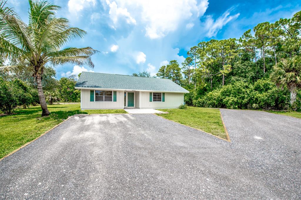 Introducing a beautifully renovated 3/2 in the desirable acreage. This house is a MUST SEE! The pictures speak for themselves. Lots of land (1.25 acre), new driveway leading to both main house and detached two car garage/workshop. Complete renovation in 2018 with new garage door, flooring, bathrooms, water heater, paint inside and out, driveway and front brick paver patio and more. The kitchen has granite counter tops, an island with stove, and double oven. Brand new flooring throughout entire house. Vaulted ceilings and wet bar in main living area. A closet can be easily added to the third bedroom (Dim. 14x10). If privacy is what you are looking for, look no further. Large oak trees/landscaping on both sides, canal views from the back, and a long extended driveway. Professional dog kennel
