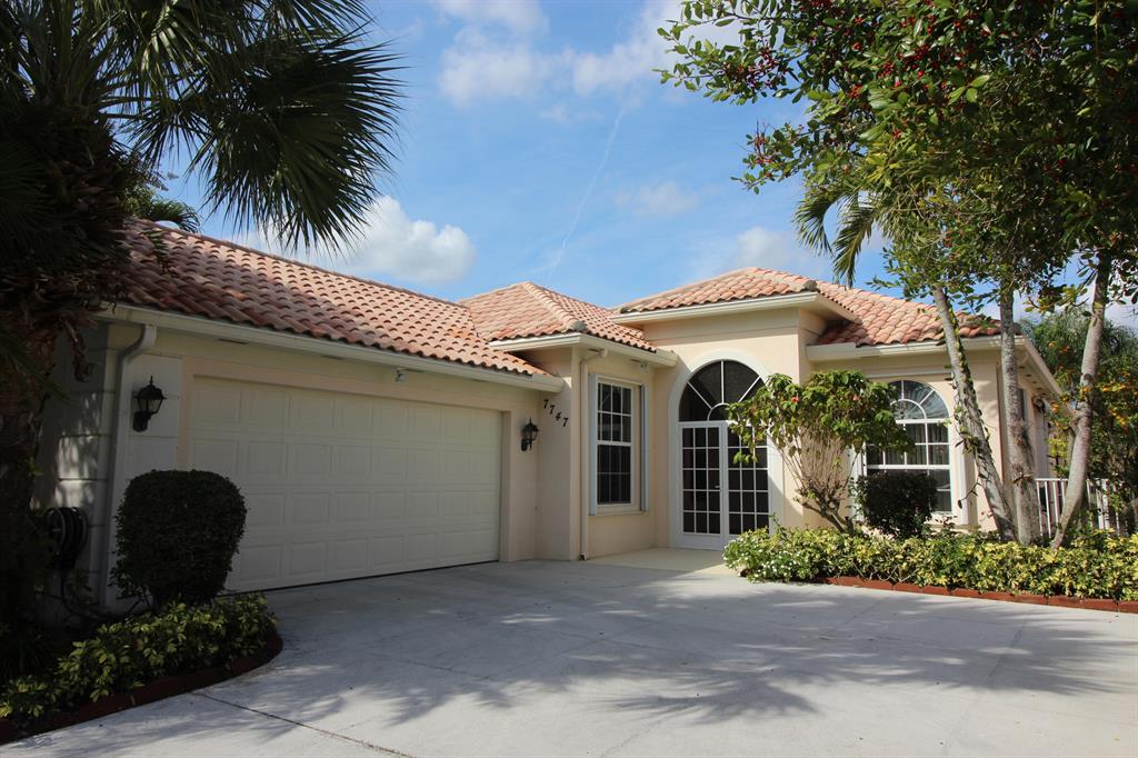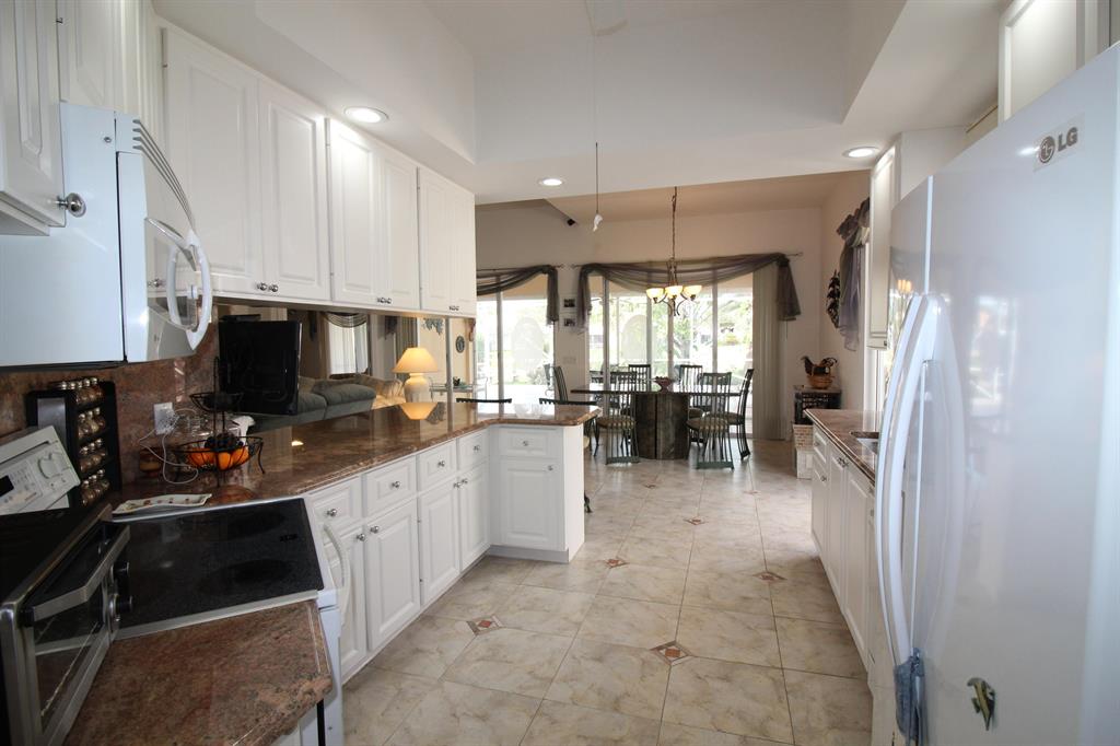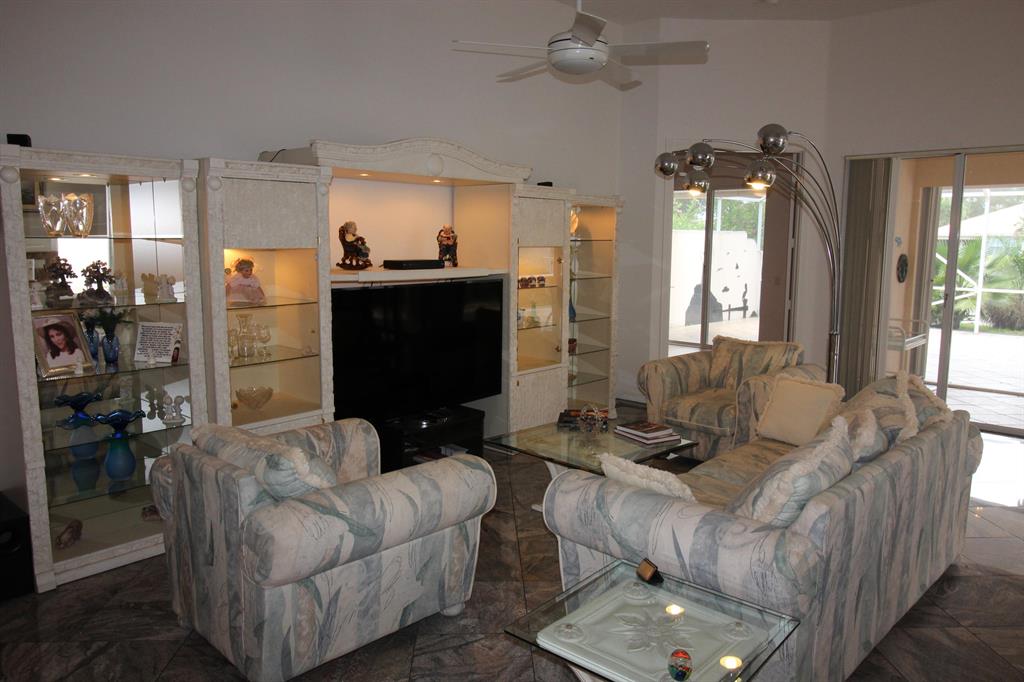 Outstanding value for this pristine ''Oakmont'' model. The house features a magnificent screened patio which is partially covered, perfect for outdoor entertaining! The patio is completely tiled and has some built in cabinetry and a custom tiled mural. The Great room has 12ft ceilings, double sliders that pocket back leading to the patio, stunning custom marble flooring in the living room and laminate flooring in the den and master bedroom. Granite kitchen counters, accordion shutters, and many other decorative touches! The master bathroom has a unique double set up, one side has a vanity and shower and the other a vanity and roman tub! The side yard has been beautified with marble touches and an awning over the side patio, the perfect spot for a barbeque! Another attractive featu