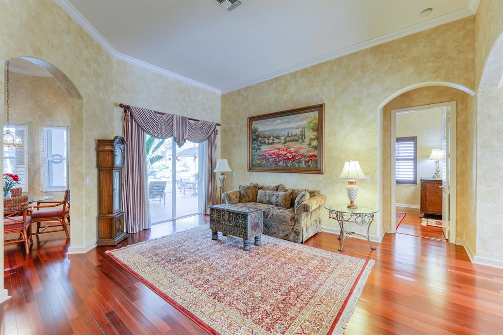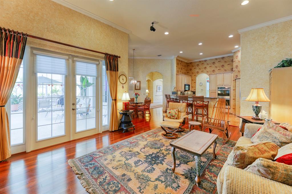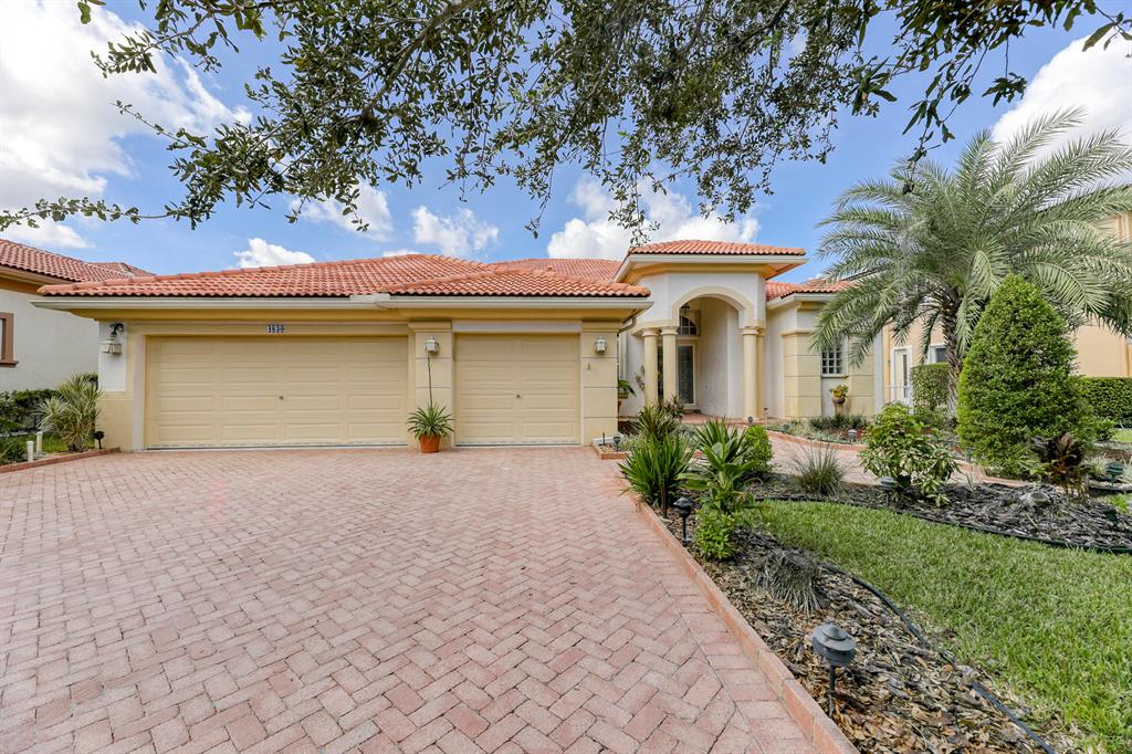 Fabulous waterfront single family pool home located on an amazing lake with expansive water views. As soon as you walk through the front door you are faced with panoramic views of the large lake & resort style solar heated pool. House features a 3 way split floor plan with 4 bedrooms & 3 full bathrooms, attached 2 1/2 car garage, large family room attached to the kitchen, breakfast area & hurricane protection throughout. NO carpet in this home travertine marble & real wood throughout. Kitchen features newer appliances, double oven, snack bar, eat in area & large pantry. Pride of ownership is apparent in this home. Community has an unmanned gated entry & maintenance includes alarm monitoring.