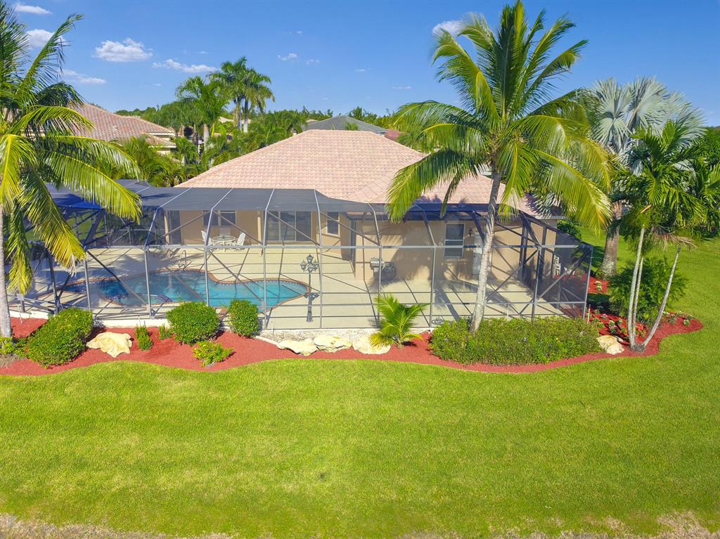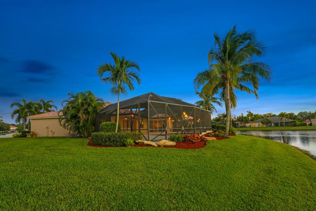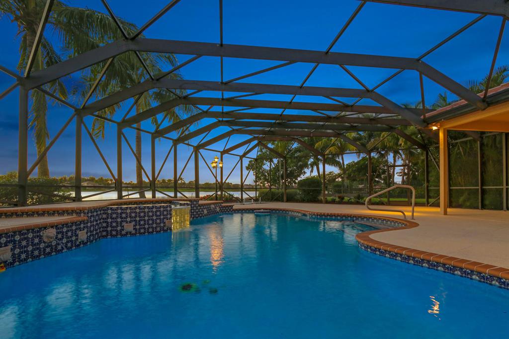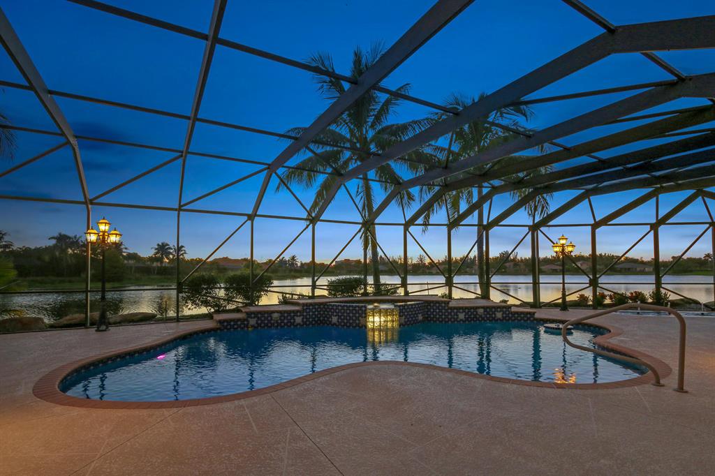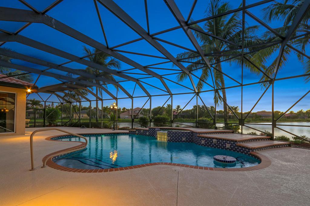 Beautiful 4 bedroom + office, 3 bathroom home with a large 3 car garage on a prime waterfront lot. Stunning panoramic lake views from thru-out the home with a screened lanai area and pool. Just wait until you see the gorgeous sunsets from your patio! The spacious one-story home features tile flooring thru-out the living areas, formal dining area, large family room room and split bedroom floor-plan. You will absolutely love the lake views from the 2,185 sq ft screen enclosure! Gorgeous .35 acre cul-de-sac lot. Other recent upgrades include: Roof replaced in 2006, Exterior house painted in 2018, A/C replaced in 2016, and irrigation is from the lake. Fantastic gated community with excellent schools nearby and just a short distance to Wellington Green Mall.