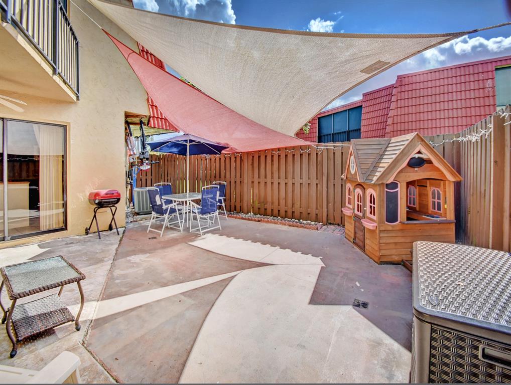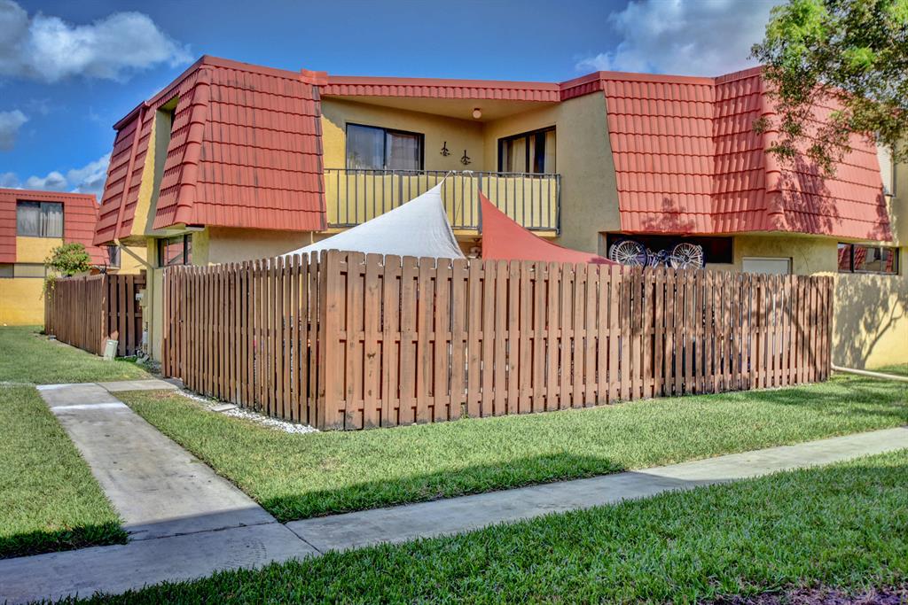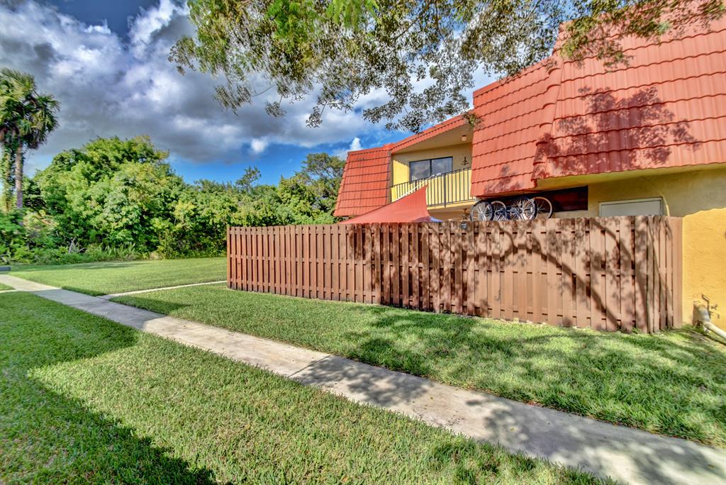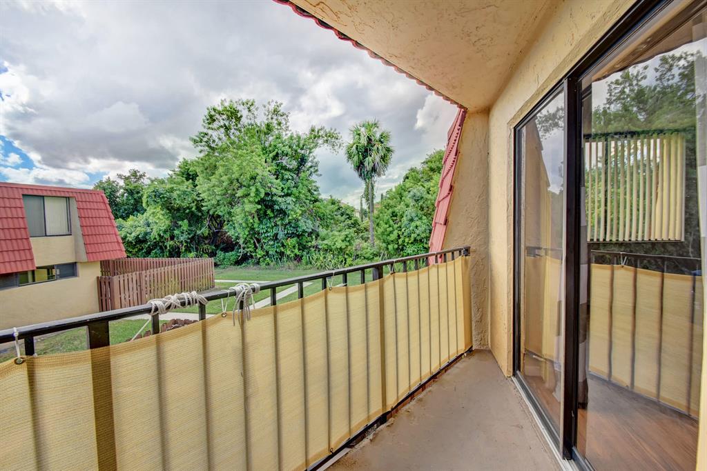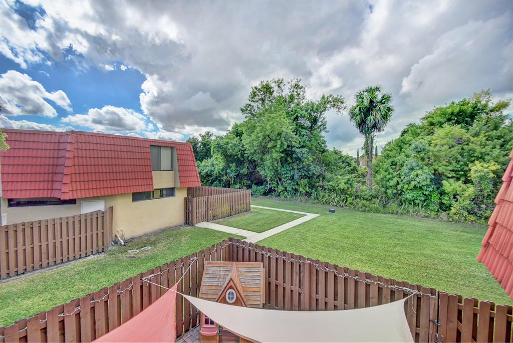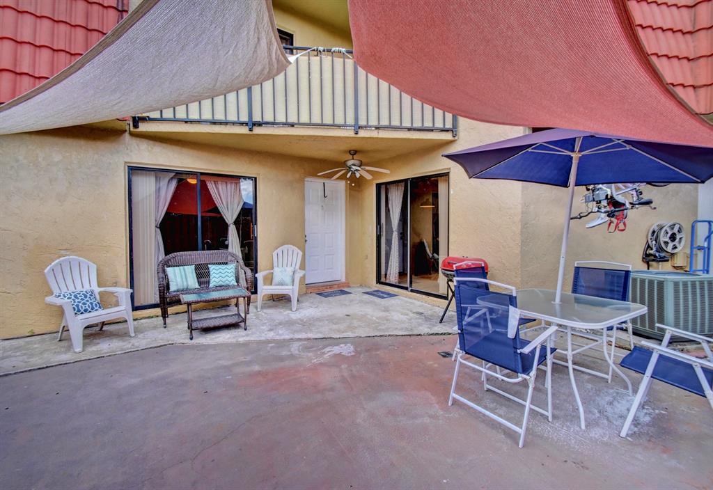Tucked away, quiet 2 bedroom/2.5 bath Townhome with terrific flow and light in FAMILY AND PET FRIENDLY neighborhood. Private, fenced courtyard patio with UV protection sail shades; large, off-the-beaten track grassy area next to Townhome with woodsy views. Lake is steps away. Neutral tile on first floor; laminate in both bedrooms. Open kitchen (upgraded cabinets and countertop) with separate eating area; downstairs guest bathroom; walk in closets.Each bedroom has its own bathroom and shares a Juliet balcony (with patio weave privacy screen) offers great views; Community pool, tennis and racquetball. Low HOA. Great central location with EZ access to Turnpike, I95, Town Center Mall, beaches, shops and restaurants. 'A' rated schools and walking distance to the elementary school.