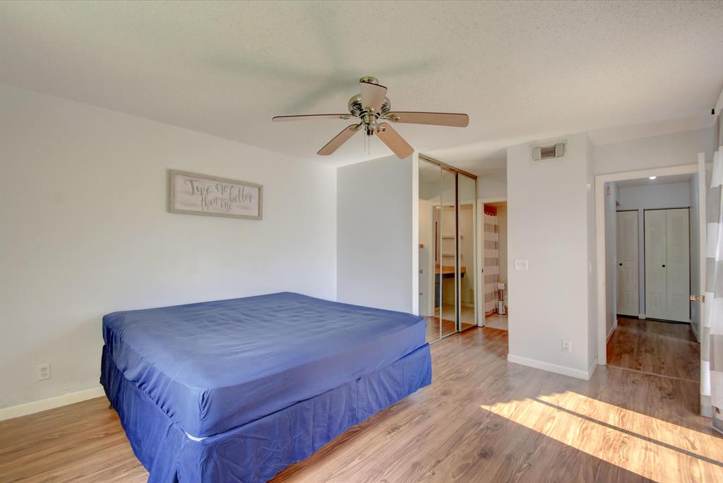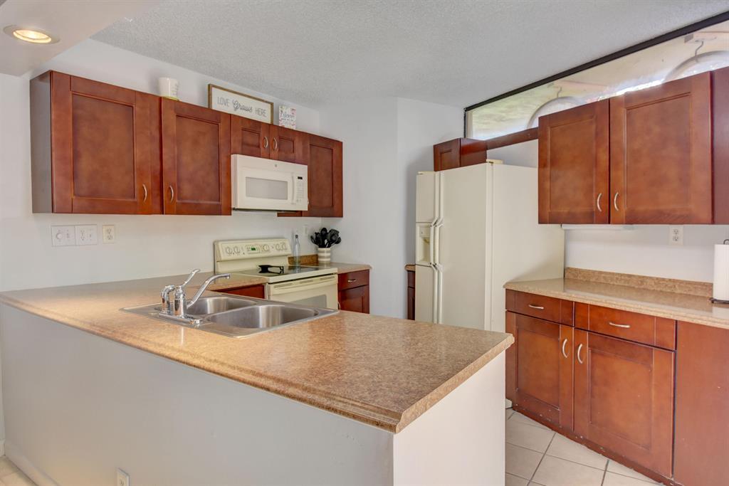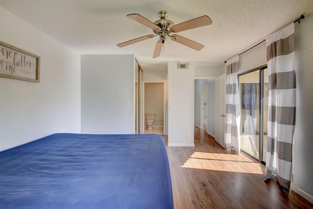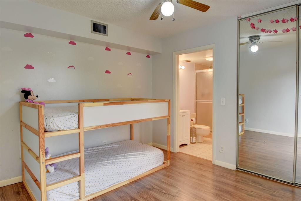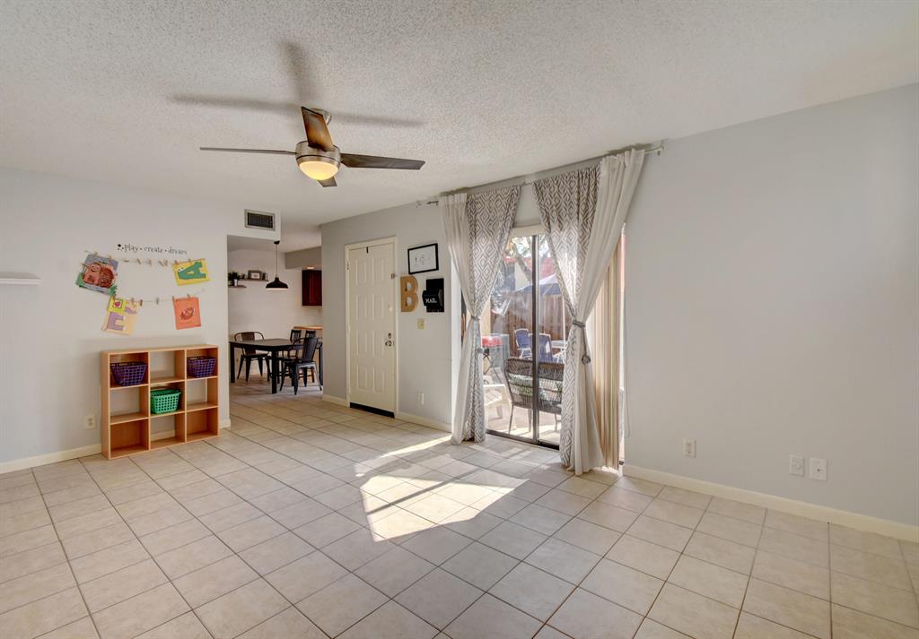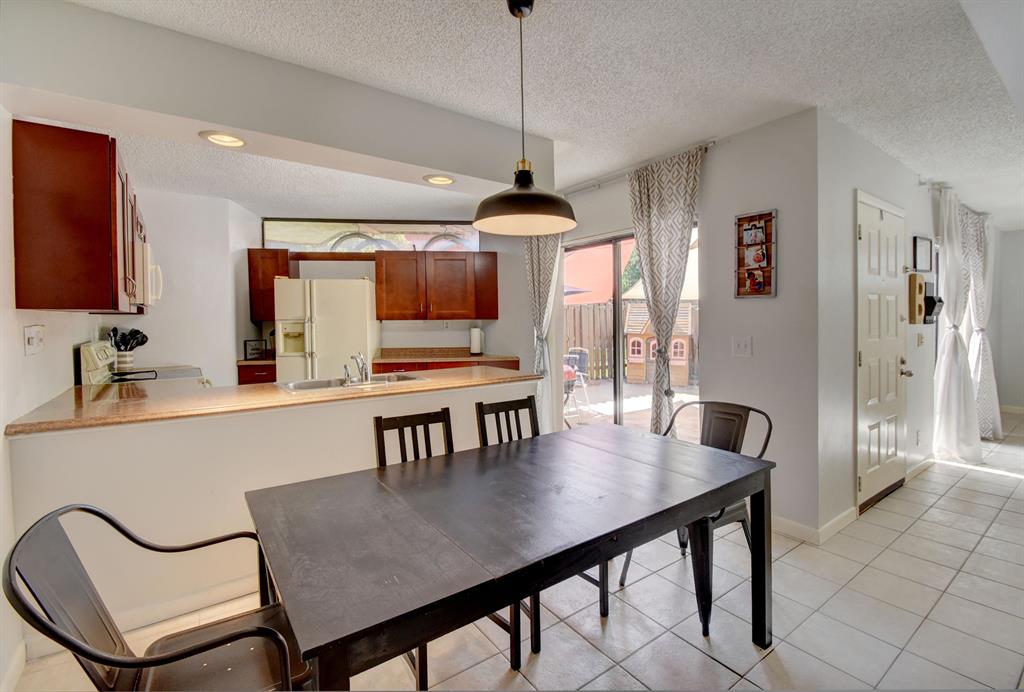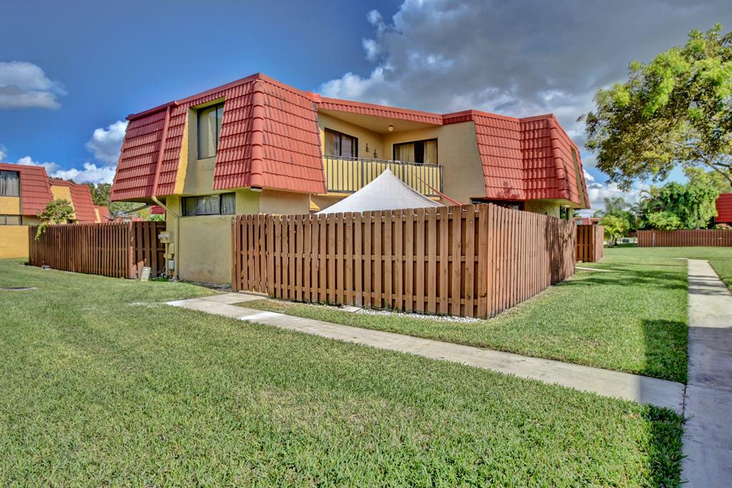 Tucked away, quiet 2 bedroom/2.5 bath Townhome with terrific flow and light in FAMILY AND PET FRIENDLY neighborhood. Private, fenced courtyard patio with UV protection sail shades; large, off-the-beaten track grassy area next to Townhome with woodsy views. Lake is steps away. Neutral tile on first floor; laminate in both bedrooms. Open kitchen (upgraded cabinets and countertop) with separate eating area; downstairs guest bathroom; walk in closets.Each bedroom has its own bathroom and shares a Juliet balcony (with patio weave privacy screen) offers great views; Community pool, tennis and racquetball. Low HOA. Great central location with EZ access to Turnpike, I95, Town Center Mall, beaches, shops and restaurants. 'A' rated schools and walking distance to the elementary school.