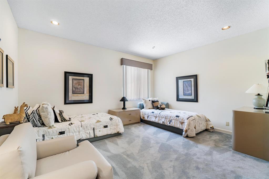 A spacious home with lots of opportunity awaits. Tree-lined with a tropical setting, this property is private yet situated on a golf course parcel as the backdrop. The oversized patio is perfect for entertaining while the screened-in room provides an excellent outdoor living space for relaxing. Offering an ideal floorplan with a large master bedroom suite on the main level that includes two separate master bathrooms and oversized walk-in closets. Another guest bedroom on the main level dually serves as a library/den. Eye-catching sun filled rooms add to the beauty of this home's impactful and voluminous design. On the upper level, you will find three large guest bedrooms, all en-suite with generous walk-in closets. Located in one of the nation's top ranked Country Club communities,