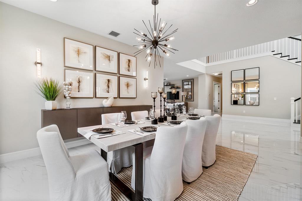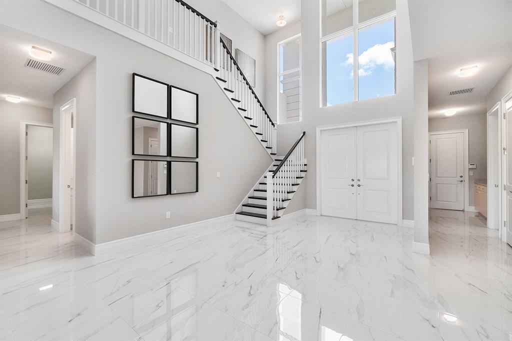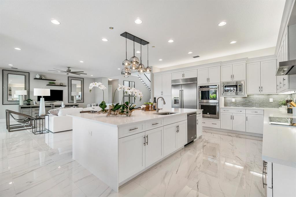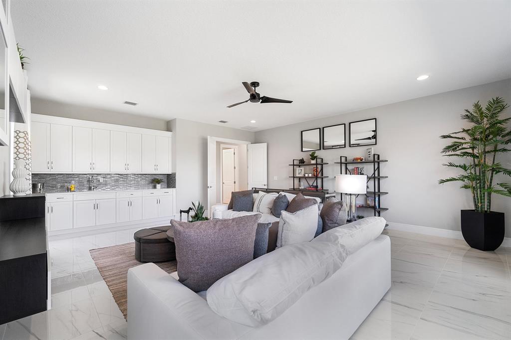 This brand new home is complete and partially furnished! Great Floor plan master plus 3 bedrooms upstairs with loft & 5th bedroom down. Custom pool with sunshelf bubbler & umbrella sleeve. Whole house impact glass windows & doors. Gourmet kitchen includes KitchenAid stainless steel appliances with 36'' built-in cooktop, 30'' double oven, a 36'' chimney style hood, built In microwave and 6 cycle/5 options stainless steel dishwasher, 48'' side by side refrigerator, Artic White Shaker cabinets with crown molding & light valance & lighting above & below cabinets, Organic white quartz countertop with glass linear tiles backsplash, stainless steel single bowl under mount sink, Moen faucet. 24 x 24 porcelain polished tiles throughout living areas. Red oak contemporary Stair Rail and wood stairs