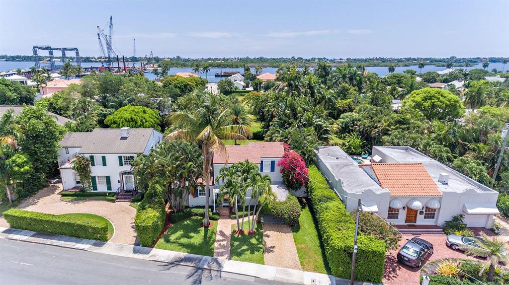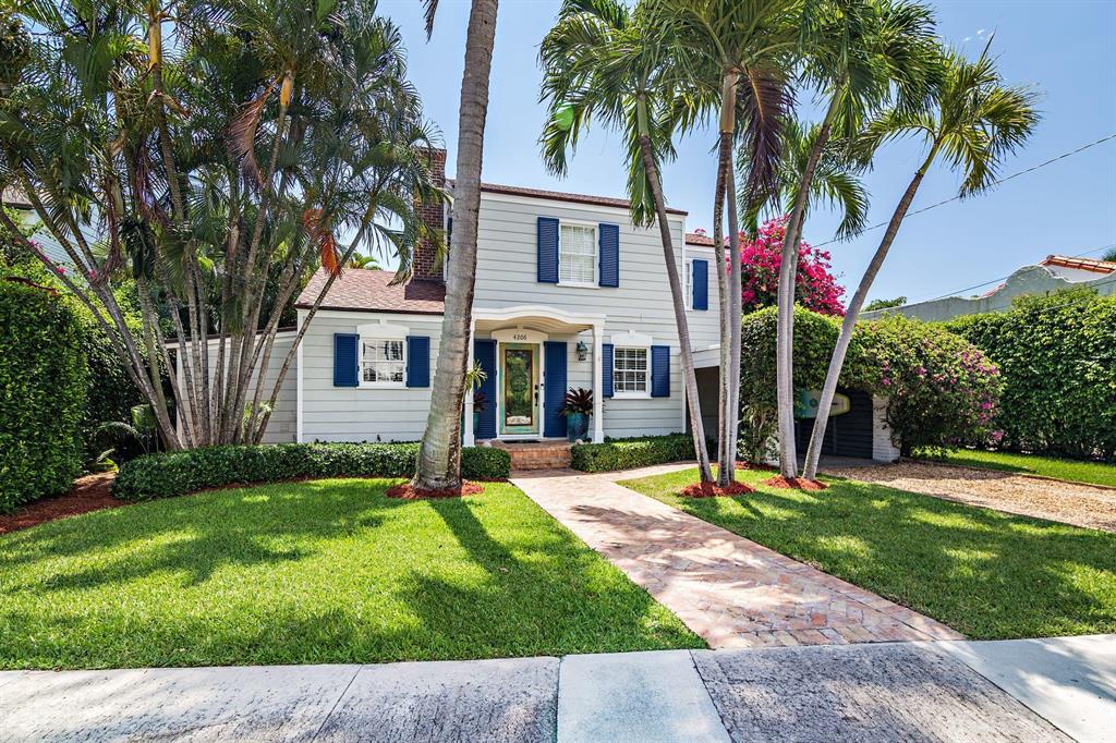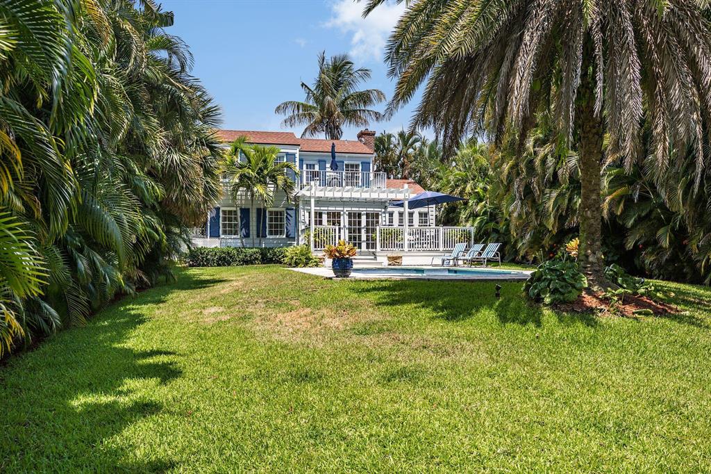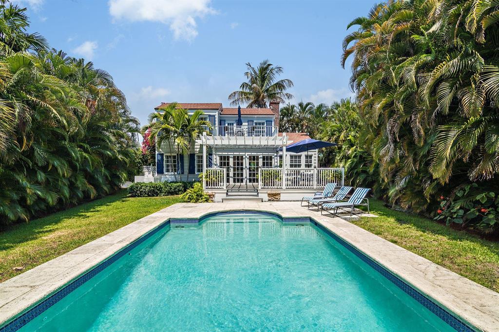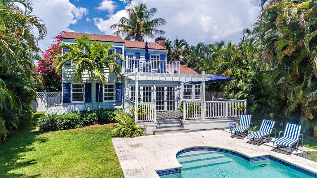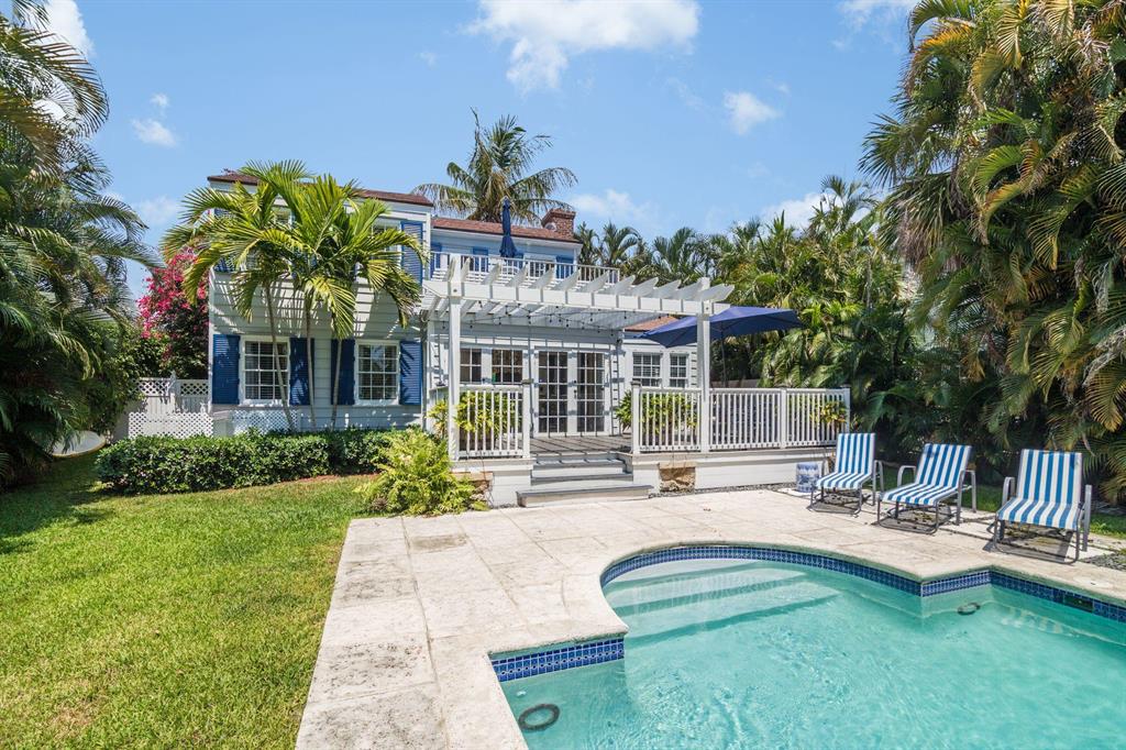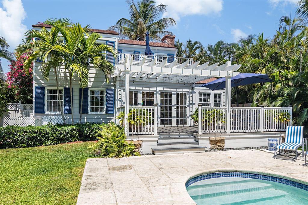 Stunning Southend Home! Gorgeous 3BR/2BTH home has the feel of a seaside cottage. Filled with charm & designer touches, palatial lawn, pool, mature palm trees & partial Intracoastal water views, gorgeous kitchen, working fireplace, hardwood floors, formal dining room with French doors opening to the trellis covered patio & pool. Lovely lawn, columned entrance with a gentle eye brow roof line & pebble stone driveway. Also notable are the colonial style hurricane shutters & the multi-pane windows. From the moment you enter the McMow Art Glass front door, vistas of the back yard & pool are prominently framed. Beautifully updated inside & out. Chef kitchen with custom cabinets & SS appliances is perfect for cooking & entertaining. Large private backyard with easterly breezes & water glimpses.