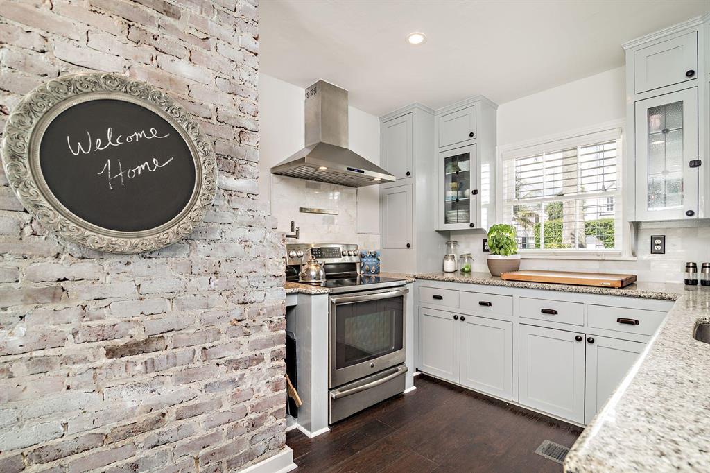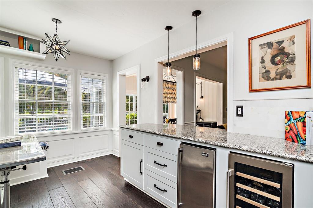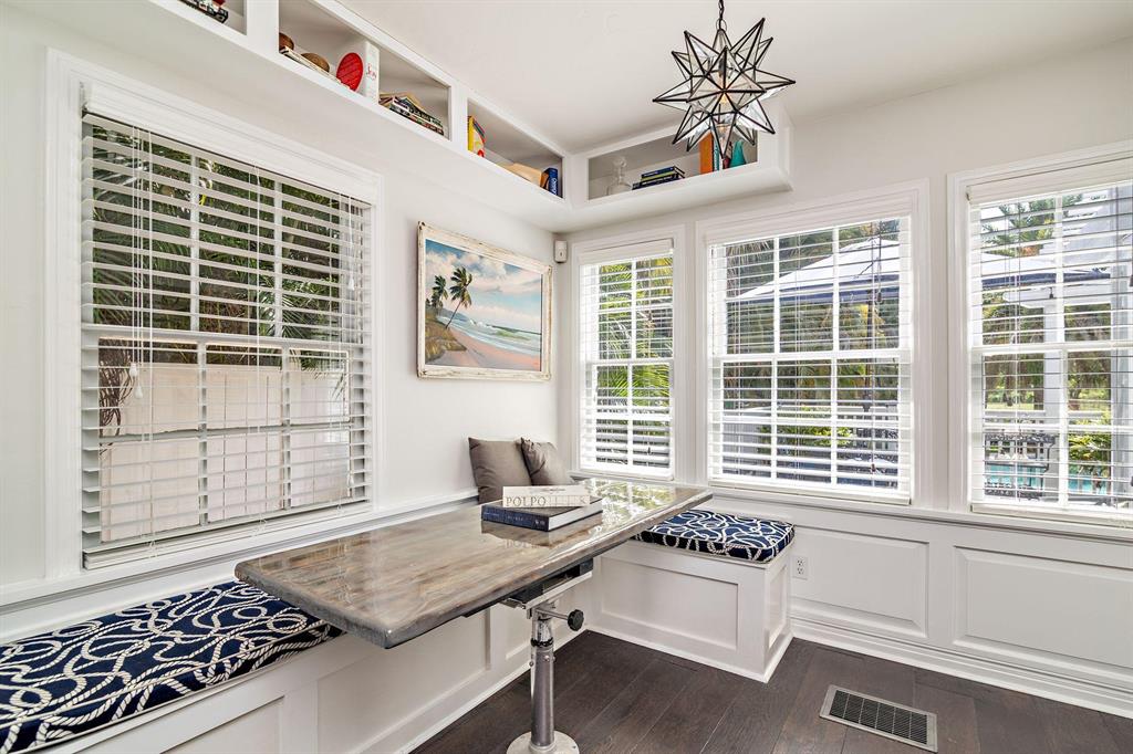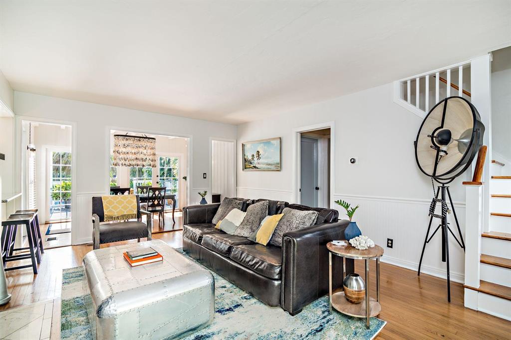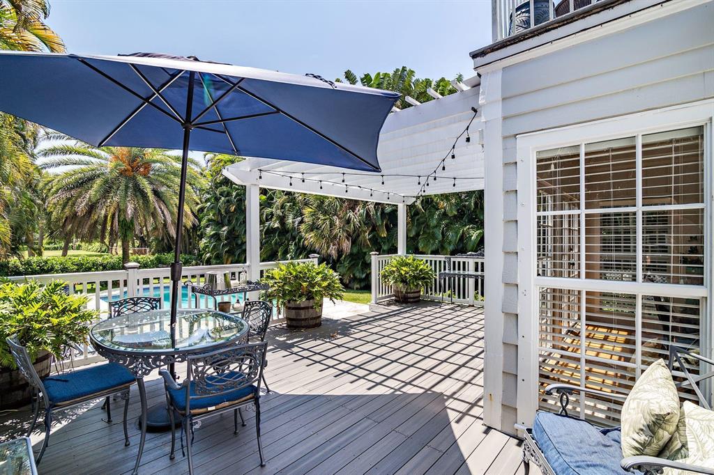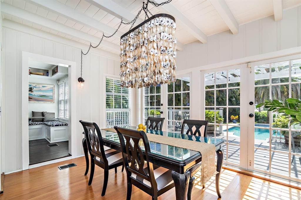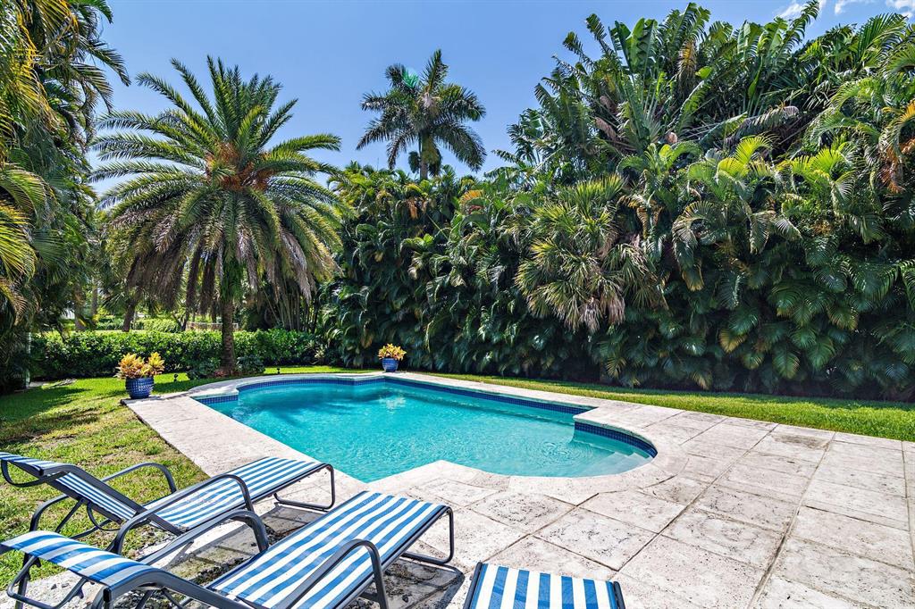 Stunning Southend Home! Gorgeous 3BR/2BTH home has the feel of a seaside cottage. Filled with charm & designer touches, palatial lawn, pool, mature palm trees & partial Intracoastal water views, gorgeous kitchen, working fireplace, hardwood floors, formal dining room with French doors opening to the trellis covered patio & pool. Lovely lawn, columned entrance with a gentle eye brow roof line & pebble stone driveway. Also notable are the colonial style hurricane shutters & the multi-pane windows. From the moment you enter the McMow Art Glass front door, vistas of the back yard & pool are prominently framed. Beautifully updated inside & out. Chef kitchen with custom cabinets & SS appliances is perfect for cooking & entertaining. Large private backyard with easterly breezes & water glimpses.