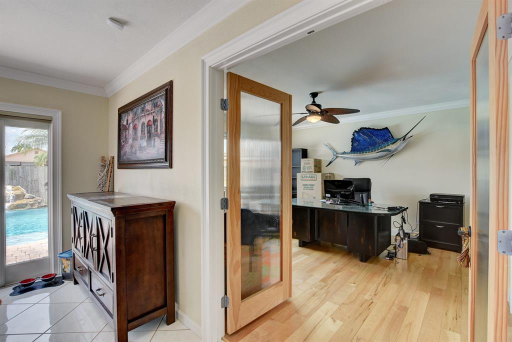 3 bedroom + Den, POOL home with just over 2000 liv sqft,and 2 car garage. ROOF 2006, HWH 2013, AC 2019. IMPACT WINDOWS and DOORs. NEW KITCHEN , Stainless steel appliances. 3 yr old pool pump & filter. 2006 Salt POOL with rock fountain. Backyard is pavered and wood decking, TIKI Huts, built in grill and table. A true Oasis! MAPLE HARDWOOD floors in the bedrooms with tall baseboards.. Both baths updated,gorgeous! Crown molding.Fenced exterior on just under quarter acre lot . Master bedroom has SITTING ROOM/DEN perfect for office area. Open floor plan, 3 way split bedroom floor plan.Canal in back of home for outdoor privacy, and front of home is across from lake offering great long views from kitchen. Canal fed sprinkler.