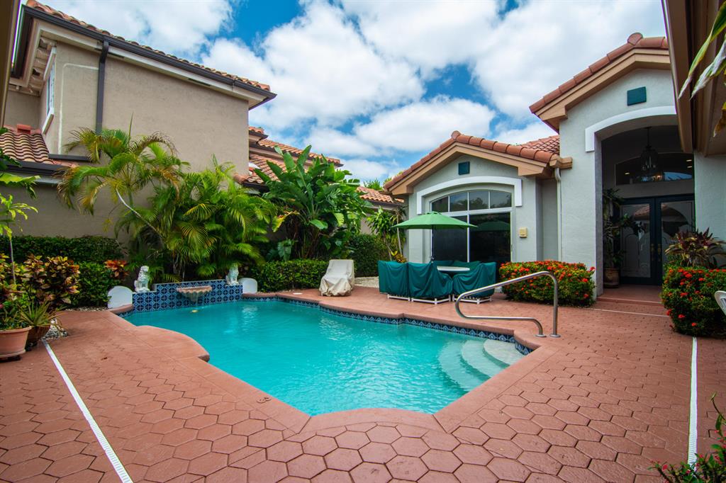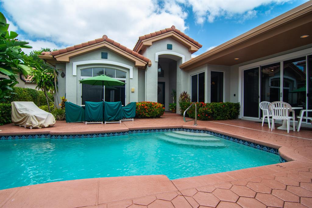 SOUGHT AFTER COMMUNITY OF SANTA BARBARA, SINGLE STORY HOME WITH PRIVATE COURTYARD & POOL,3 BEDROOMS,3 1/2 BATHROOMS, 2 CAR GARAGE.THIS IS NOT A PERIMETER HOME! THIS HOME WAS EXPANDED BY THE BUILDER & HAS A LARGE GUEST BEDROOM & ADDITIONAL SPACE IN LAUNDRY ROOM FOR OFFICE. GREAT PATIO SPACE IN THE COURTYARD, TAX ROLLS DO NOT REFLECT THE ADDITIONAL SQ FT.ROOF,GARAGE DOOR & FRONT DOOR HAVE BEEN REPLACED! SPACIOUS MASTER SUITE. LIVING ROOM WITH WET BAR, SKYLIGHTS IN KITCHEN AND DINING ROOM GIVE THE HOME AMAZING NATURAL LIGHT! 3RD BEDROOM AND 3RD FULL BATH ARE IN SEPARATE GUEST HOUSE...GREAT FOR GUESTS! LOUNGE/BAR AREA CAN EASILY BE 4TH BEDROOM AND 4TH BATHROOM! METICULOUSLY MAINTAINED PROPERTY. GREAT SCHOOLS! RECENTLY PAINTED EXTERIOR. NO ROAD NOISE! GREAT YEAR ROUND & PERFECT FOR SNOWBIRDS!