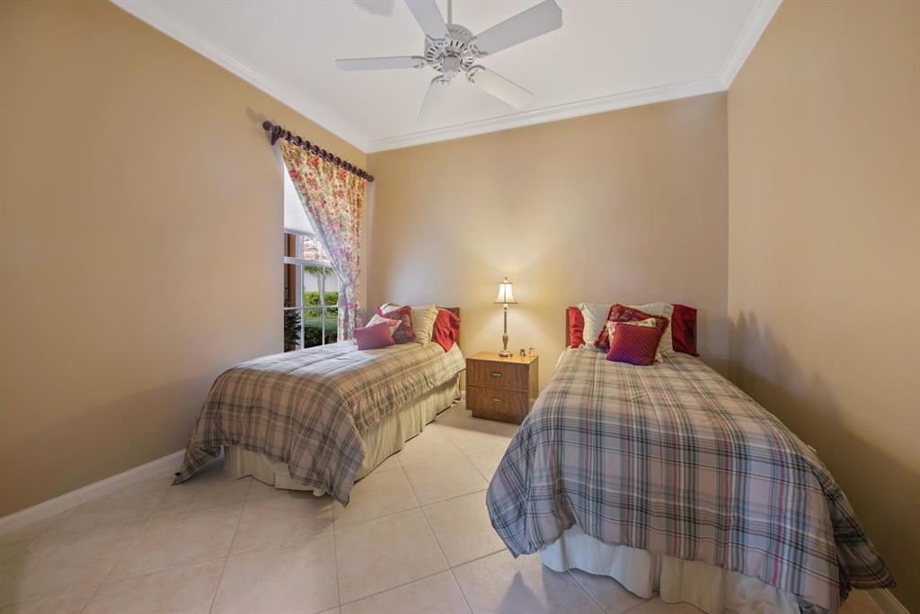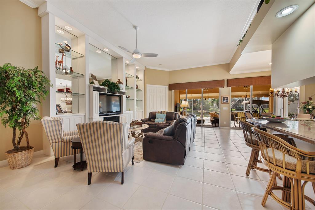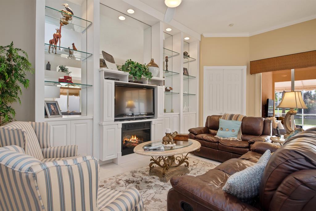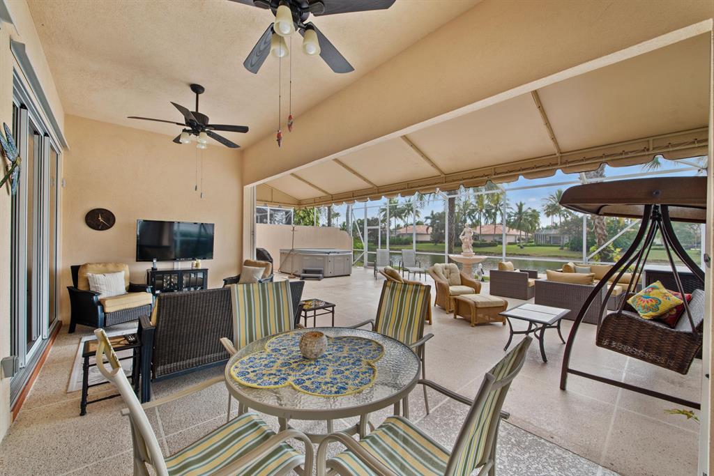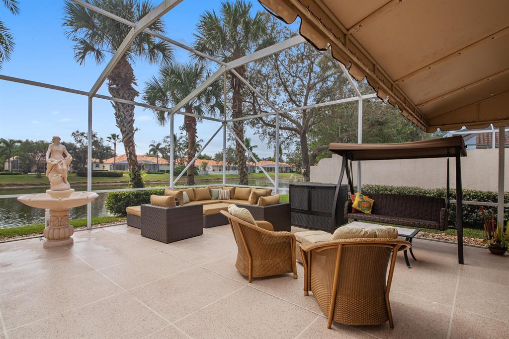 This Stunning Lakeside Residence has been Meticulously Maintained, Inside & Out! It;s in RiverWalk, a 24 Hour Manned Gated Community that is 15 minutes from what makes Palm Beach County a Fantastic Place to Live including The Ocean! The Lush Extra Wide Front Lawn highlights the Inviting Covered Entry leading to the Foyer with a Decorator Fixture that opens to the Great Room with 12 ft. Ceilings, Crown Moldings, Entertainment Center Modified for a Large Screen TV & has it an Inviting Electric Fireplace too! The Dining area has a Decorator Fixture & Sliders leading to a Patio with a Permanent Awning plus 18 ft. of Sliding Glass Doors leading to the Charming Lanai that opens to the 30 ft Lakeside Screened Terrace that has a Water Fountain, and a Vita 6 Person Hot Tub/Spa