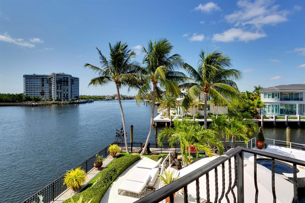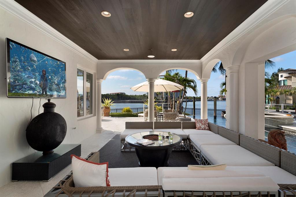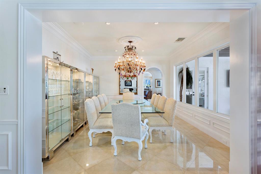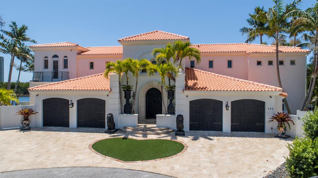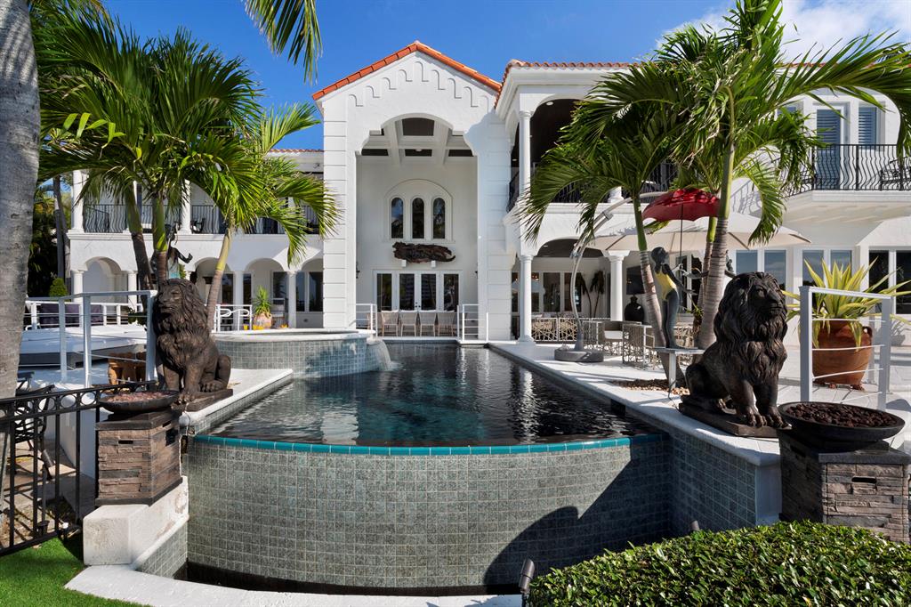 This impressive home is sited on a Prime Intracoastal Point Lot with 227' of wraparound waterfrontage with unobstructed views! Comprised of over 9,000+/- sq. ft. (6,600+/- under air), the bright interior features a gourmet waterfront kitchen open to the family room, a two story living room, grand dining room and a rich wood-paneled library/den all with stunning views. Upstairs, 3 large family en-suite bedrooms share a beautiful waterfront den and loggia. The private spacious master wing has its own private terrace and amazing water views. An infinity edge pool and spa, two covered loggias and multiple outdoor terraces provide resort-like entertaining space, all overlooking the 122 +/- ft. of protected dockage for a large Yacht!