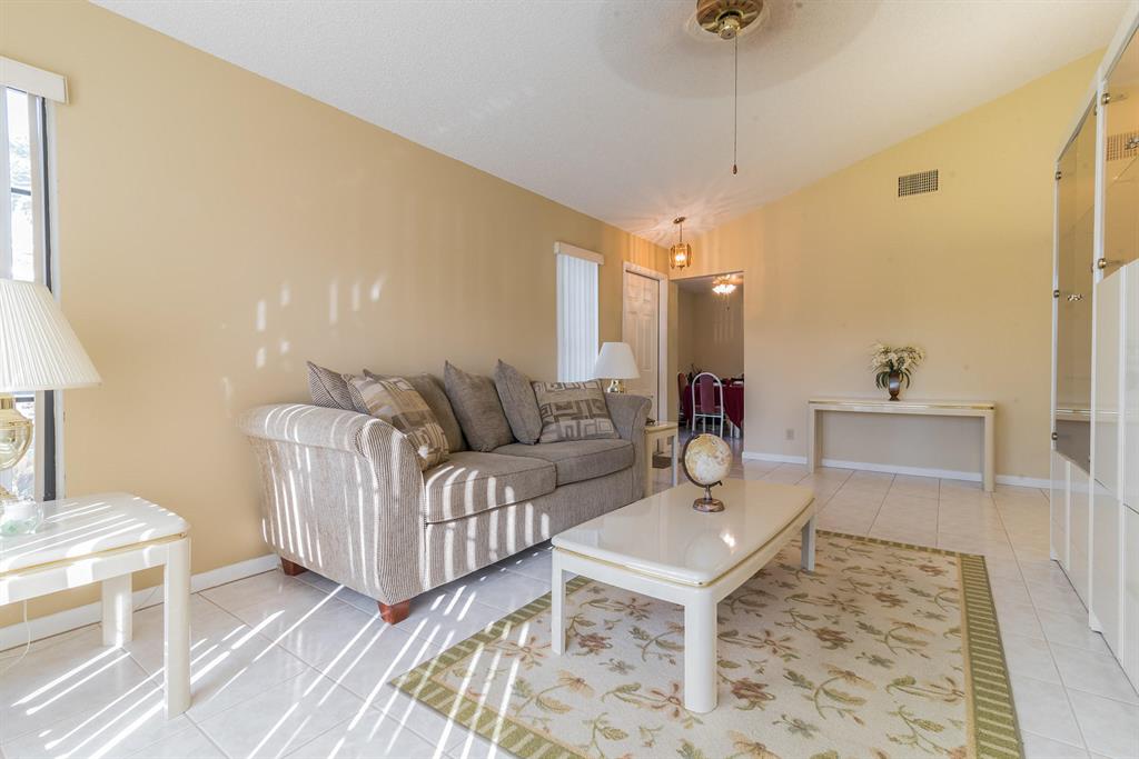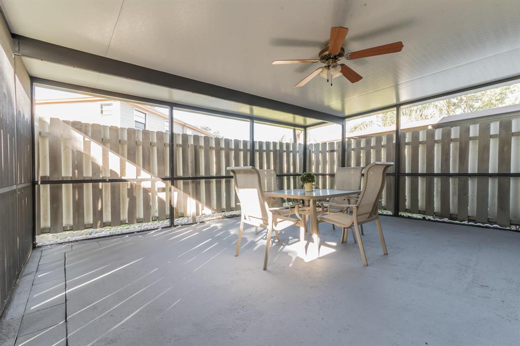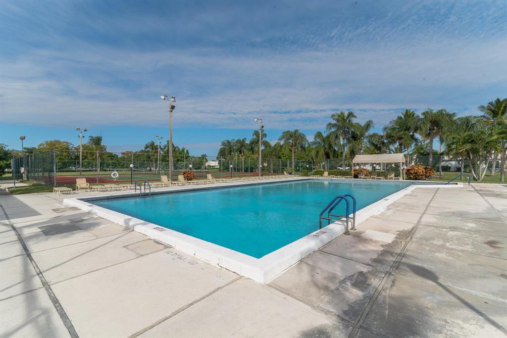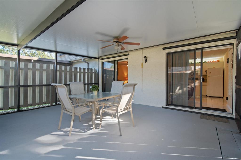 Fully Furnished and Move in Ready! Near schools plus lots of community amenities! Bathed in natural light, featuring storm shutters, large screened patio with Kitchen & Master Bedroom access, gleaming tile, plush carpet, ceiling fans inside & out, 2 Flat panel TVs, window blinds, auto garage opener, Kitchen appls + W/D. Community clubhouse w/Olympic sized pool, gym, party rm, tennis/basketball/racquetball courts plus private satellite pool. HOA includes exterior maintenance & building insurance.