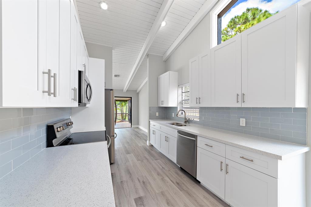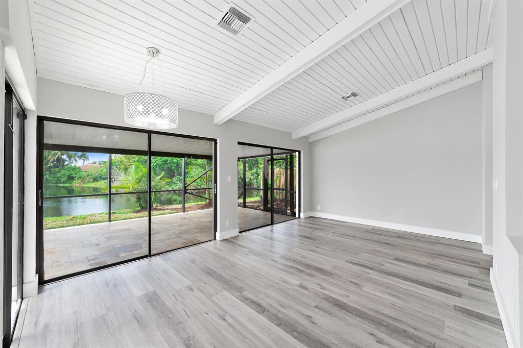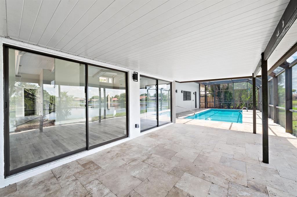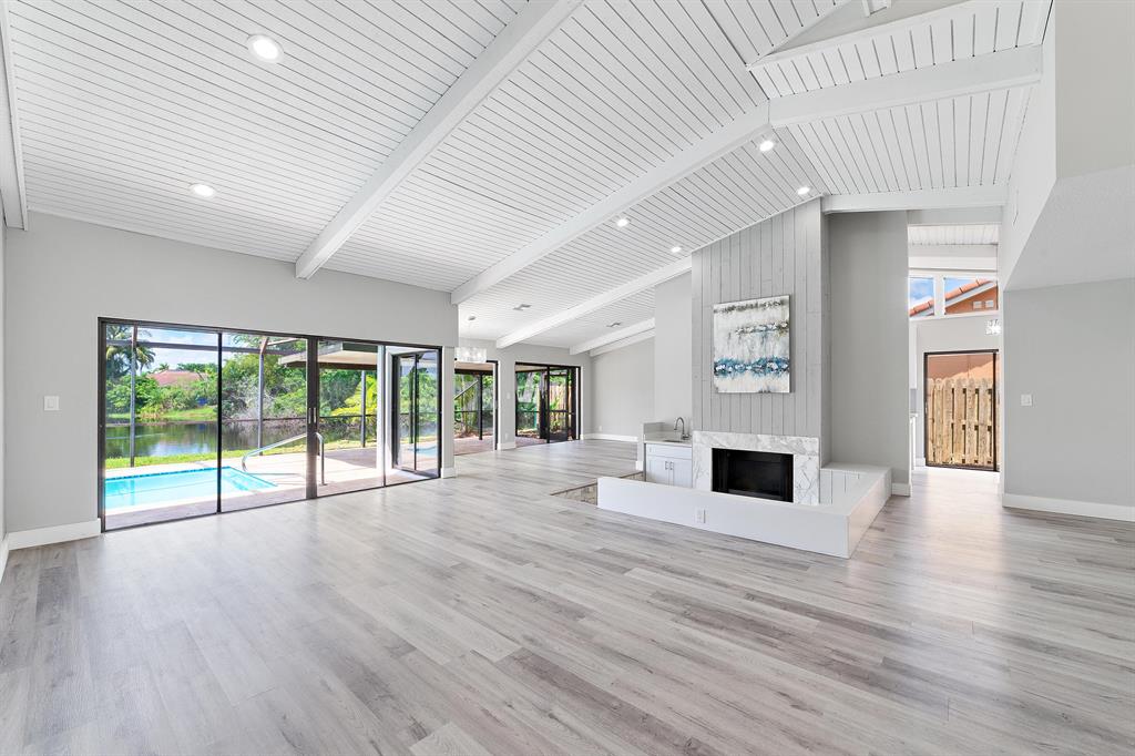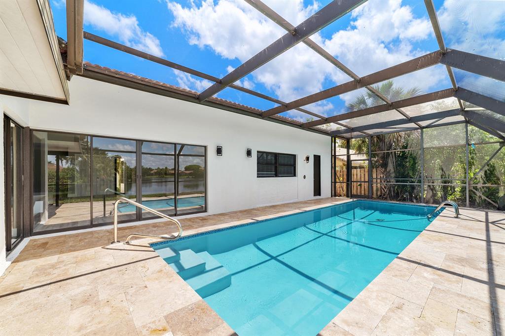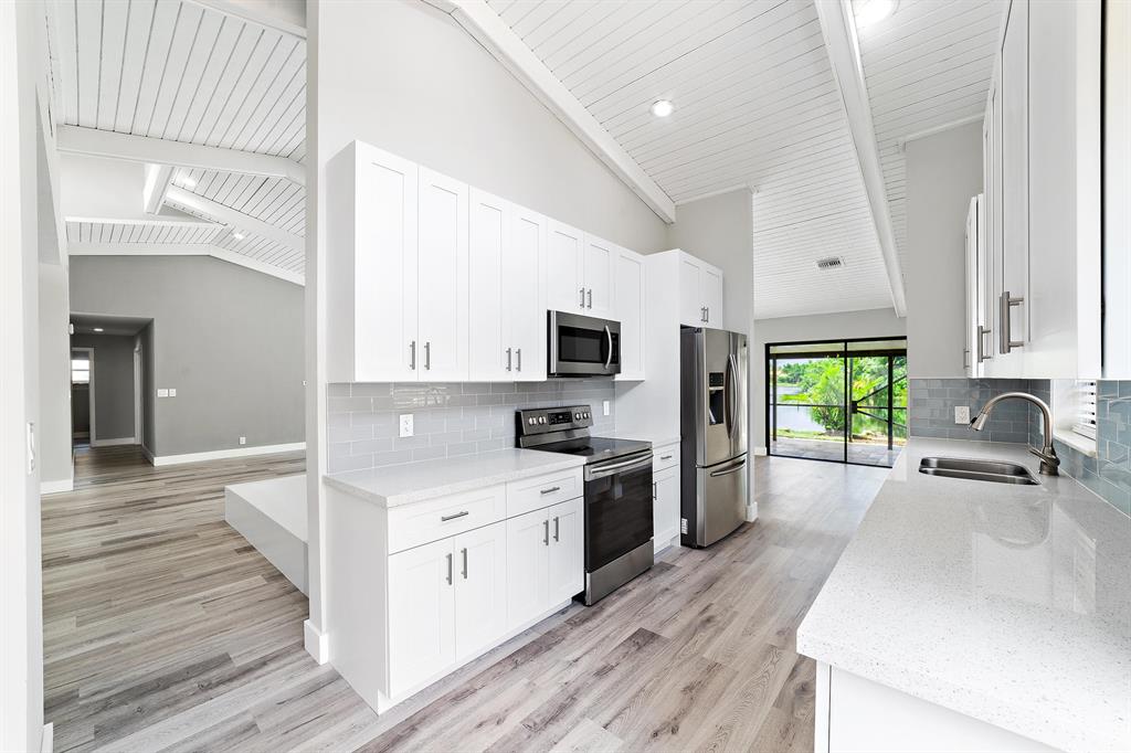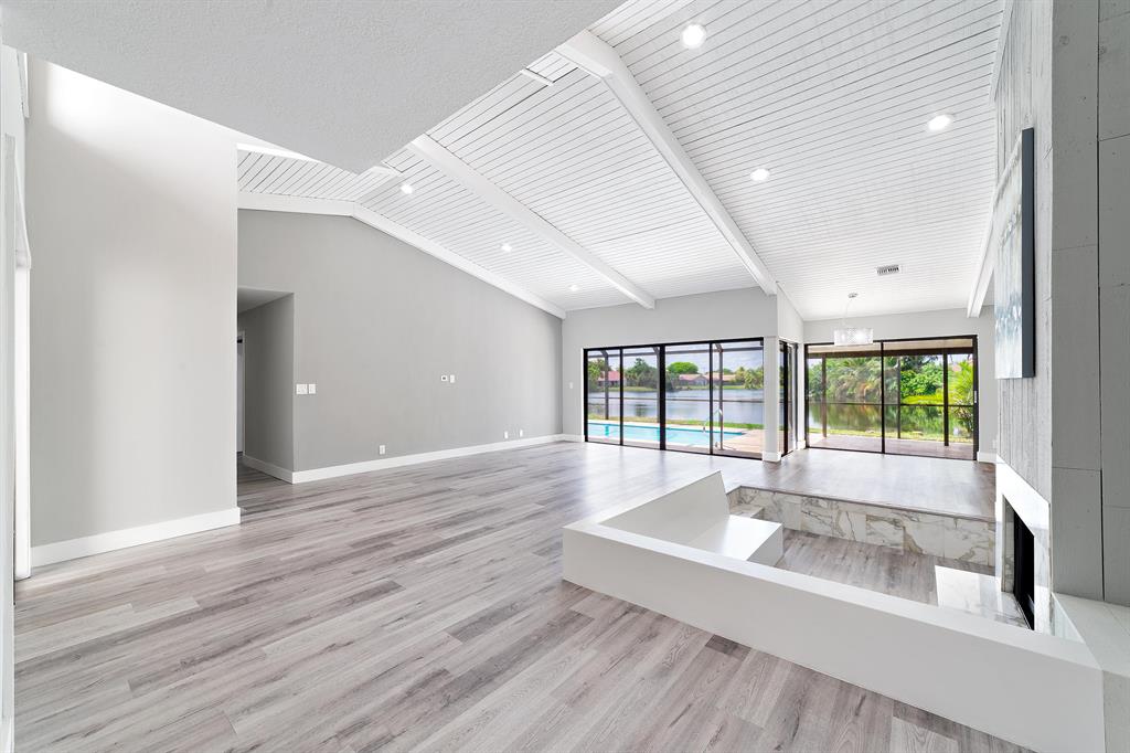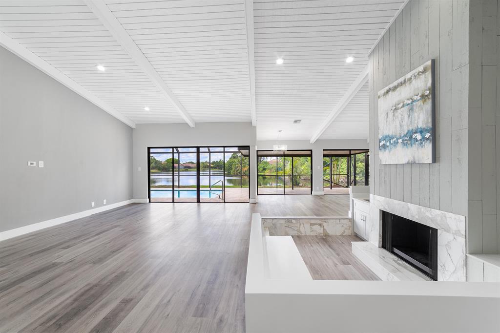 Beautifully Renovated 3 Bedroom, 2 Bath, Lakefront, Pool Home with 2 Car Garage. Home features a screen enclosed patio & porch with newly resurfaced pool, & new marble pavers. The interior vaulted beamed ceilings and large glass sliders provide an amazing view of pool & lake. The living room boasts a sunken conversation pit, with fireplace & wet bar. The remodeled kitchen has white shaker cabinets with 42'' upper cabinets for ample storage, quartz counters, glass tile backsplash & Samsung appliances. Both the master & hall baths have been updated. New waterproof luxury vinyl plank flooring runs throughout the home along with new modern style interior doors. Fresh interior & exterior paint, lush landscaped yard, new central AC. 2 car garage, laundry room. The list goes on....