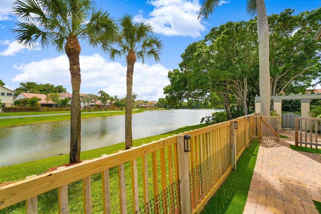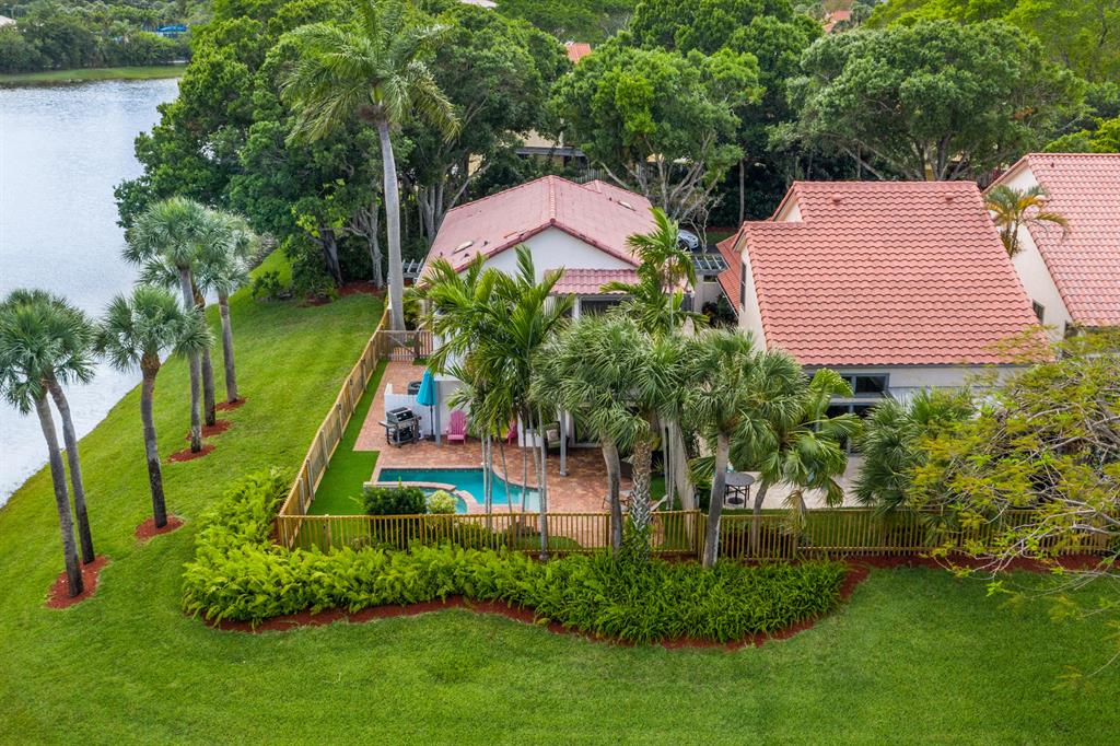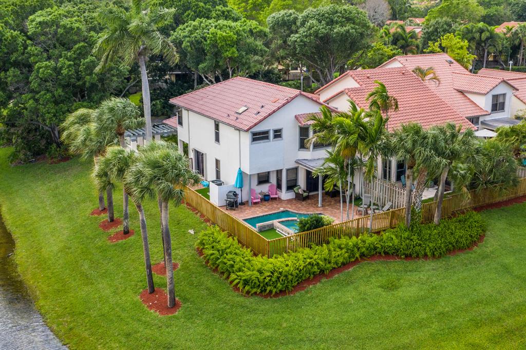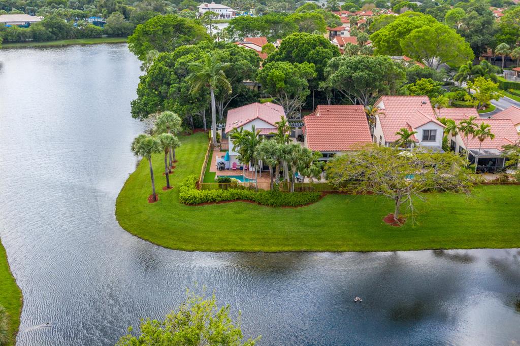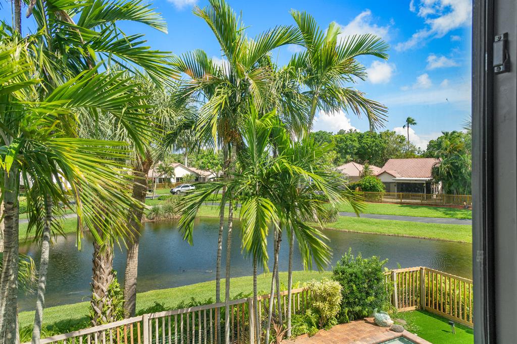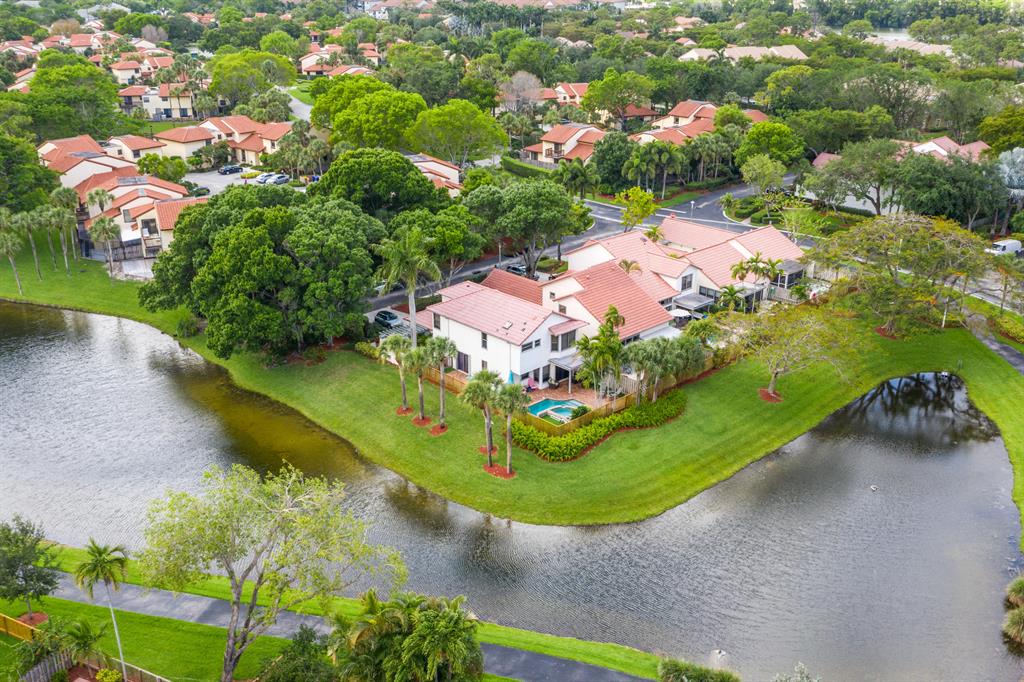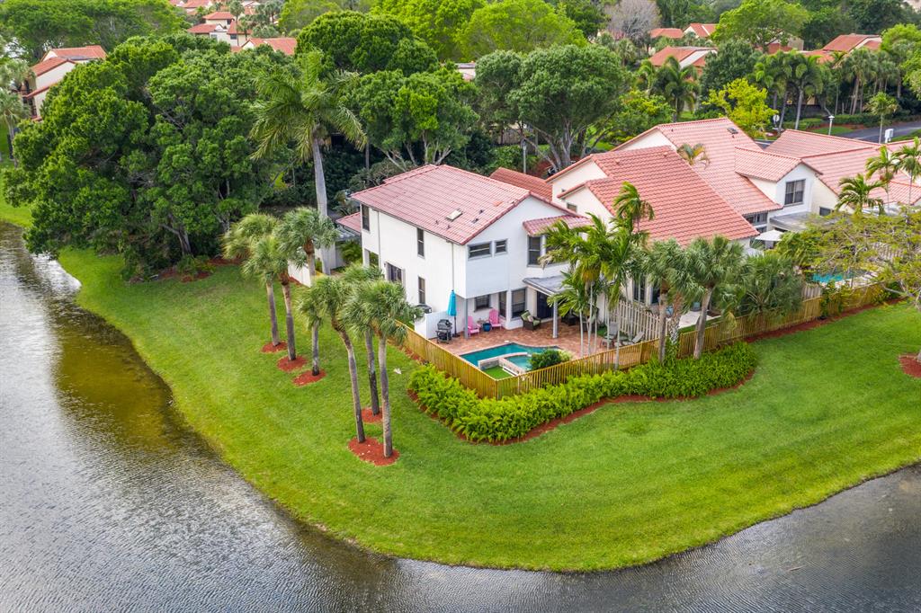 The absolute best lot in Wimbledon! Stunning corner lakefront point lot boasts panoramic water views from almost every room. Totally updated two story pool home offers wood floors throughout and impact windows. Beautiful kitchen with wood cabinets, granite and SS appliances. Spacious open floorplan with formal living room, dining room plus family room. Three bedrooms plus den/office. Gorgeous private outdoor living space with tranquil waterfall pool and oversized paver patio perfect for entertaining. Lushly newly landscaped totally fenced yard with low maintenance synthetic grass and eureka palms. Spacious master suite with stunning water views and updated granite bath. AC 2018. Wimbledon offers a 24 hour manned gate, heated community pool/spa & lakefront walking trail