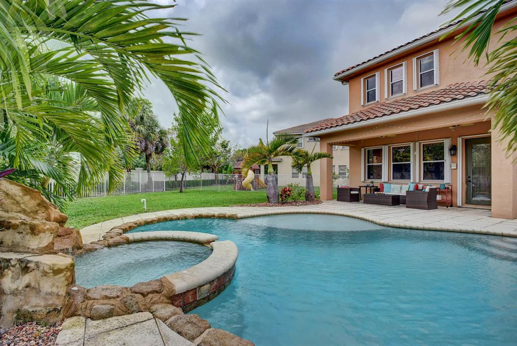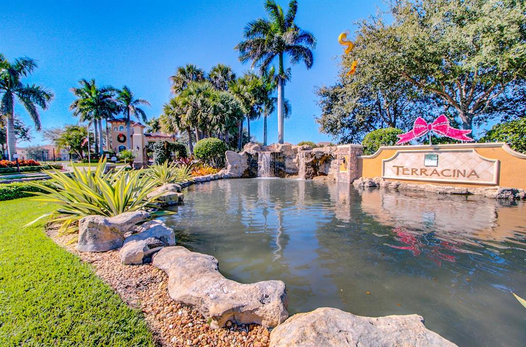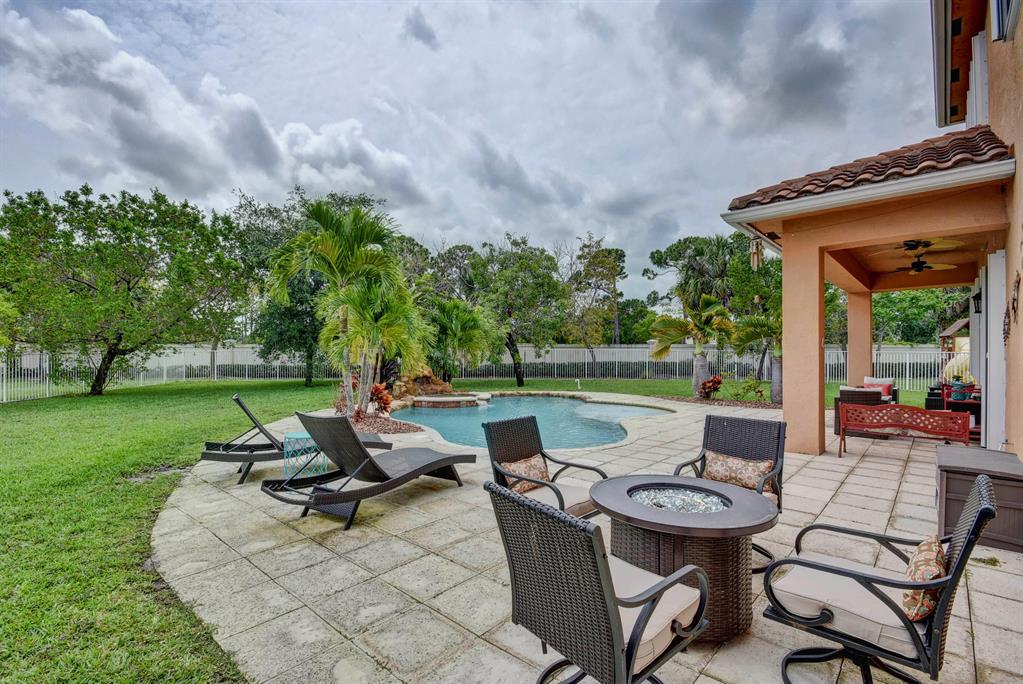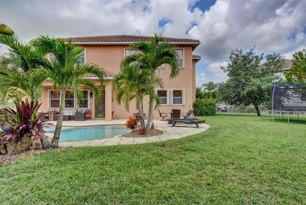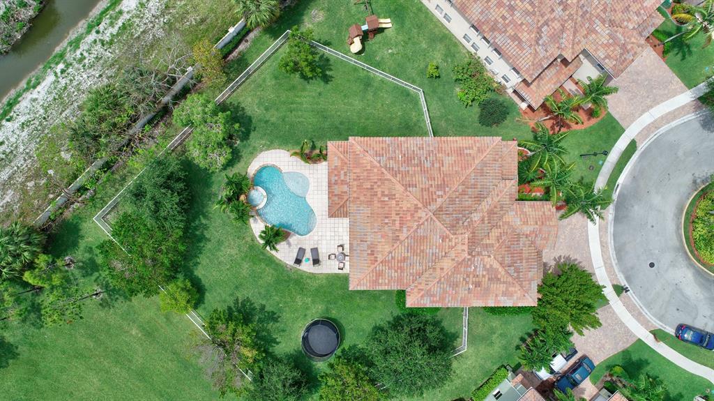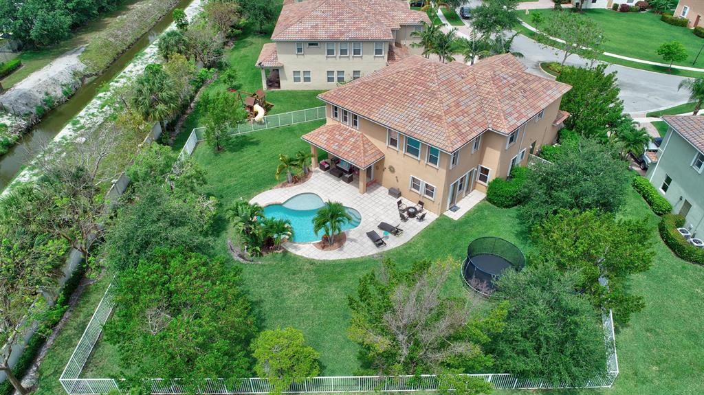 Exceptional POOL home on 1/3 acre pie shaped lot, lined w/Mature trees. HOA fees includes front & back lawn care. Fully enclosed fence. 5 oversized bedrooms, 4 have attached bathrooms & walk in closets, one Private BEDROOM & Full bath DOWNSTAIRS. Enormous kitchen with gourmet finishes, new double oven, Tumble-marble backsplash, wine rack, butlers station and huge center island. Tons of storage space. High ceilings. Charming archways. Very wide stairs lead to an Enormous LOFT/BONUS room. Lot of natural light. ACCORDIAN SHUTTERS thru-out. The backyard feels like a private retreat. You must be in it to fully appreciate. Terracina is a centrally located, man-gated community. We are within 10 minutes to I95,Turnpike, PBI Airport, Okeeheelee Park. 15 mins to CityPlace, Wellington Mall etc