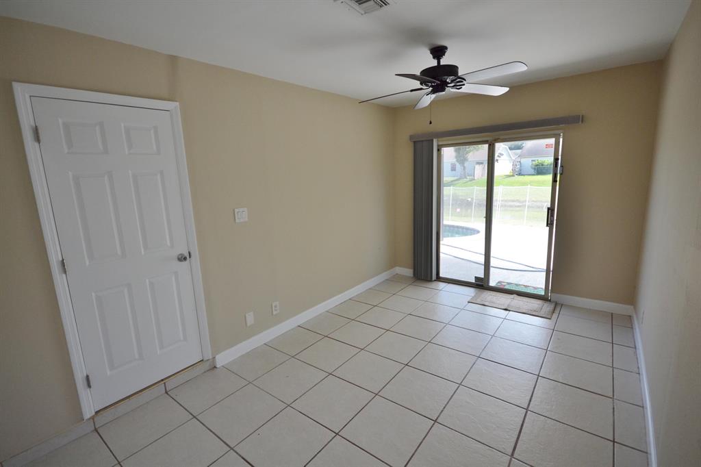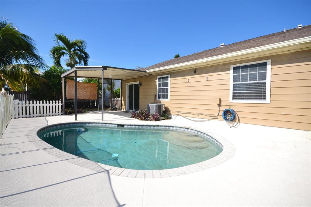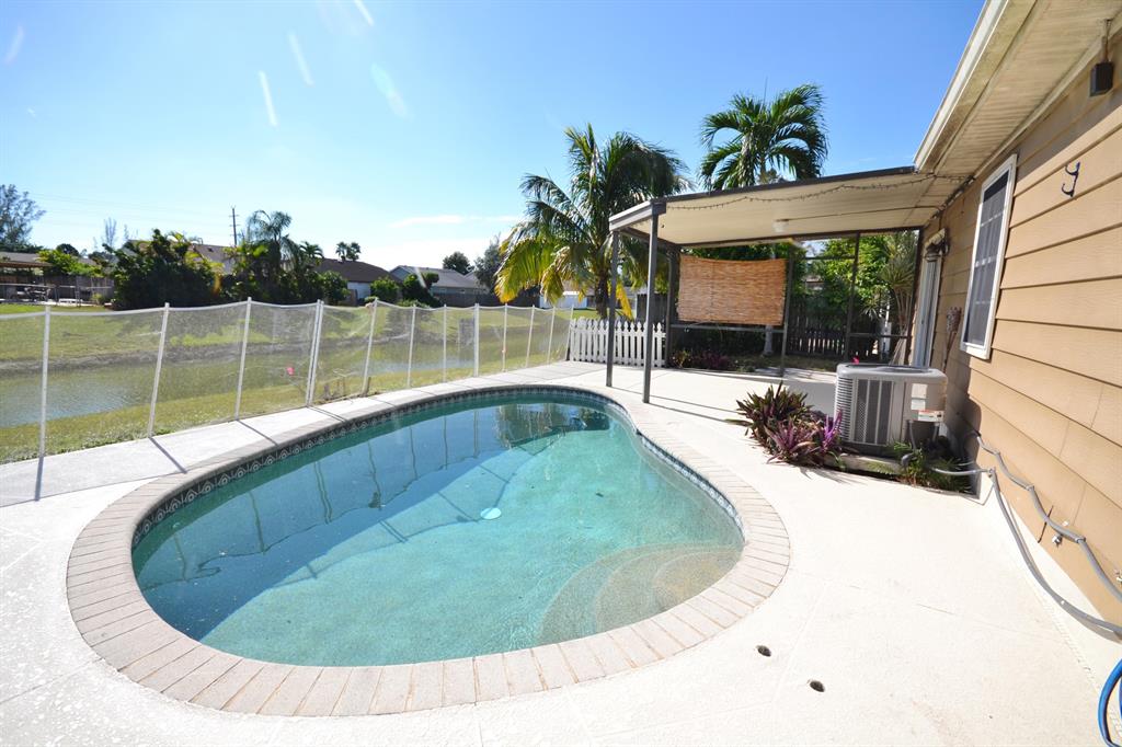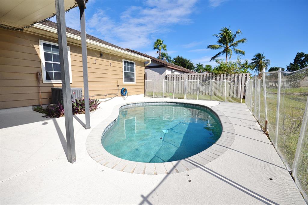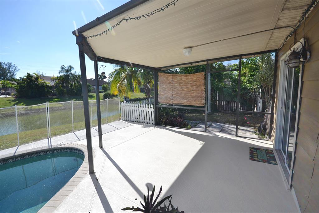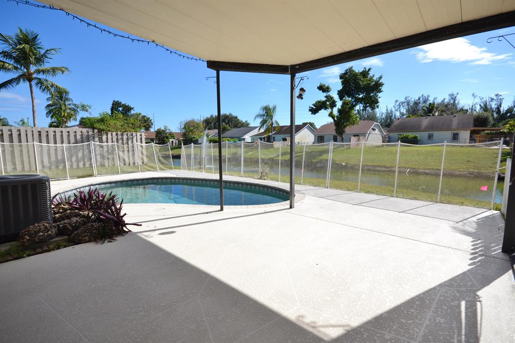 Lovely remodeled 3/2/1 in quiet family neighborhood with private pool, covered patio and serene water view. Kitchen recently remodeled with beautiful cabinets, granite counters, updated stainless steel appliances. Recently remodeled bathrooms. Ceramic tile throughout. Serene backyard on a canal with irrigation system for yard. Irrigation was just repaired. Freshly painted inside, patios front and back freshly painted. No application fee or interview required for this community. 2012 New Roof and approx 2016 AC system. 1996 Pool & Patio Addition. Community pool and park across the street.