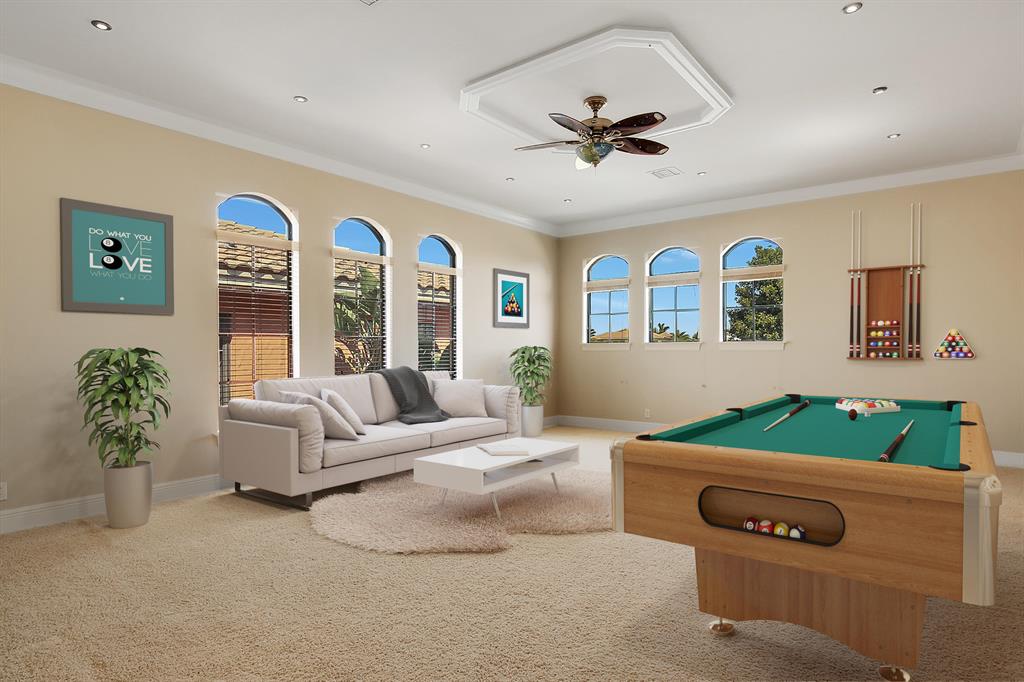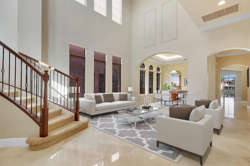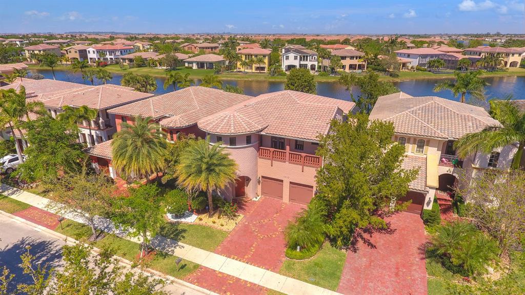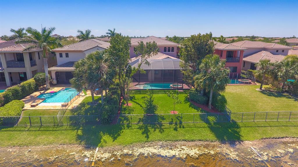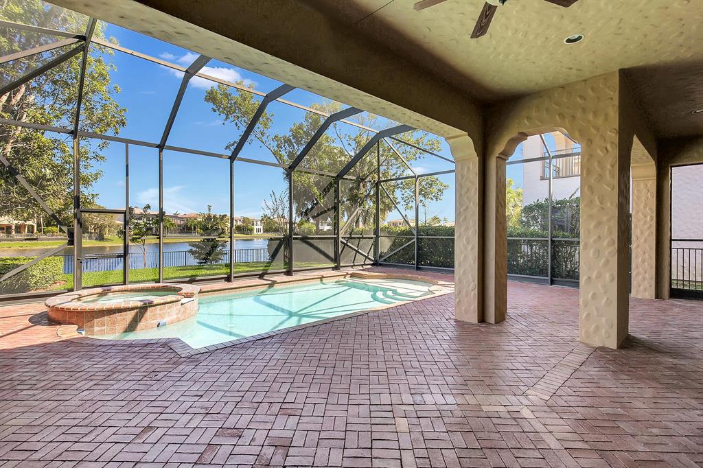 This Spanish style estate boasts spiral stairs within its tower, 24' ceilings & glassy marble floors. Other features include, serene lakefront, screened & heated pool & spa, ground floor master suite, a palatial master bath with Jaccuzi tub, enormous bonus/entertainment room upstairs (could be 5 & 6th bedroom). Upgrades abound: Granite counters, rich wood cabinetry, crown moldings, tray & coffered ceilings, stainless appliances, arches, IMPACT GLASS throughout, customized closets, fully fenced yard. HOA fees of $555/mo include use of the country club recreational facilities, state of the art fitness center, salon spa, yoga and other classes, 3 restaurants & so much more. PGCC's grounds are enchanting and is the background for countless wedding photos.