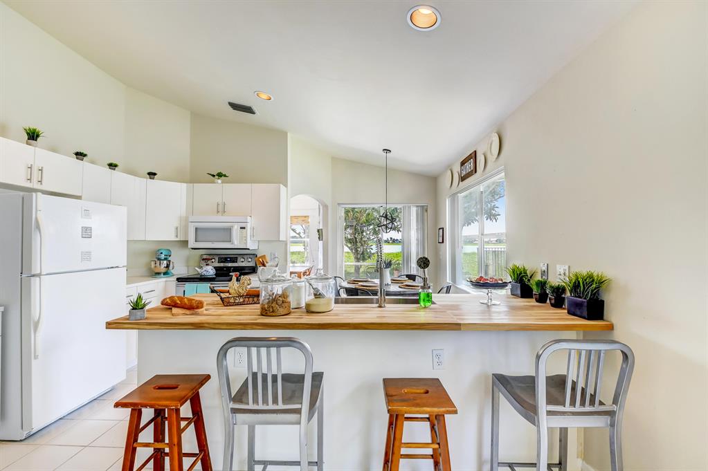 Updated Waterfront Modern Farmhouse in Boca Chase! Dramatic entrance w/soaring cathedral ceilings & picturesque windows of long and wide water views! Enjoy the sense of openness, volume & space. This home features 3 bedrooms, 2 baths with a split floor plan. Breath taking water views from almost every window! Decor you Find from Designers on HGTV, enjoy Bamboo hardwood flooring throughout, all new light fixtures, freshly painted, dining room window framed in farmhouse vintage trim, Ship lap wall treatment, wainscoting, foyer has Mediterranean tile. The list goes on and on......The fabulous eat in kitchen features brand new Teak butcher block countertop on the huge island with a new Stainless steel deep farmhouse sink. Both bathrooms are updated and quite unique in design.