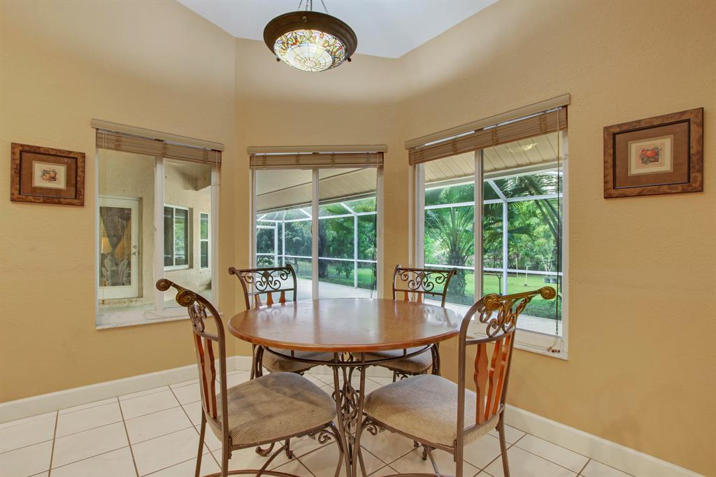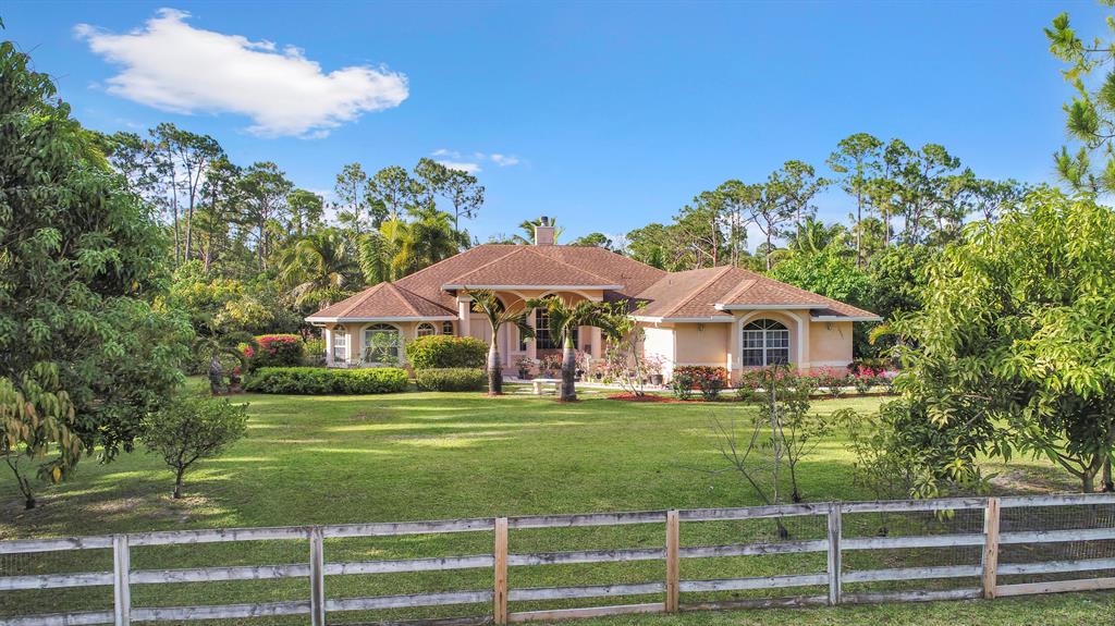 Charming ranch home in the private community of Loxahatchee. Tucked away from the hustle and bustle but still a short drive to area amenities. 3 bedrooms plus den and bright open living space with over 2900 under air. The great room off the kitchen is a great place to entertain or kick back after a long day and watch a movie in the theater like setting with built in surround sound. The chefs kitchen offers plenty of cabinet and counter space with stainless appliances. A generous master suite is separate from the guest rooms and is equipped with dual walk in closets and a luxurious master bath with a sport shower and jacuzzi tub. Dual zone AC, one for the master and one for the rest of the home. Outside you'll enjoy evening breezes on the screened extended patio. The irrigated yard