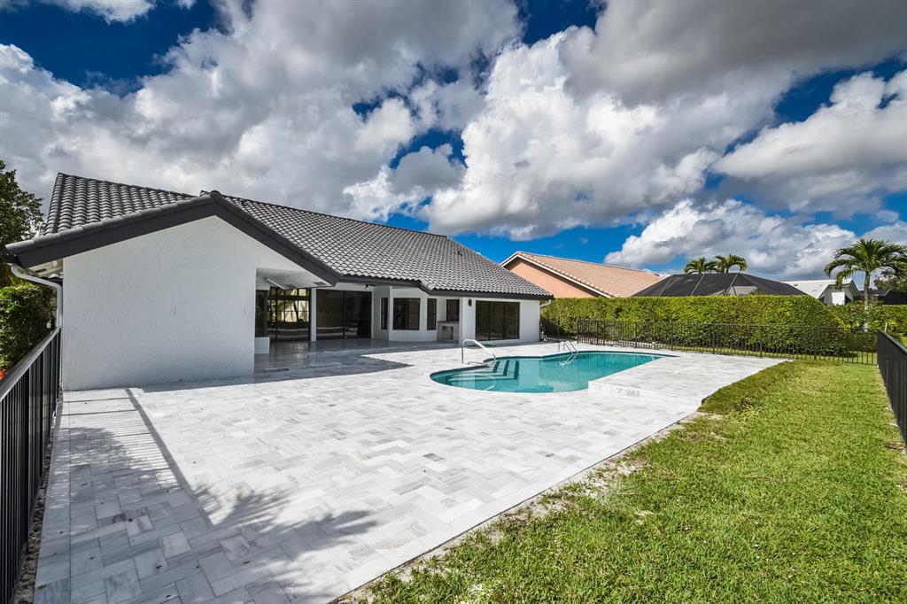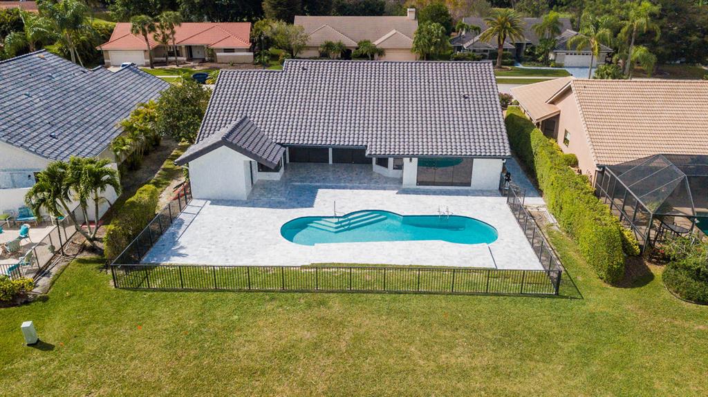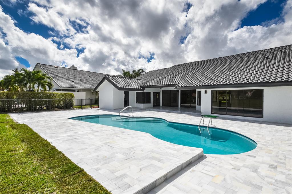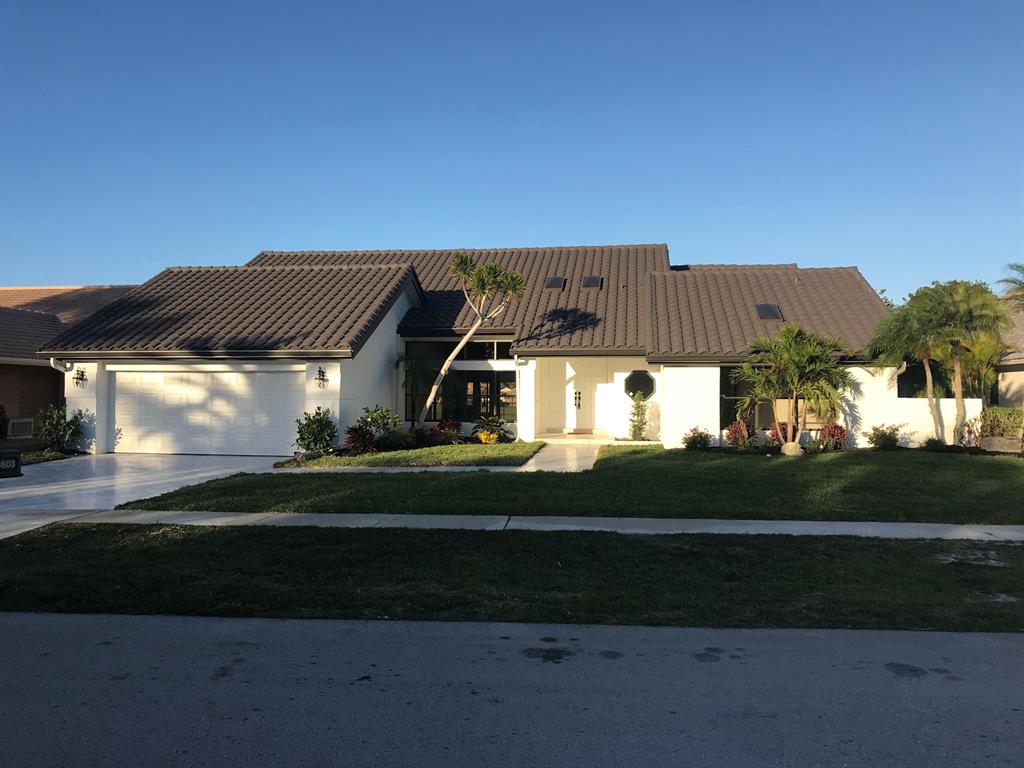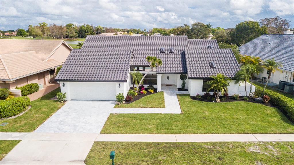 Mandatory golf membership $65,000. Beautiful contemporary with designer finishes. Stunning 3 bedrooms with 4 full baths. His & her luxury baths. Sited on large interior lake lot with golf course views. Porcelain plank floors. New appliances. Over sized pool with new marble travertine pavered pool deck and driveway. $30,000 refunded at the sale of your home. Two 18 hole golf courses along with full country club amenities. Boca Woods is an all age community close to parks, shopping houses of worship, I95 & Tpke. Yearly dues $15309 + dining minimum of $1500 yearly. Non tipping club. Assessment $84 monthly. JOA $301. Includes 24 security, cable & internet. Great Tennis. Consult manager for tour of club.