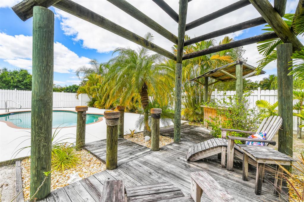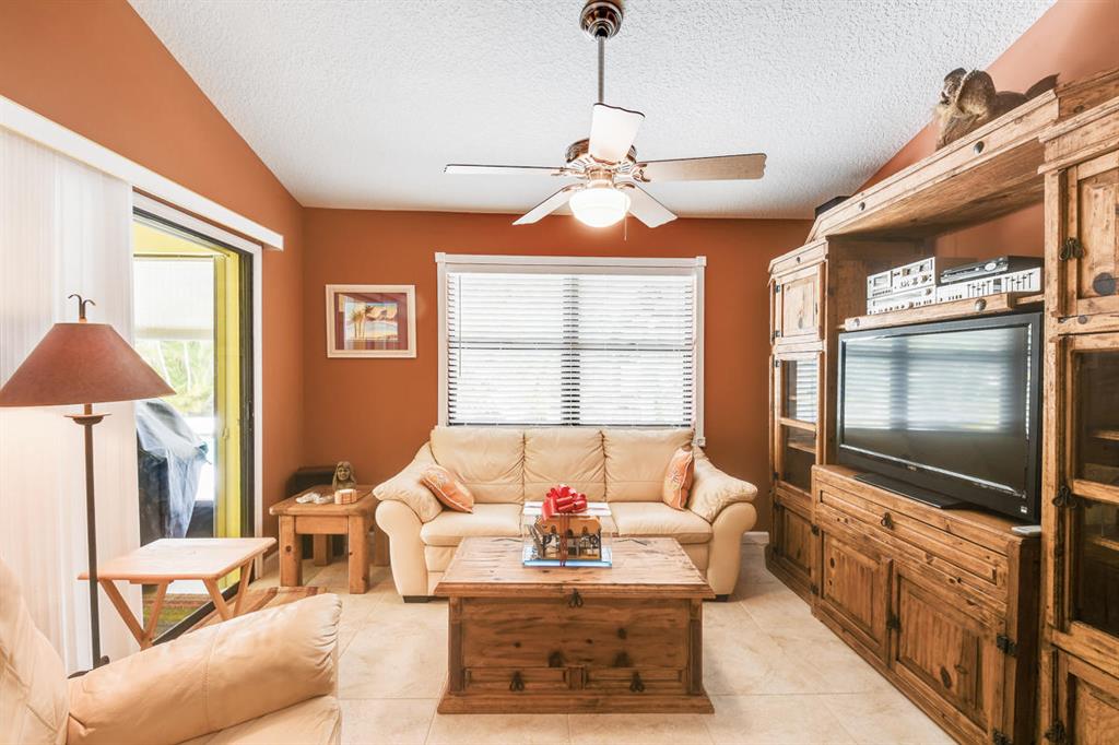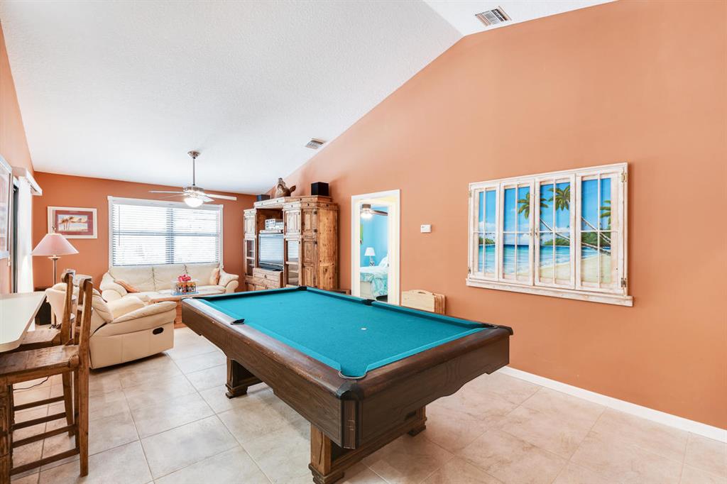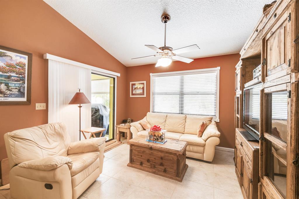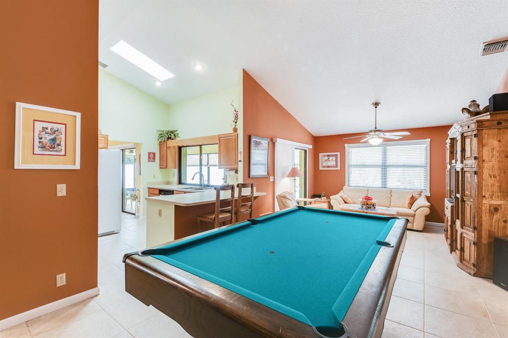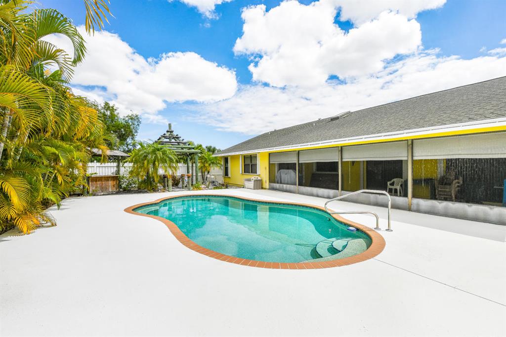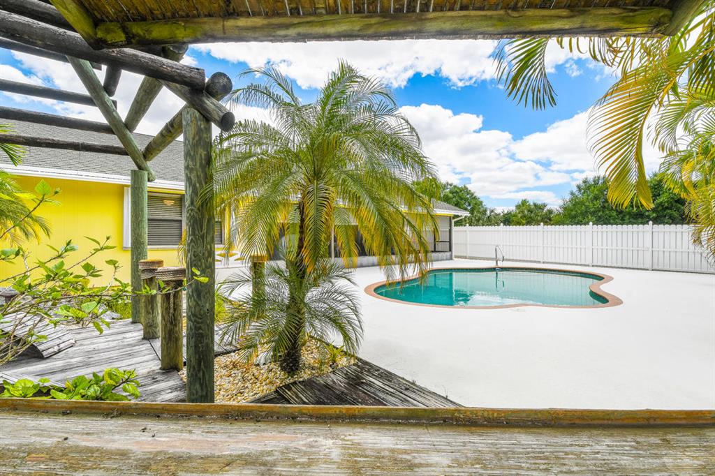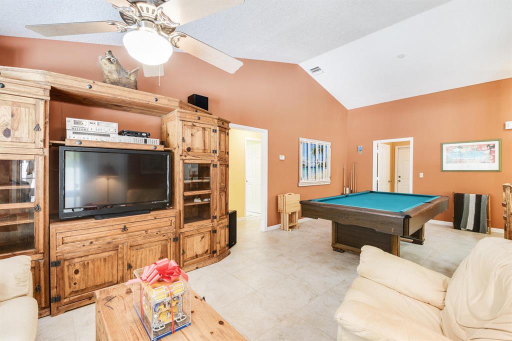 Summer time fun begins here for your family or a large gathering of friends. Bring your bathing suits and towels. Escape the summer heat and enjoy afternoons relaxing with private swimming pool and tiki bar...for those cold refreshments. Hugh roofed screened patio abuts pool. Pride of ownership shows. Recently painted with newer remodeled features in most areas. Large 16'' tile flooring, vaulted ceiling in main living area with soft colorful walls as a drop back accent. Large family room accommodates regulation pool table (for sale). Home has hurricane protection shutters. Exterior of home has ''hardi plank'' finish. Property uses septic system, city water. All sizes approximate. HOA voluntary/$40 per year. Furniture for sale separate. Sq. footage from house plans.