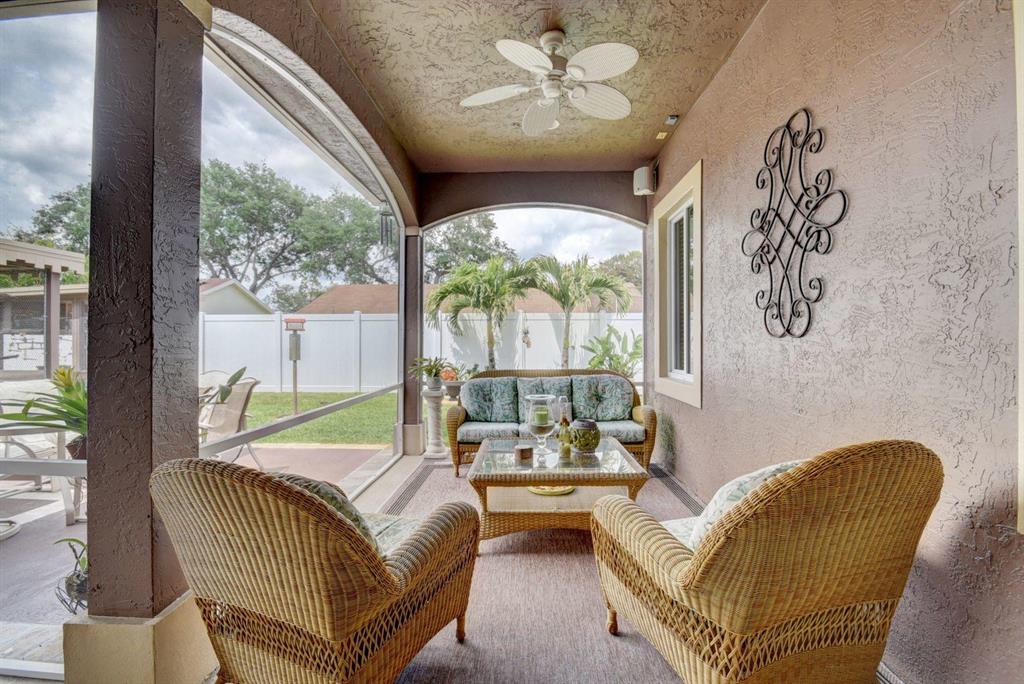 This home is one of a kind! It features two master suites, each with walk-in closets and en-suite bathrooms. Custom built in cabinetry throughout this home provide abundant and effortless storage. Inside you will find crown moulding, high hat lighting, granite countertops and backsplash in the kitchen. Outside features include, well manicured landscaping, a covered and screened patio, a built in shed for additional storage and fully enclosed yard with new pvc fence. Brand new hurricane rated garage door and an expanded double driveway. Most windows have impact glass for better protection. Sprinklers are on well system for water economy. Brand new roof with aluminum gutters, both A/C units about 7 yrs old and water heater 3 yrs old. Seller is willing to remove the aviaries in the yard.