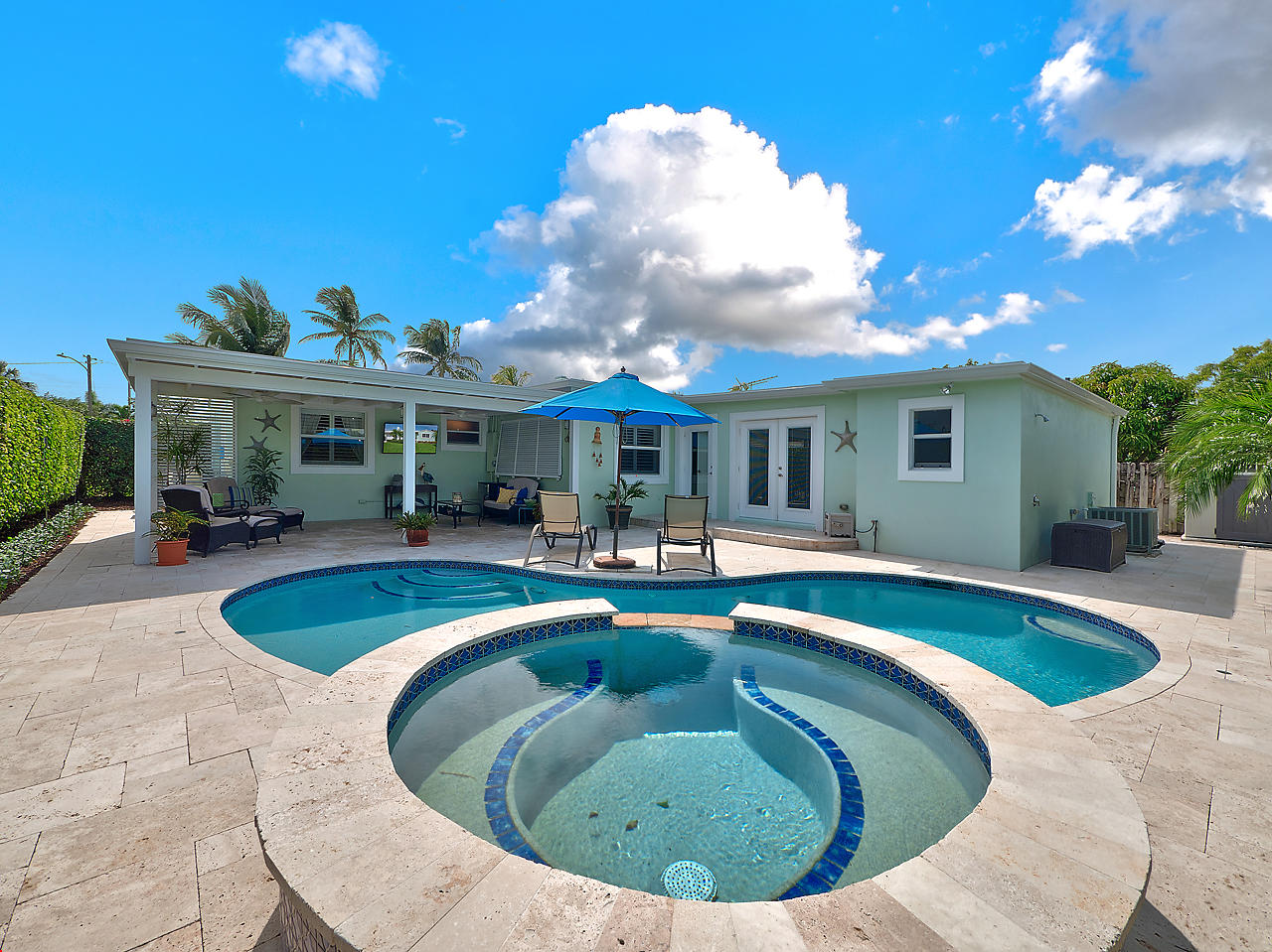 Classic 50's 3 bedroom, 2 full bath Ross pool home offering: Impact windows and doors, wood & tile flooring, updated grand 500SF master bedroom suite and bathroom added in 2012 overlooking resort style pool/spa with Toscana Travertine decking, covered patio with washed wood ceilings for great entertaining (2015). Other amenities include: one car attached garage, electric tank-less water heater in master bedroom, main house ac 2012, 2nd bathroom all new plumbing/electric gutted down to studs in 2014, exterior painted, split ac in master 2017 & more. Fully fenced and beautifully hedged back yard for the ultimate in privacy. WILL NOT LAST!