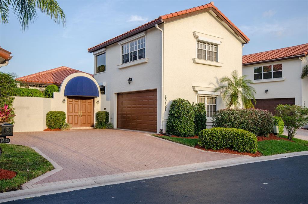Beautiful maintained courtyard home in exclusive guard-gated Boca Pointe. Spacious and private, this sanctuary features dual master bedrooms, one upstairs and one downstairs, each with walk-in closet and private bathroom. Bonus storage/hobby room! Vaulted ceilings with floor to ceiling windows, upgraded open kitchen & living areas to a private tropical courtyard & patio. Back yard faces lake, gentle eastern sun. Full house roll-down shutters, a newer roof and new AC unit. Via Stel (within Boca Pointe) is an intimate circle of 90 homes and has an impeccable community pool area. The low monthly maintenance fee includes lawn care, alarm system monitoring, and cable. Boca Pointe has an OPTIONAL country club program offering flexible memberships for those interested