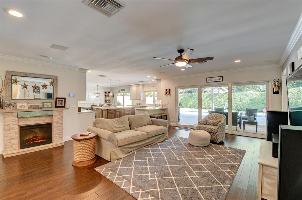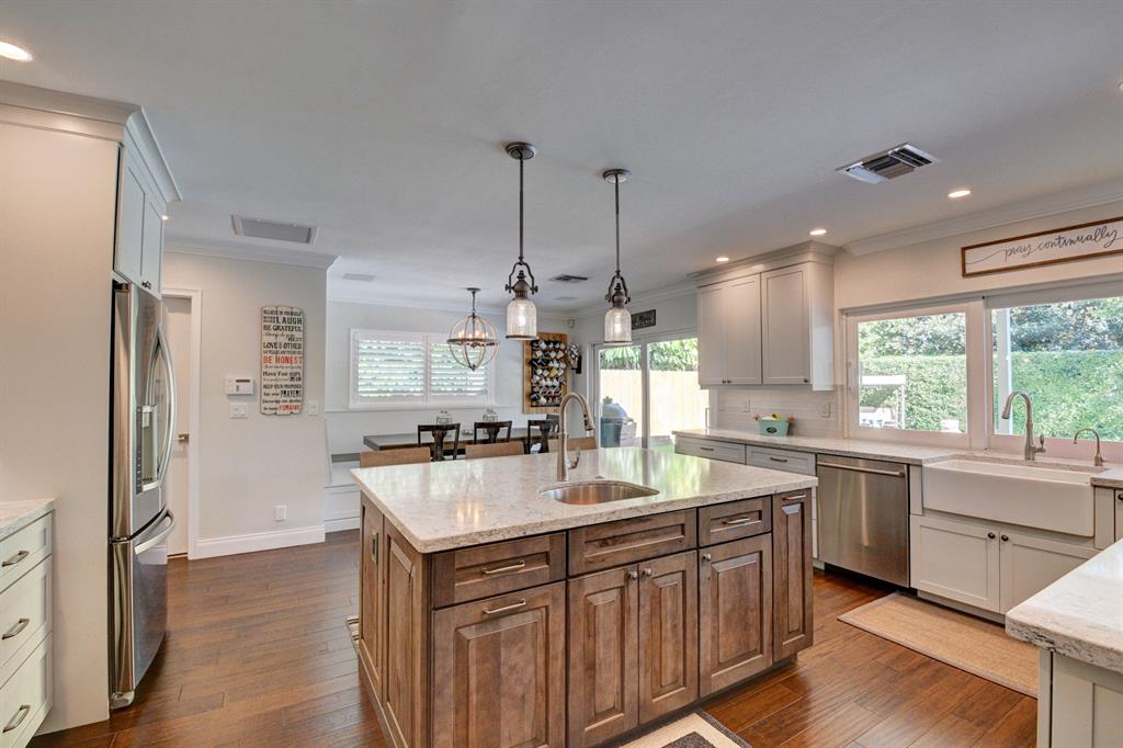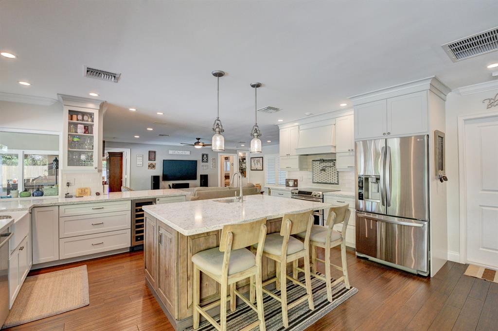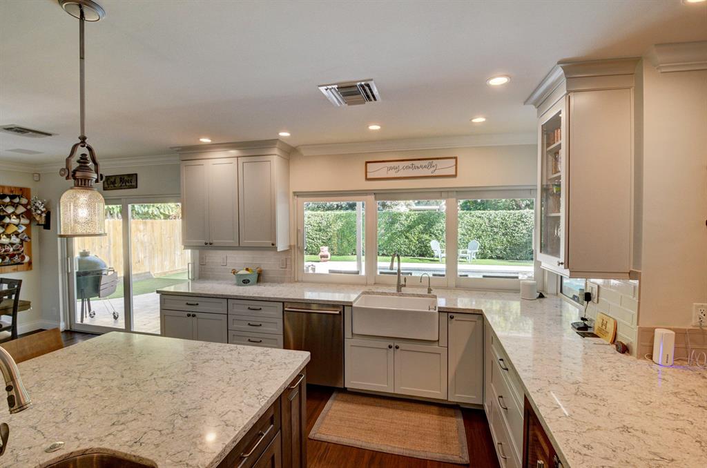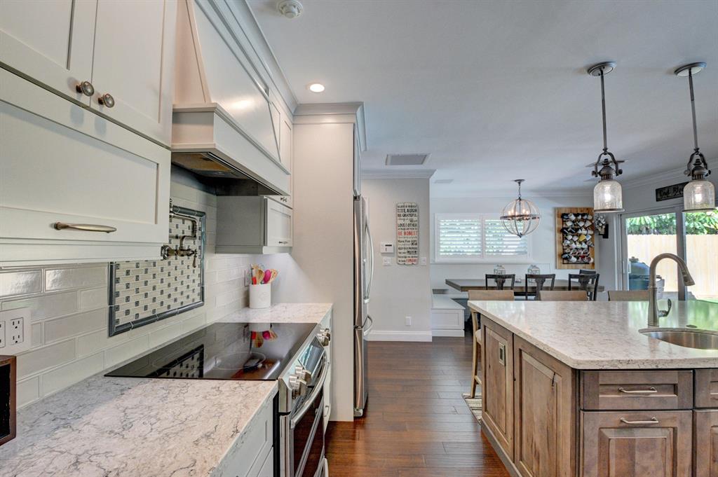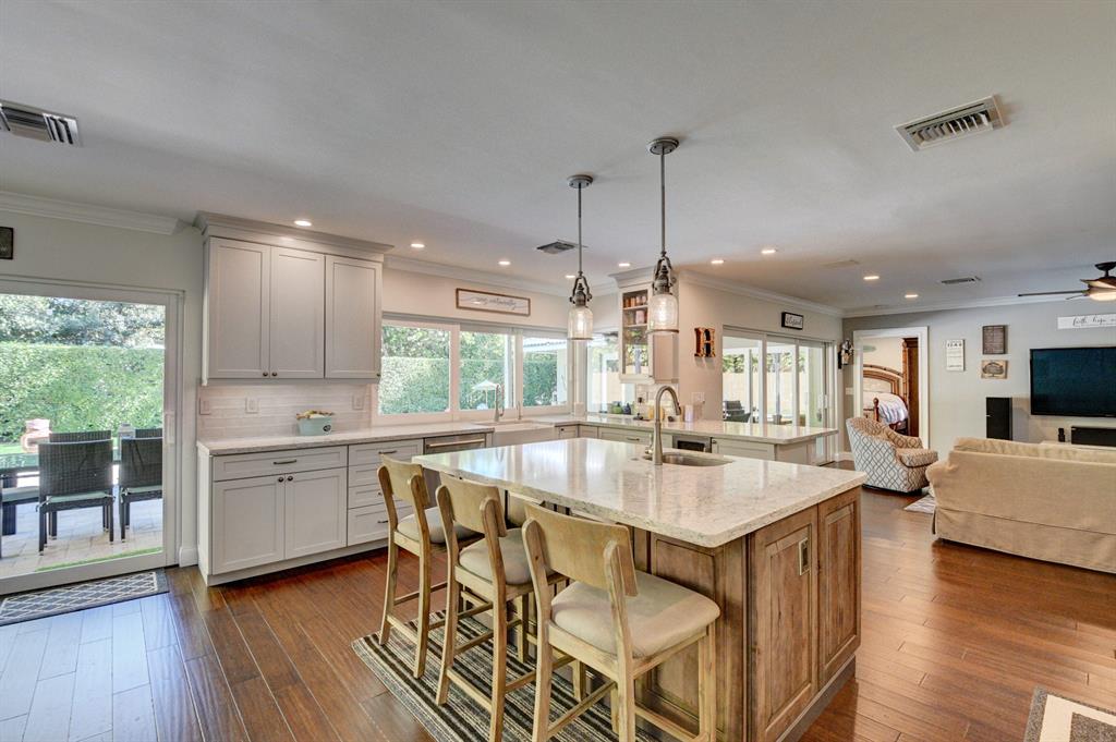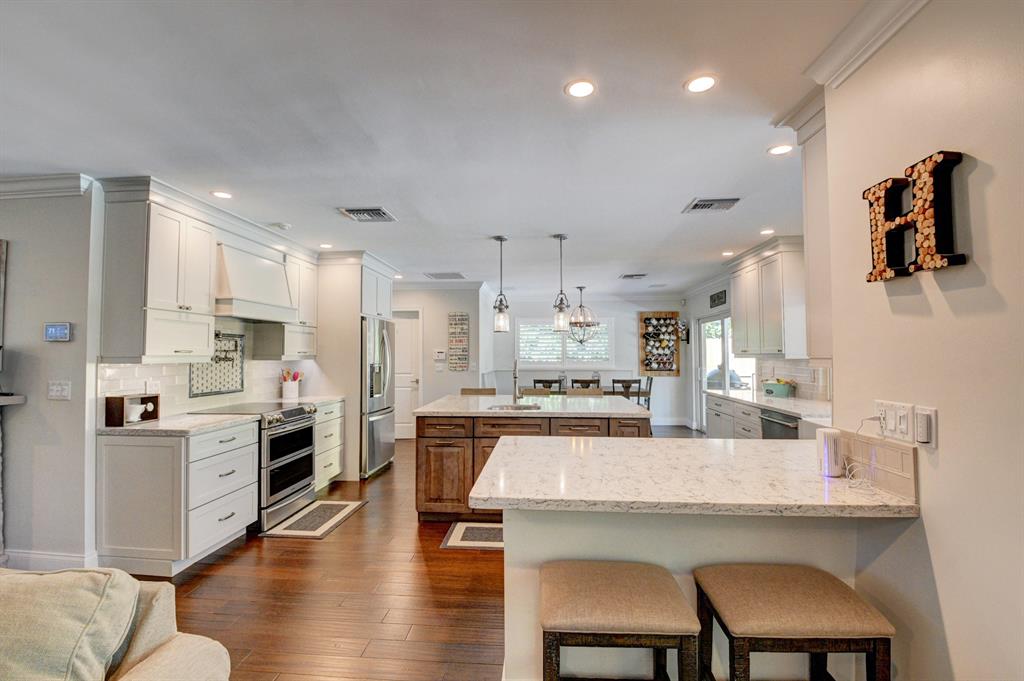 MOVE-IN READY! Gorgeous 3BR/2BA open floor plan pool home completely gutted with all new electrical, plumbing and appliances- remodeled in 2017. Custom kitchen with quartz countertops, dual sinks, wine refrigerator, smart double oven with pot filler, under cabinet lighting, custom built-in dining room, massive island with tons of storage. Sound proof laundry room, 400 SF air-conditioned garage.Upgrades include wood floors, crown molding and baseboards everywhere, Italian marble in bathrooms, large master bath with rain shower. All custom closets. Impact windows and doors. Turf backyard, large covered patio, saltwater pool, travertine pool deck and driveway.A-rated schools, close to shopping, dining and beach.
