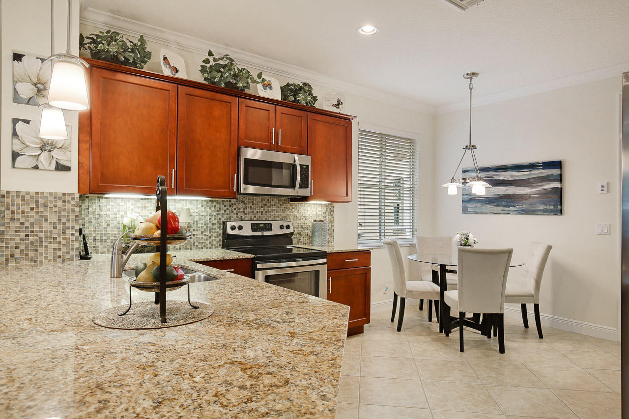 Move right in! This immaculate 3 bedroom 2 1/2 bath townhouse has been constructed (2014) to the highest quality standards and has been meticulously maintained by the original owners. All impact glass, volume ceiling, crown molding throughout, 18'' x 18'' ceramic tile flooring in living areas and plush carpet in bedrooms, extra high hat lighting in all rooms. Granite counter tops, stainless steel kitchen appliances, breakfast area as well as breakfast bar. Step outside into your private garden complete with screened patio and maintenance free grass! Gated community, lakefront clubhouse with pool, fitness center, billiards, kitchen and BBQ.