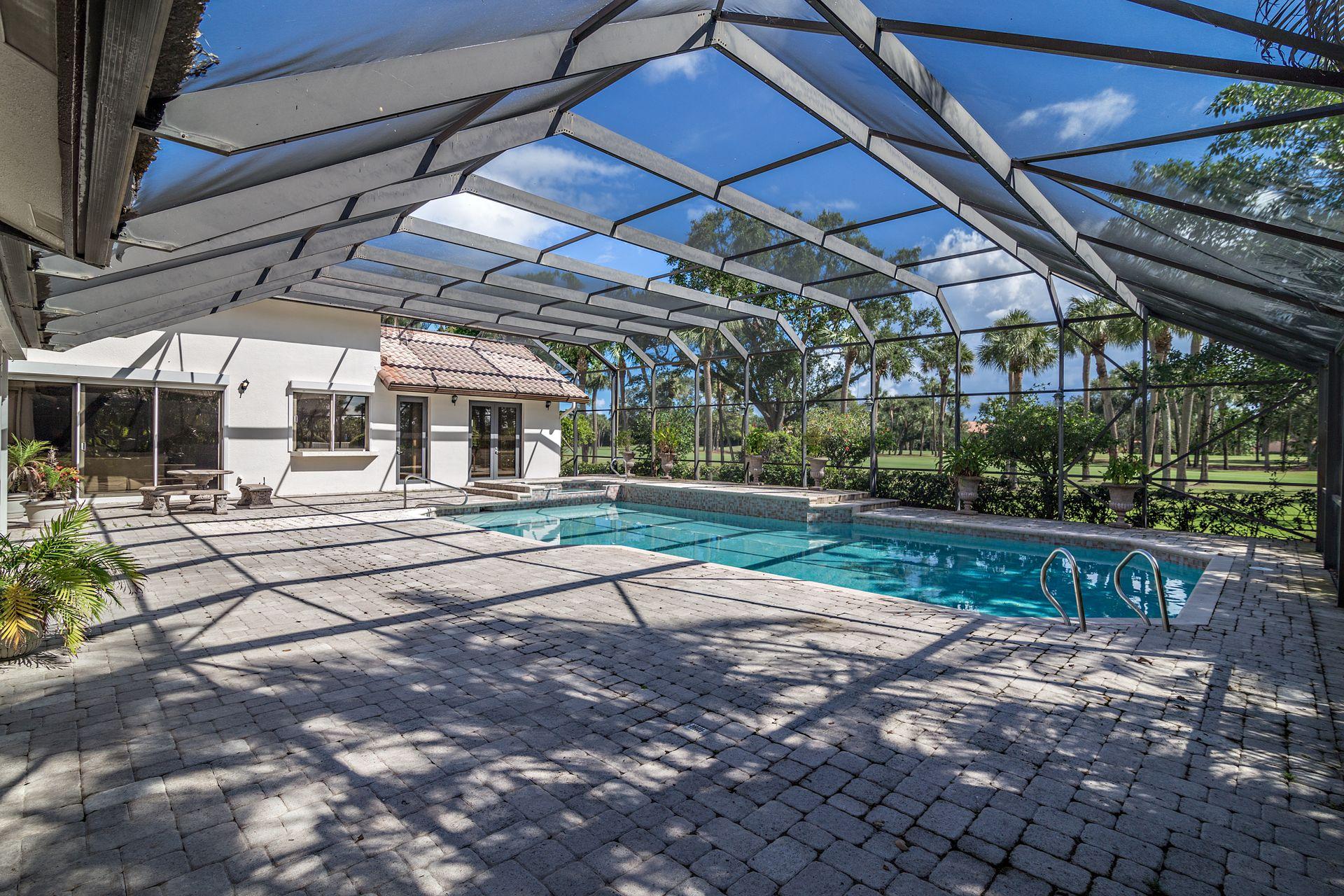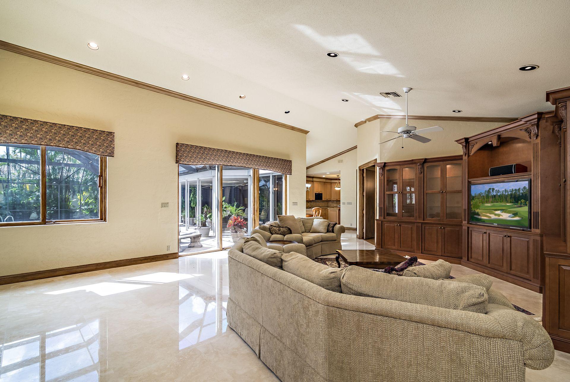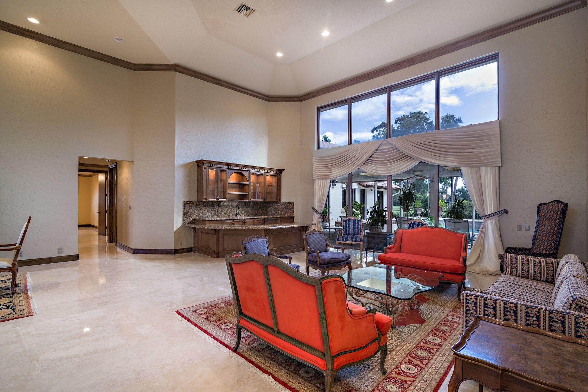 Situated on a double fairway lot with 4,417 SF of air-conditioned living space, this 4 bedroom, 5.5 bath pool home is perfect for entertaining. Features include a thoughtfully designed split bedroom plan, high ceilings, marble and wood flooring, and sun-splashed oversized screened pool; formal dining room, living room with wet bar and spacious family room. There is a whole house generator, partial impact glass and electric shutters for storm protection. Mandatory Club Membership Required.