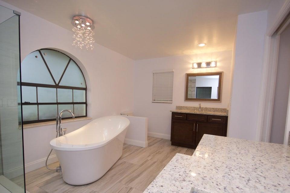 Mediterranean home featuring a 4 bedroom 3 full bath home with a 3 way split floorplan, volume and vaulted ceilings, renovated with new hardwood flooring, renovated baths with soaker tub in master, very spacious cream wood kitchen cabinetry, tumbled marble backsplash, with all new stainless appliances open pool and patio. spacious yard on quiet interior lot. See document section for more details.