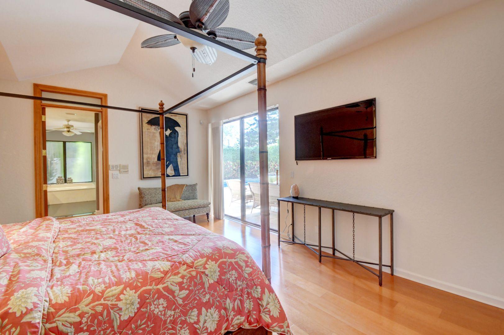 Hard to find single story with 3 bedrooms and a den. This great room home has a fabulous gourmet eat-in kitchen with butler's pantry and wine cooler. The over sized master has a dual sink bath with roman tub, separate shower, toilet and bidet. The floors in the master are wood while the living areas and remainder of house has ceramic tiles. There is a formal dining area, two ensuite bedrooms, and a great den or office. The deck and pool area are sunny and in a private setting. Buyer will be responsible for $2000 BSMA fee.