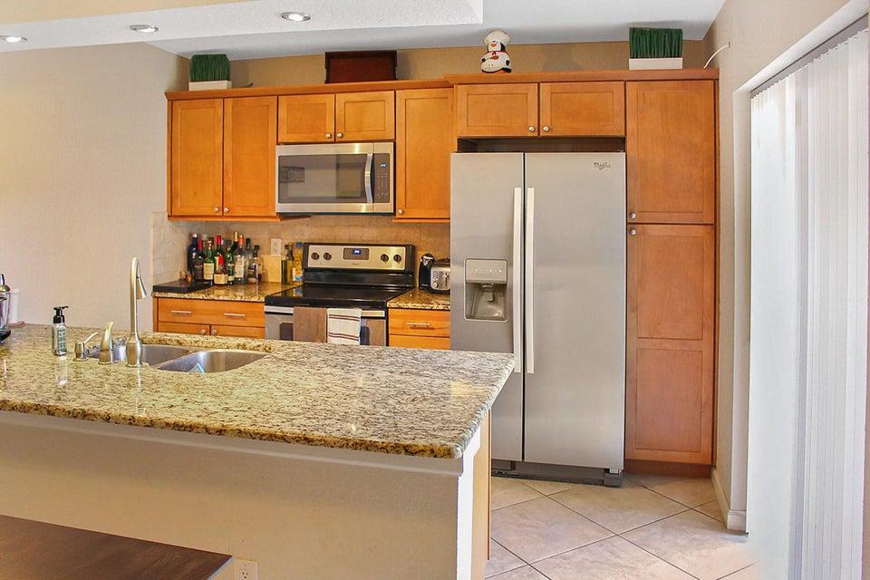 Gorgeously remodeled 3 br/2.5 bathroom town home in a fantastic location! Fully move in ready! New kitchen w/ granite countertops, maple wood cabinetry w/ pull out shelving + soft close drawers, and a large breakfast bar with attractive recessed lighting. New 2017 stainless steel appliances, dishwasher, refrigerator, microwave, stove, washer and dryer. New light fixtures, plus updated vanities + granite countertops in all 3 bathrooms. Large tile flooring downstairs, new espresso wood laminate flooring upstairs and knock down walls throughout the house. Oversized master bedroom has double walk-in closets with custom shelving built-in. Master bathroom has plenty of extra custom cabinet space with a huge roman tub. As for the outside, there's a huge brick pave courtyard/patio that's fully