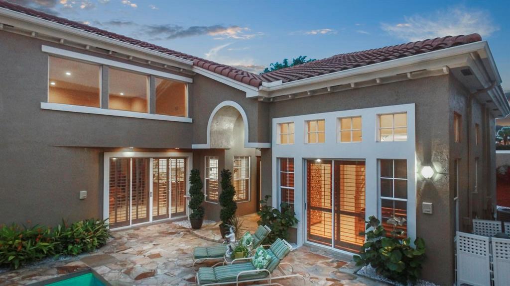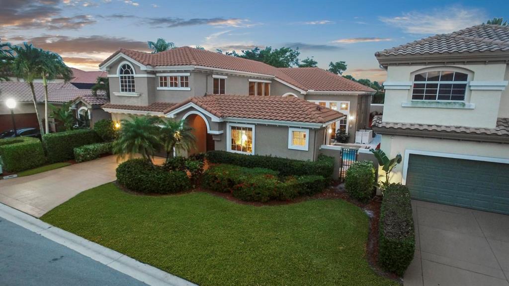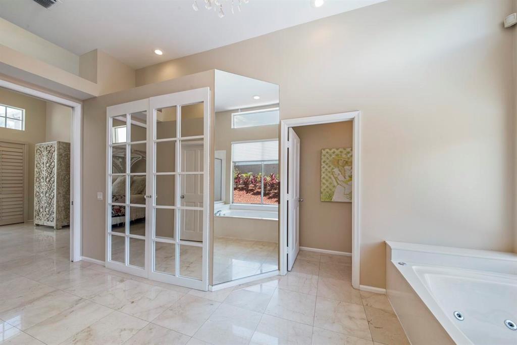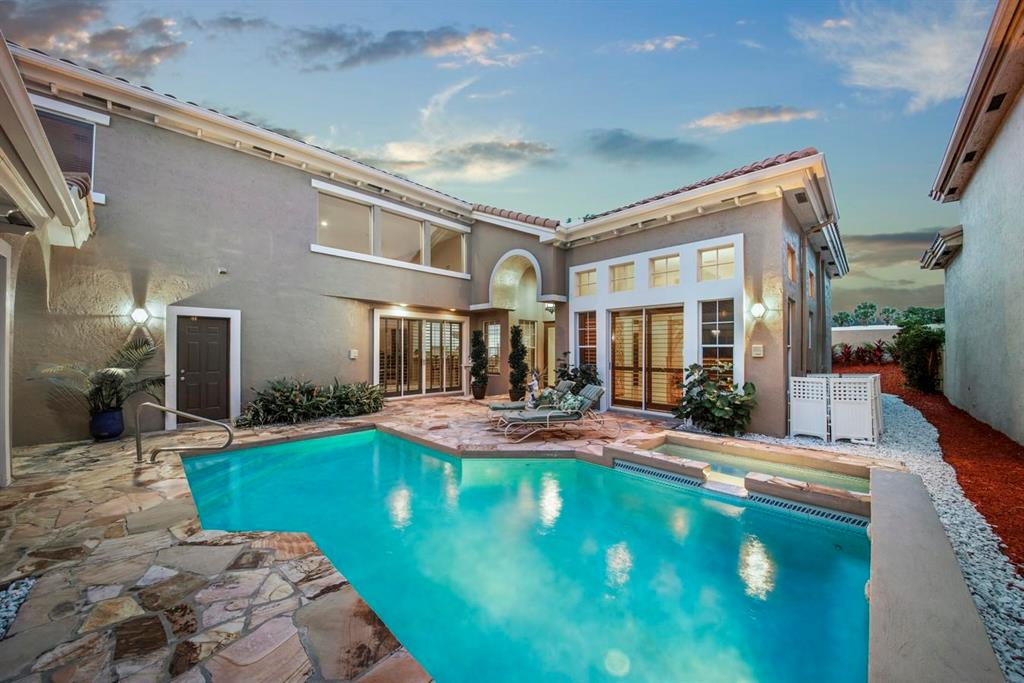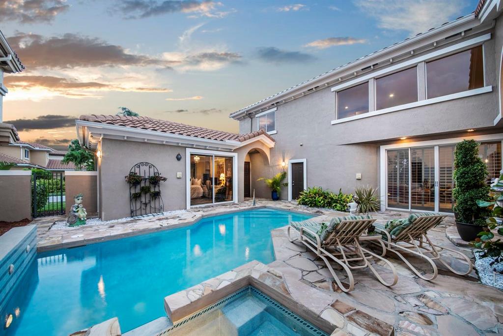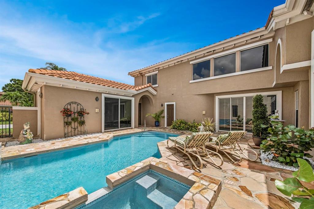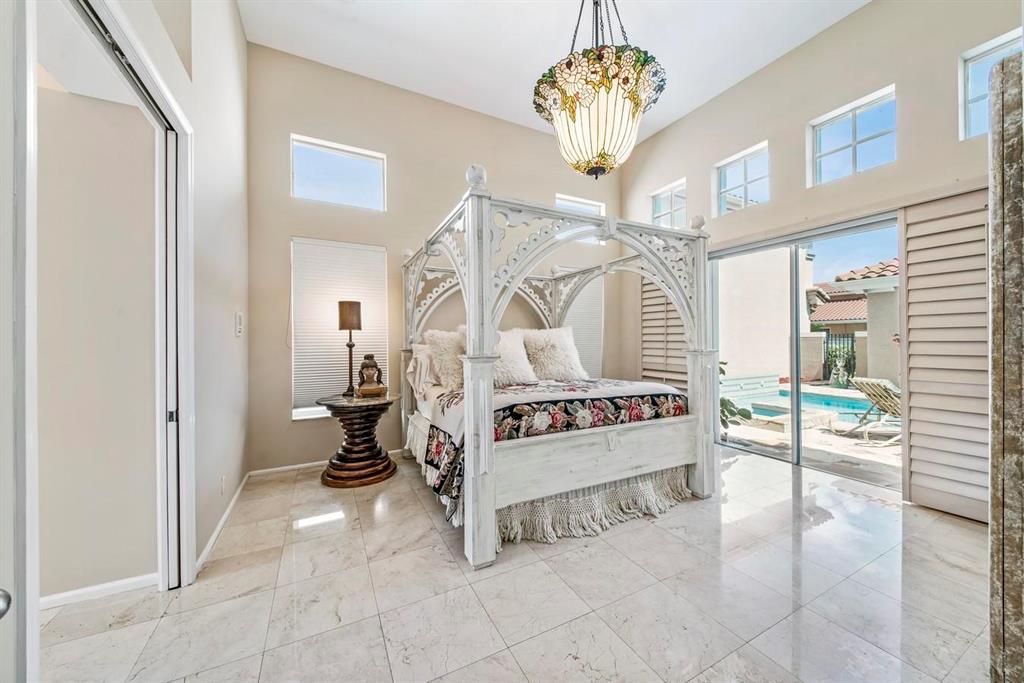 Well-appointed 4 bedroom, 3.5 bath Redondo model home in the highly sought after Santa Barbara community. Designed for entertaining on a grand scale with a 3,036 SqFt open floor plan which includes a formal living room, dining room, family room and a guest house. The dream kitchen is equipped with classic white cabinets, granite countertops, full granite backsplash, newer appliances and a snack bar. The luxurious master suite has an oversized slider, marble flooring, his and hers walk-in closets, dual sinks, a jetted tub and a walk-in shower. Neutral tile, high hat lighting, a new roof (2014) and an abundance of natural light complete this spectacular home. Step outside to discover paradise with a spacious courtyard, a custom pool, flagstone pavers and tropical landscaping.