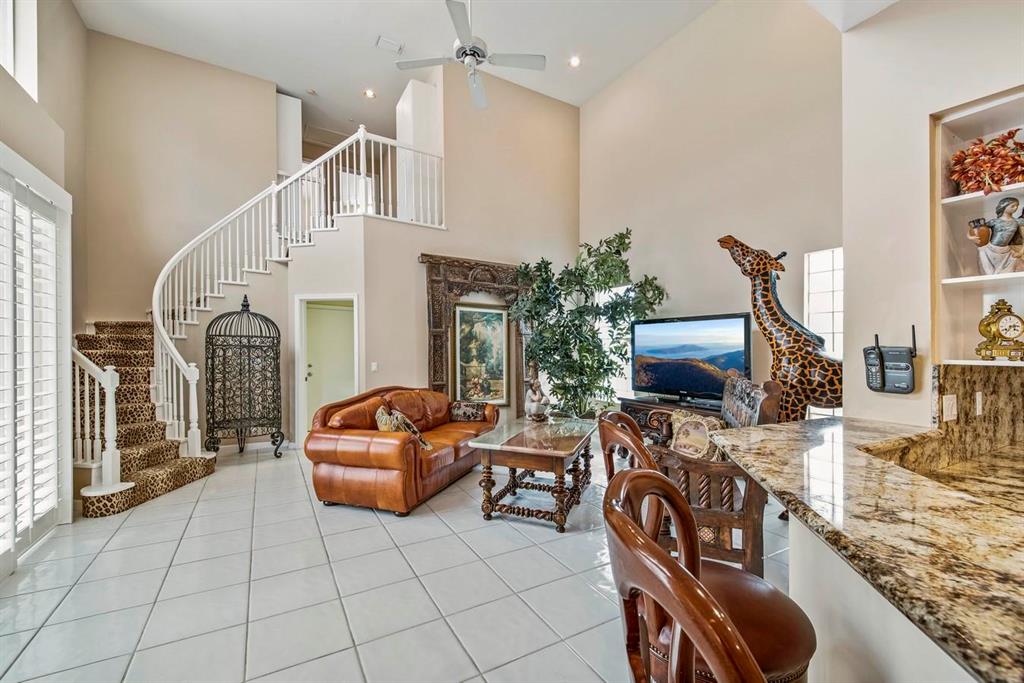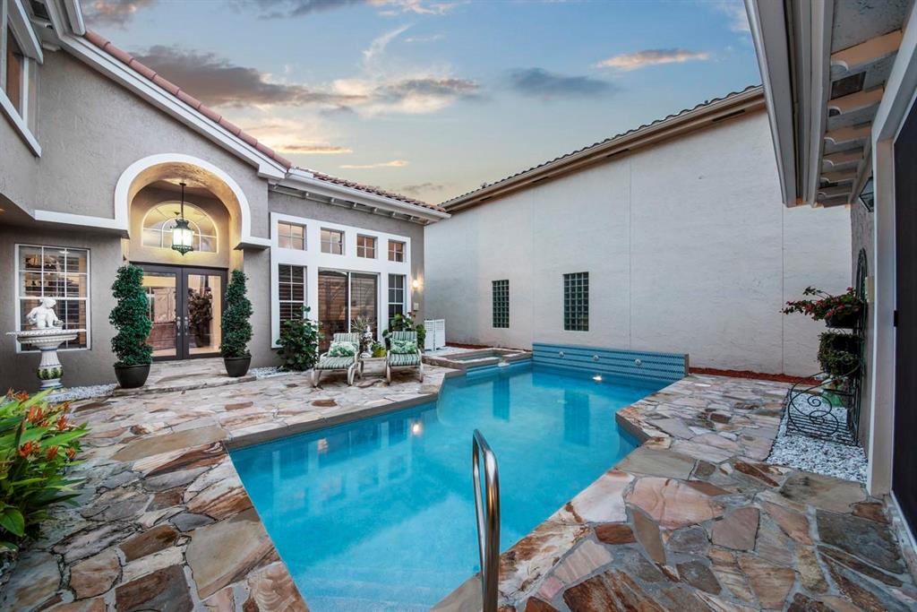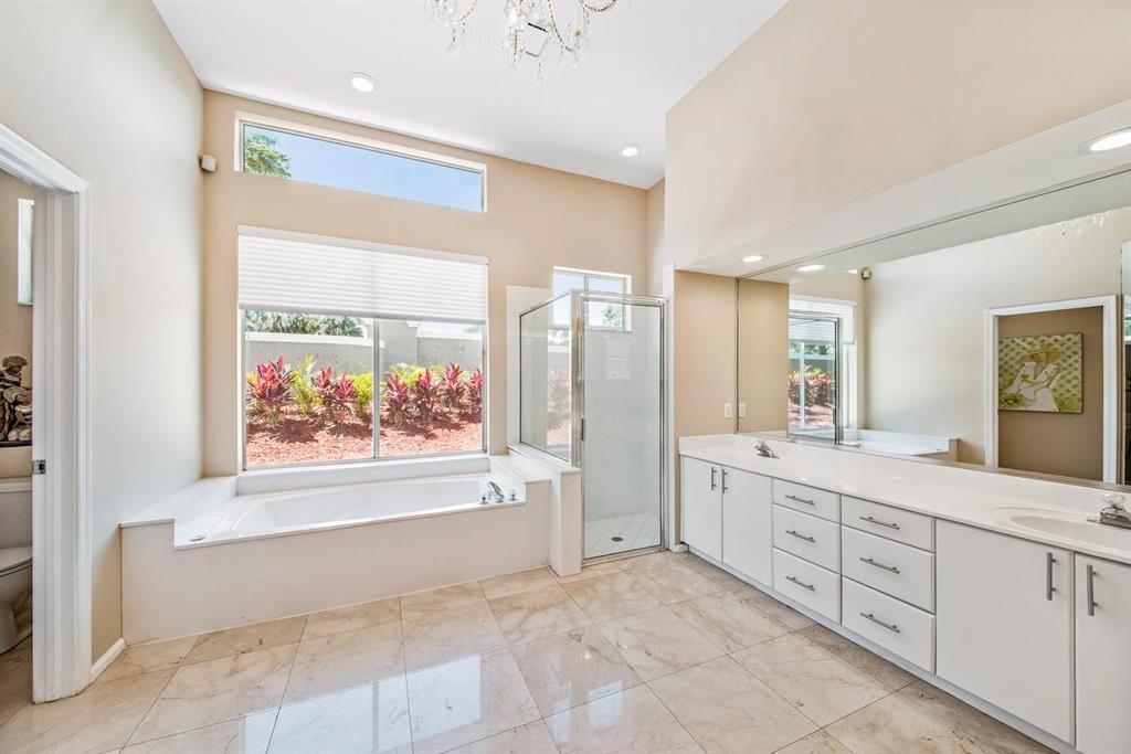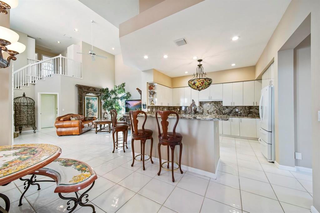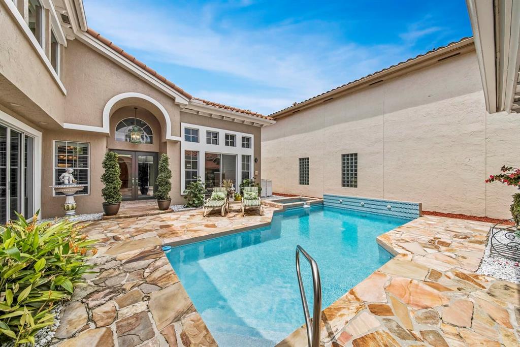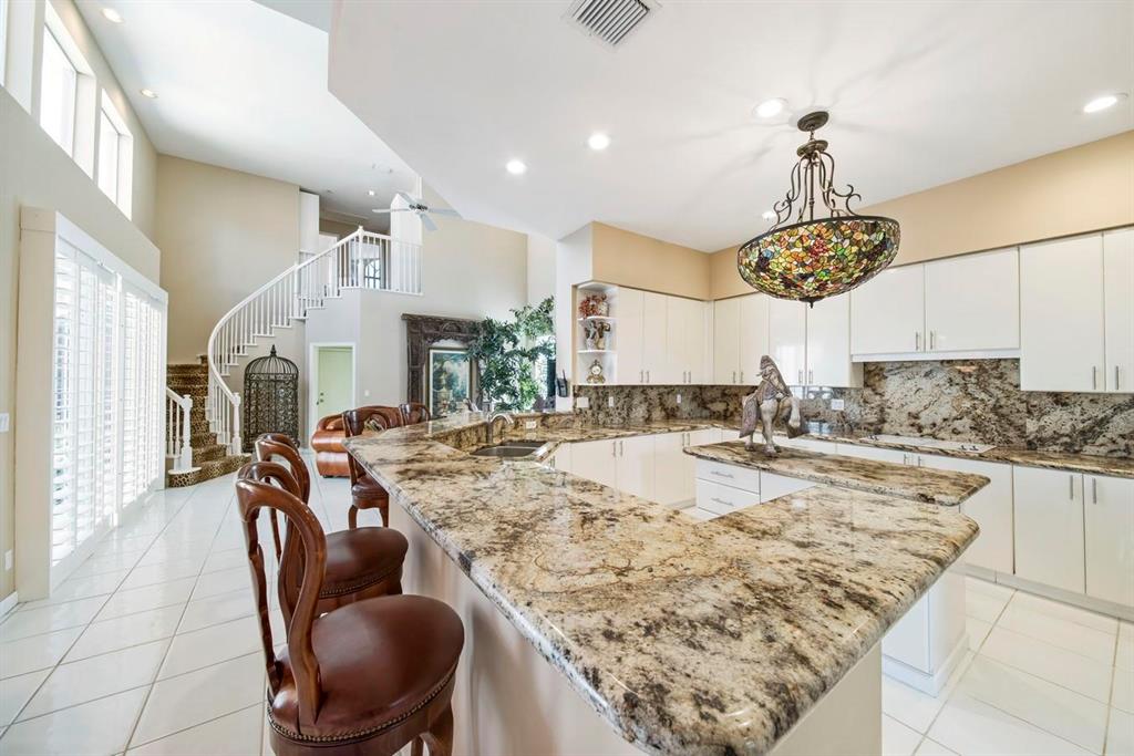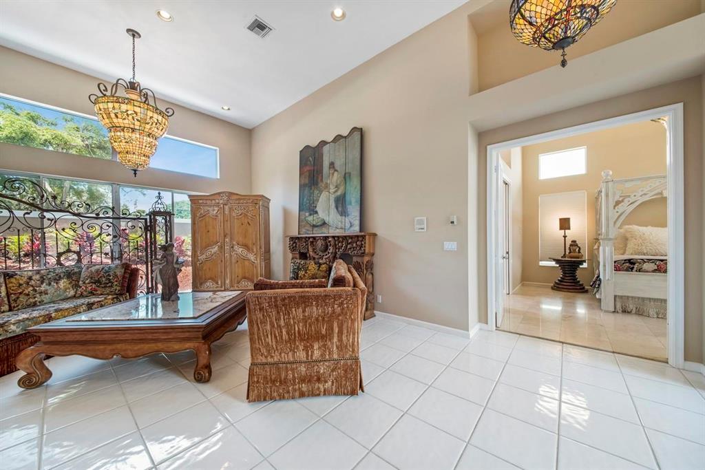 Well-appointed 4 bedroom, 3.5 bath Redondo model home in the highly sought after Santa Barbara community. Designed for entertaining on a grand scale with a 3,036 SqFt open floor plan which includes a formal living room, dining room, family room and a guest house. The dream kitchen is equipped with classic white cabinets, granite countertops, full granite backsplash, newer appliances and a snack bar. The luxurious master suite has an oversized slider, marble flooring, his and hers walk-in closets, dual sinks, a jetted tub and a walk-in shower. Neutral tile, high hat lighting, a new roof (2014) and an abundance of natural light complete this spectacular home. Step outside to discover paradise with a spacious courtyard, a custom pool, flagstone pavers and tropical landscaping.