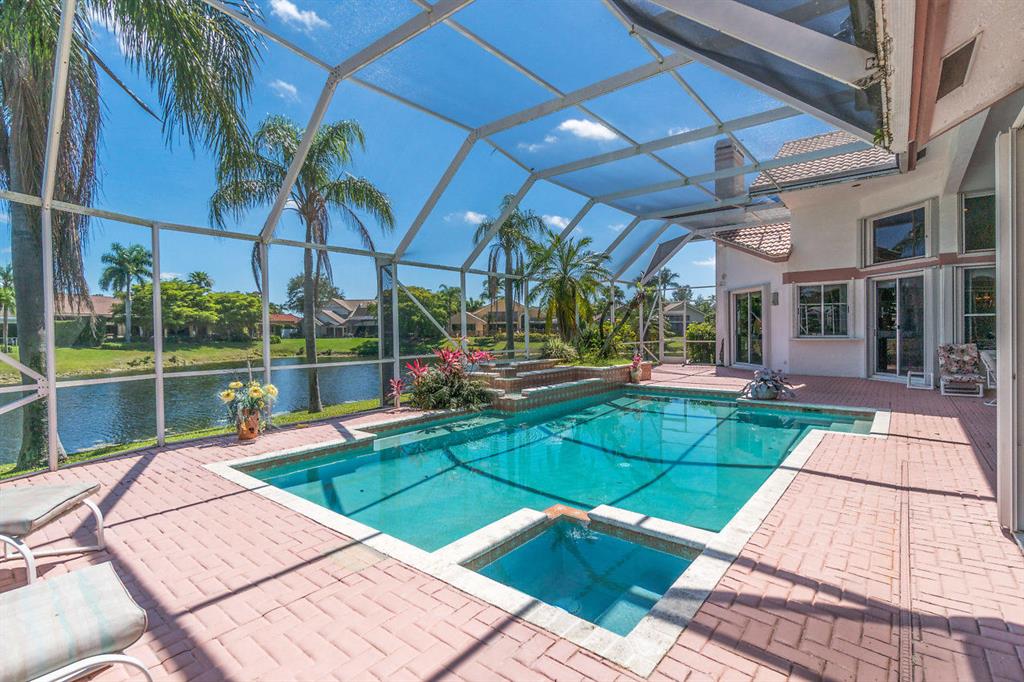 Elegant custom built home situated on a point lakefront cul de sac lot located in Boca Pointe's prestigious community Encantada. This home is super light and bright and boasts 4 bedrooms, 4 bathrooms, a 3 car garage, spacious floor plan, split bedrooms, inground pool, volume and cathedral ceilings, recessed lighting, central vac, full hurricane shutters and beautiful scenic broad windows on 1/3 acre, original owner.New ceramic tile main living area, new carpet in the bedrooms and family room.Master bath and cabana bath newly updated. New double entry decorative glass front door. Huge screened outdoor space surrounding the pool area and covered patio with gorgeous panoramic views. Exceptional home in a great location within Boca Pointe Country Club which offers optional membership.