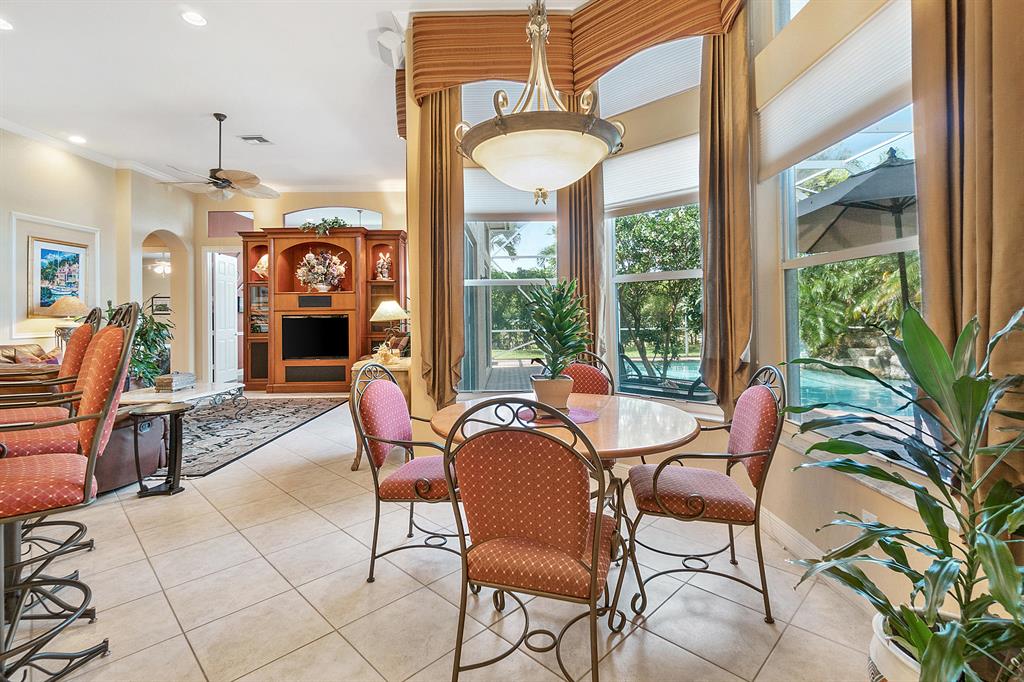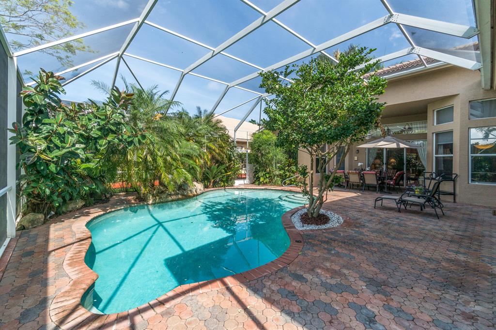 This lushly landscaped one-story home sits on a private treed lot backing south.Great split bedroom plan with 5 bedrooms,game room,3 baths and a 3 car garage.Tile has been installed on the diagonal.There are wood laminate floors in all of the bedrooms and game room.Perfect for entertaining,there is a formal living room,dining room and butler's pantry/bar.The gourmet kitchen features wood cabinets,granite countertops,tumblestone backsplash and all the bells and whistles!There is a center island,snack bar and separate breakfast nook.The family room,with built-in,is open to the kitchen.The game room is a perfect place for a pool table or playroom.The master suite features a sitting area,outfitted walk-in closets and luxurious marble bath.Backyard resort-covered,screened patio and heated pool.