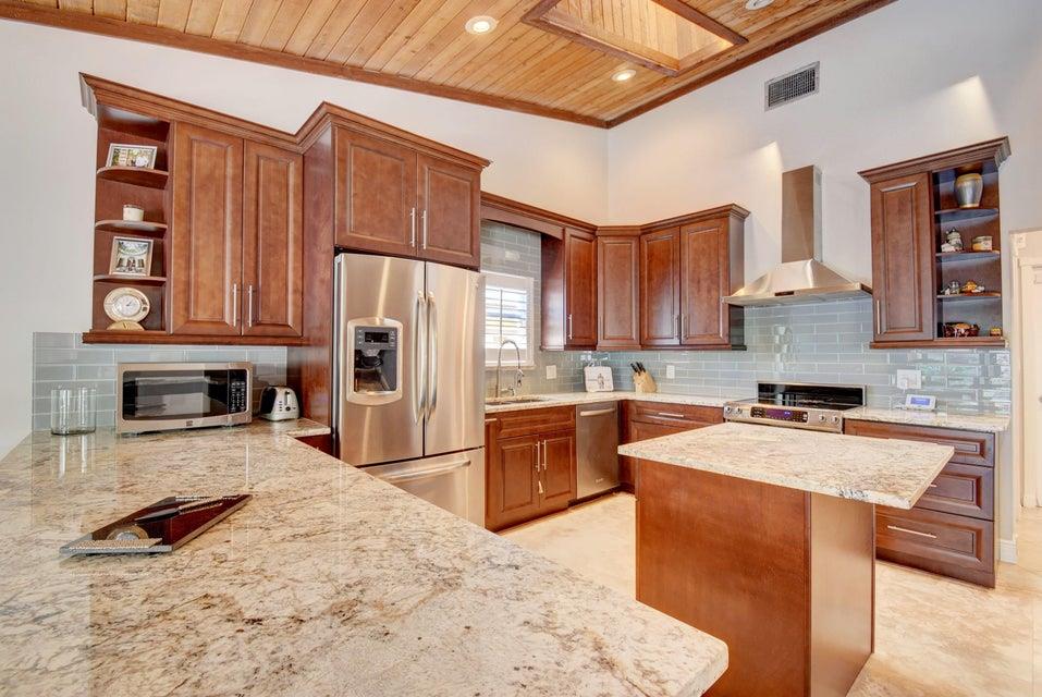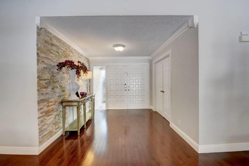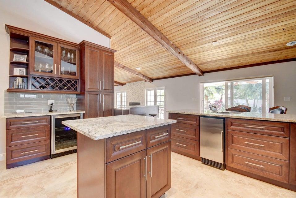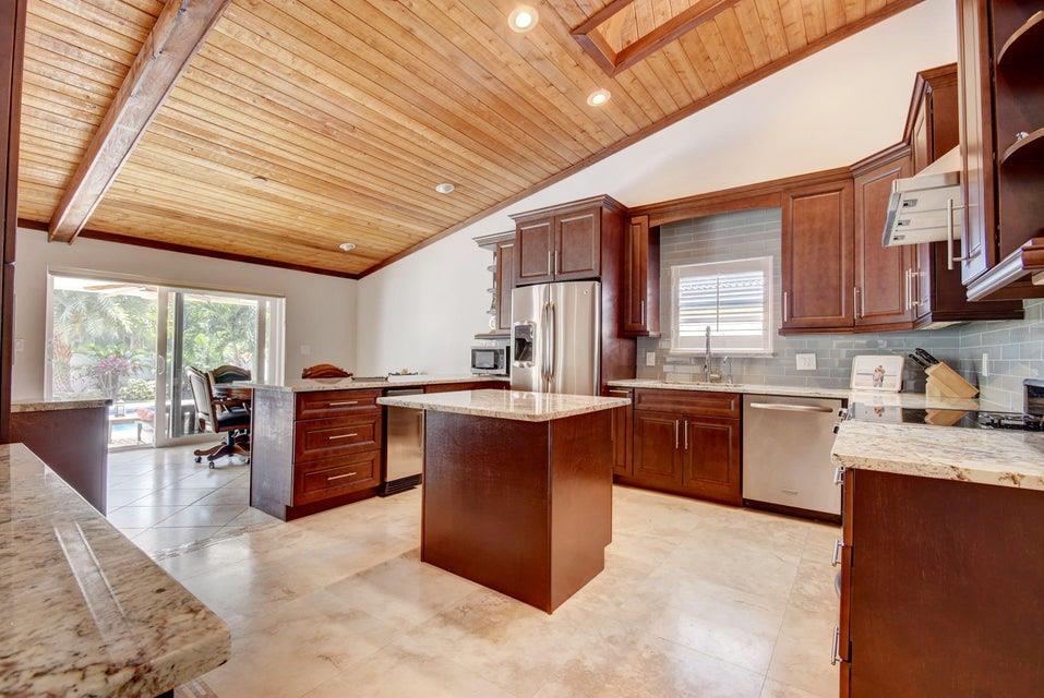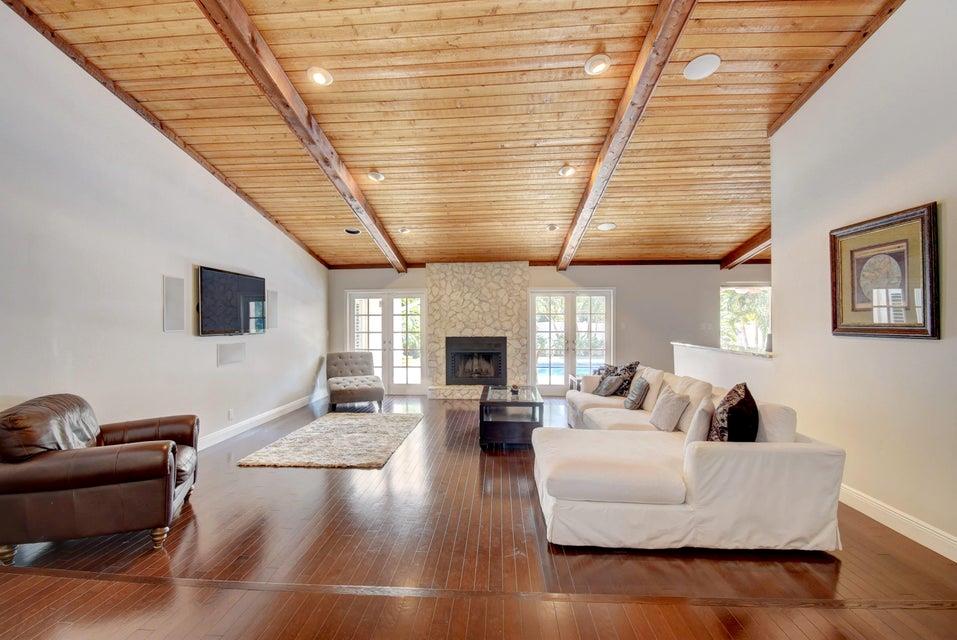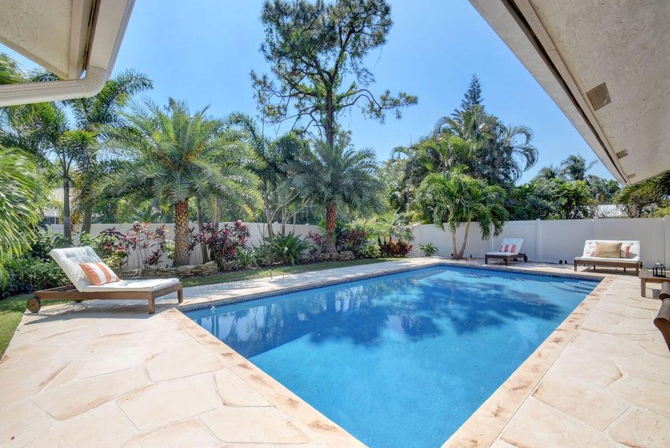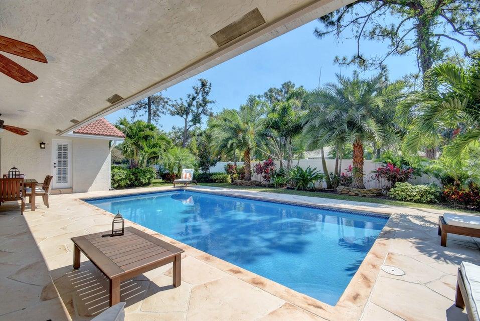 Cedar vaulted ceilings, wood floors and a working fireplace contribute to the unique ambiance of the 4 bedroom 2 1/2 bath captivating home. Updated kitchen and bathrooms with an abundance of storage make this home very desirable. The pool and patio area become your very own private retreat with no view of neighbors anywhere. Lush landscaping and built-in sound system complete the home. Low HOA and great location in a fun-filled neighborhood with park, tennis courts and pond close to Town Center mall, Delray Beach and trendy Atlantic Avenue.