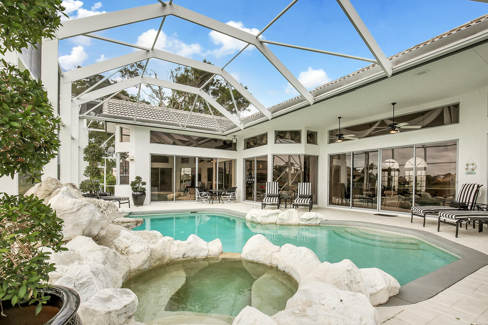 Custom estate home in popular Encantada is sure to WOW any buyer. This one story former model home sits perfectly on large lake lot next to park. Walk into this upscale home and see endless lake views, custom touches throughout, loads of updates and sprawling living space. Main living areas feature beautiful hard wood floors and custom carpet in living room. The kitchen is open to the family room and has granite counters, stainless appliances, and large breakfast area with views of pool and lake. Large family room has built in for flat screen TV and also has step down bar with sink and brand new frig. Master bedroom has two walk in closets with custom built ins, beautifully updated master bath with double sinks, large shower, brand new bidet and spa tub with large garden window.
