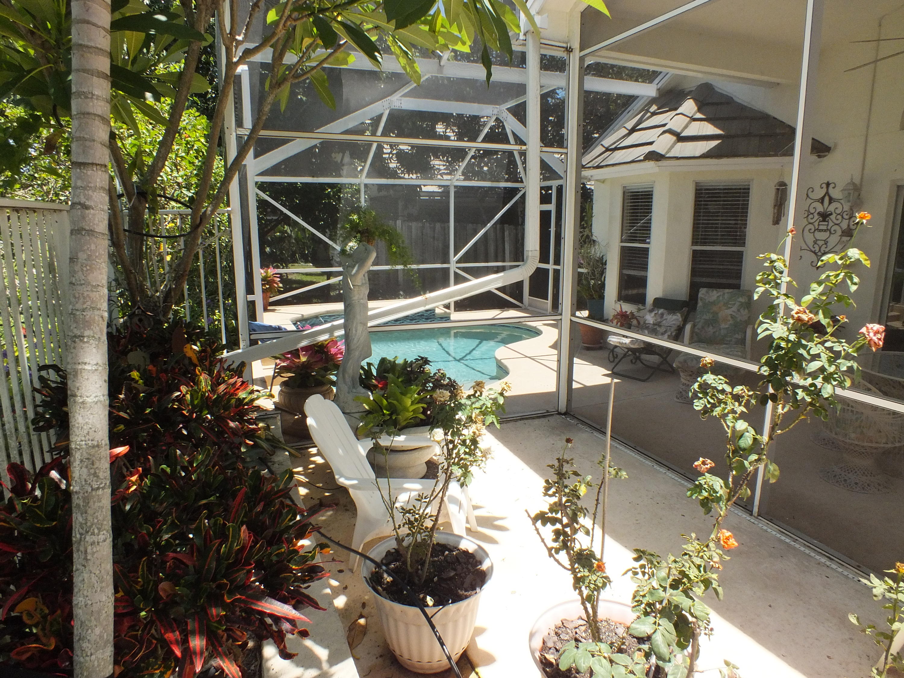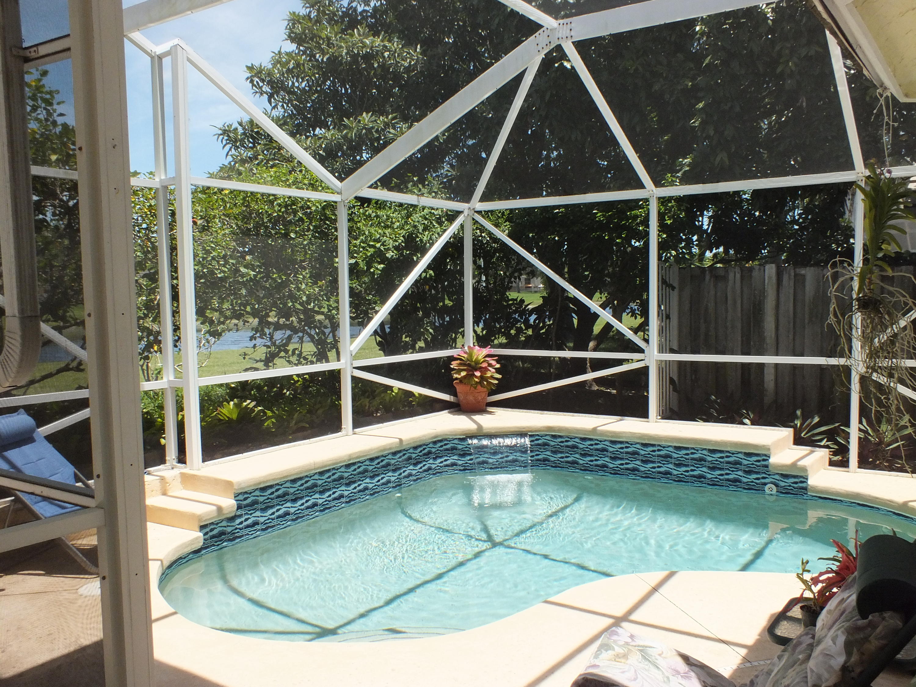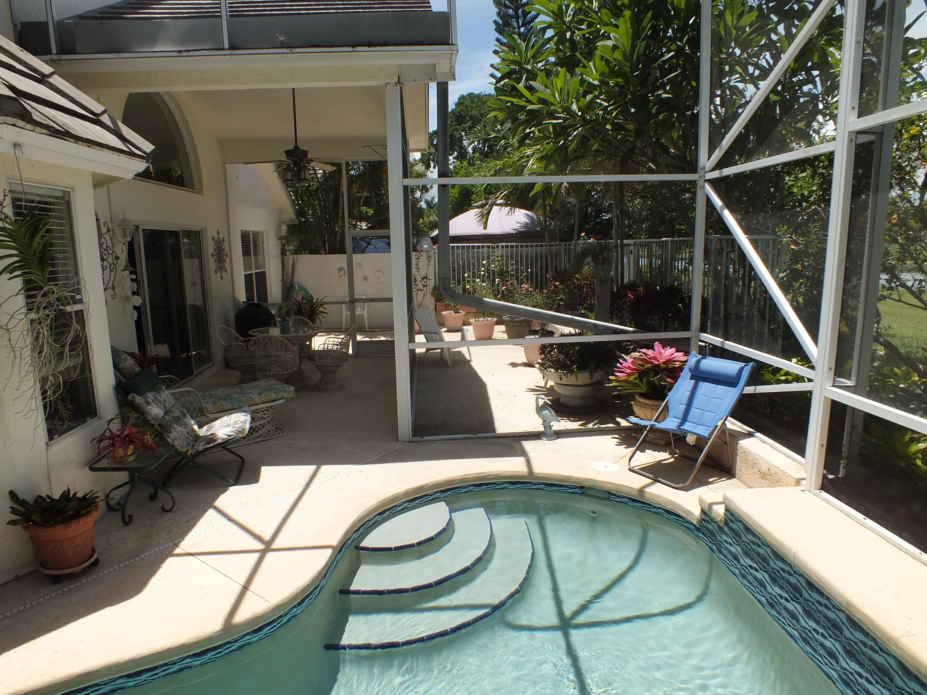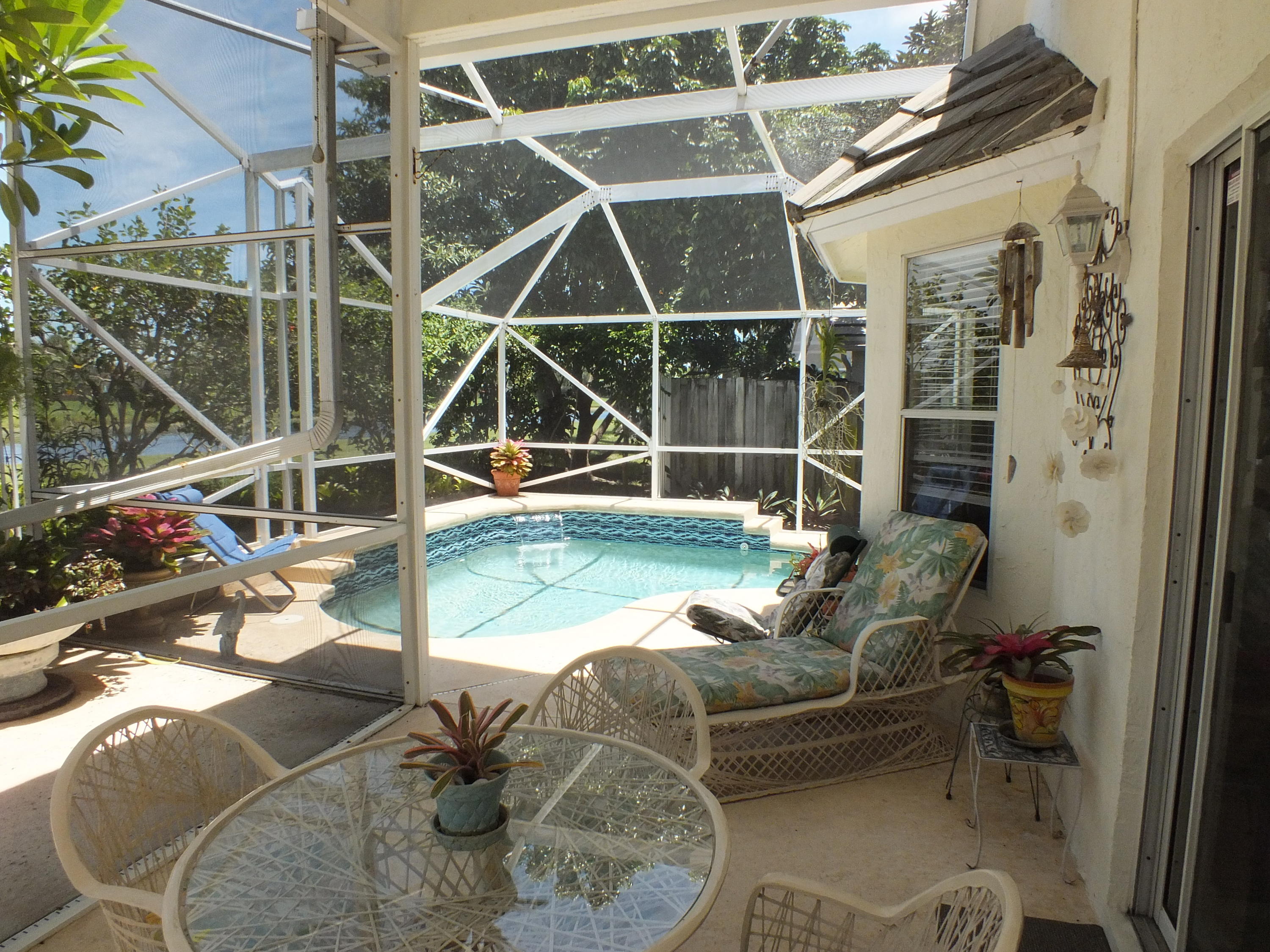 Maintained 3 Bedroom 2 Bath Pool home with 2 Car Garage on Private Cul-De-Sac located in an upper corner of Afton Ct., which has additional driveway space and a nice feeling of privacy, as it does not face any streets. Lots of Light throughout this open floor plan with expansive views of the long canal behind the house and views of water from the bay windows in the kitchen, Bedroom and from the patio doors. The canal is a water supply canal so there is no boat activity, only the peaceful rolling water. Ibis, Herons, and Spoonbills are frequent visitors to the canal. The large screened back patio area features a small pool with a waterfall. The back area also has a nice private feeling with fencing and privacy walls on both sides.