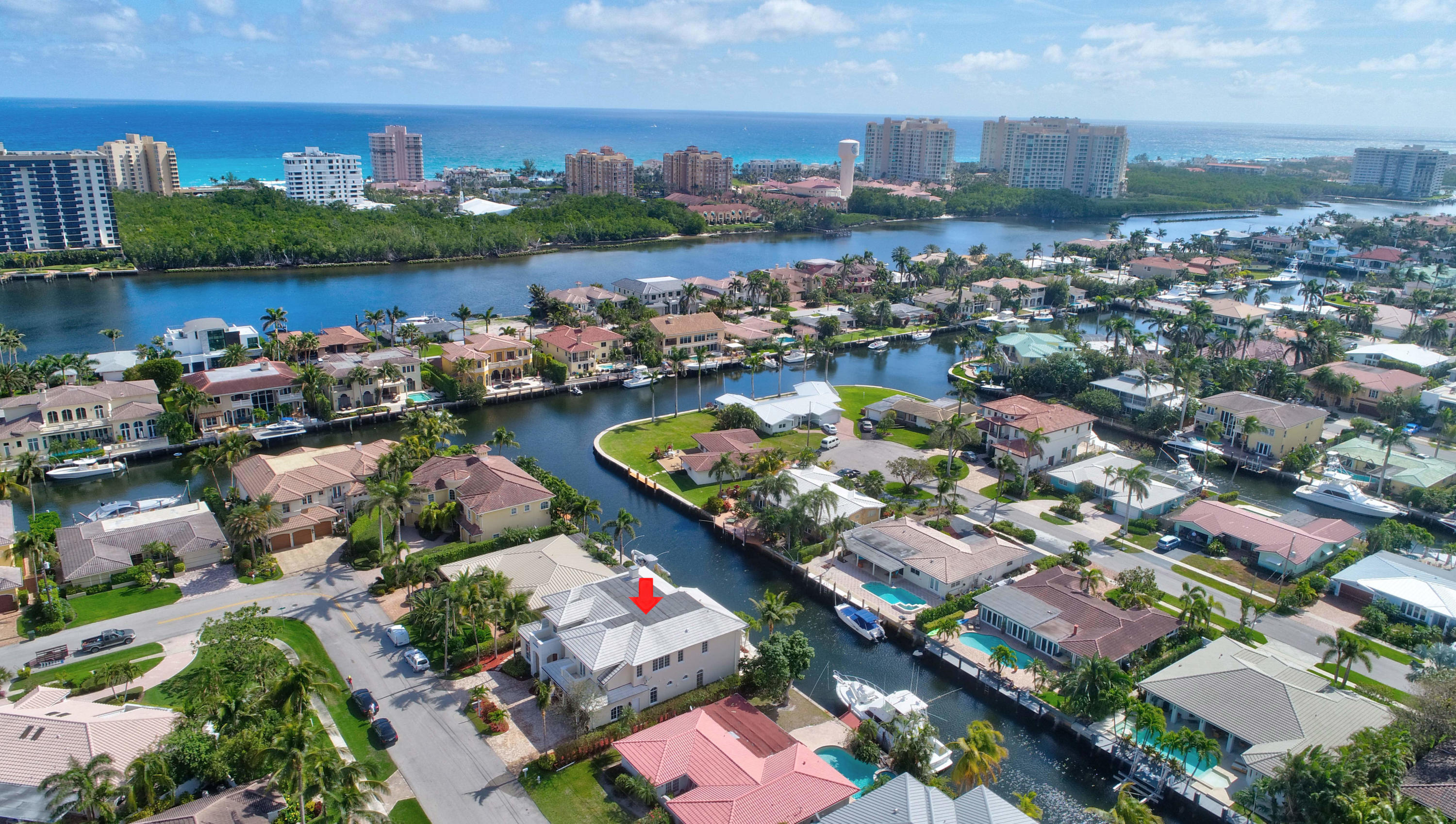 This stunning home is awe-inspiring with its open floor plan, 80 ft of deepwater & the desired Southern exposure. Located on the most desirable street in Boca Harbour across from Boca Bay Colony. ICW just a few minutes away by boat. Featuring 5 BD ensuites including a VIP Suite on the first floor that has its own sink & refrigerator. For entertaining it has a sit down bar, fully equipt butler's pantry,a grand fireplace, high end finishes including granite countertops & custom cabinetry & spacious open kitchen with top of the line appliances & great design. Enjoy the Florida lifestyle with the marble covered patio, dock, heated pool,spa & summer kitchen. The high volume ceilings throughout makes it light & bright, elevator & complete impact glass. Best Value on the Water under $2,000,000!