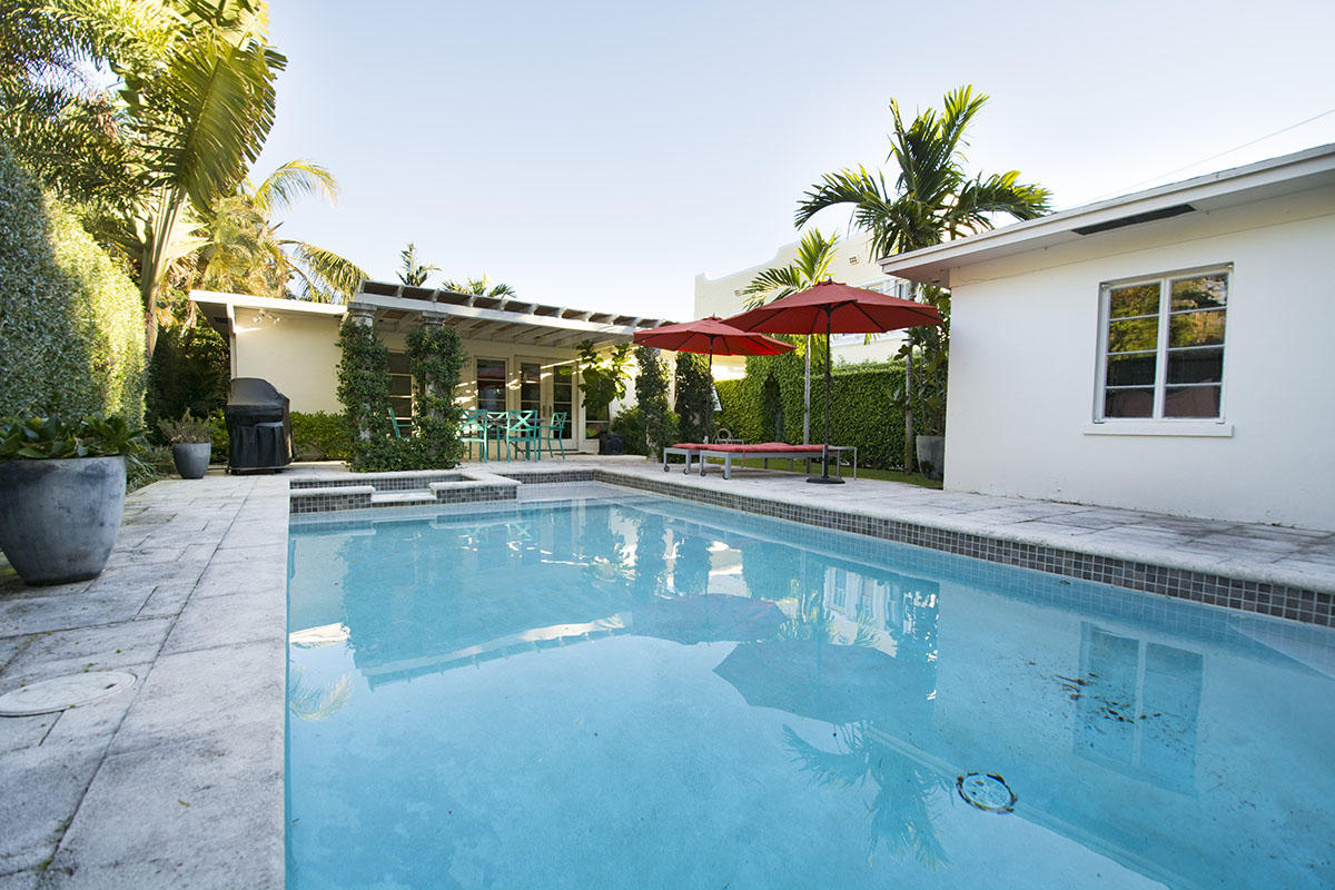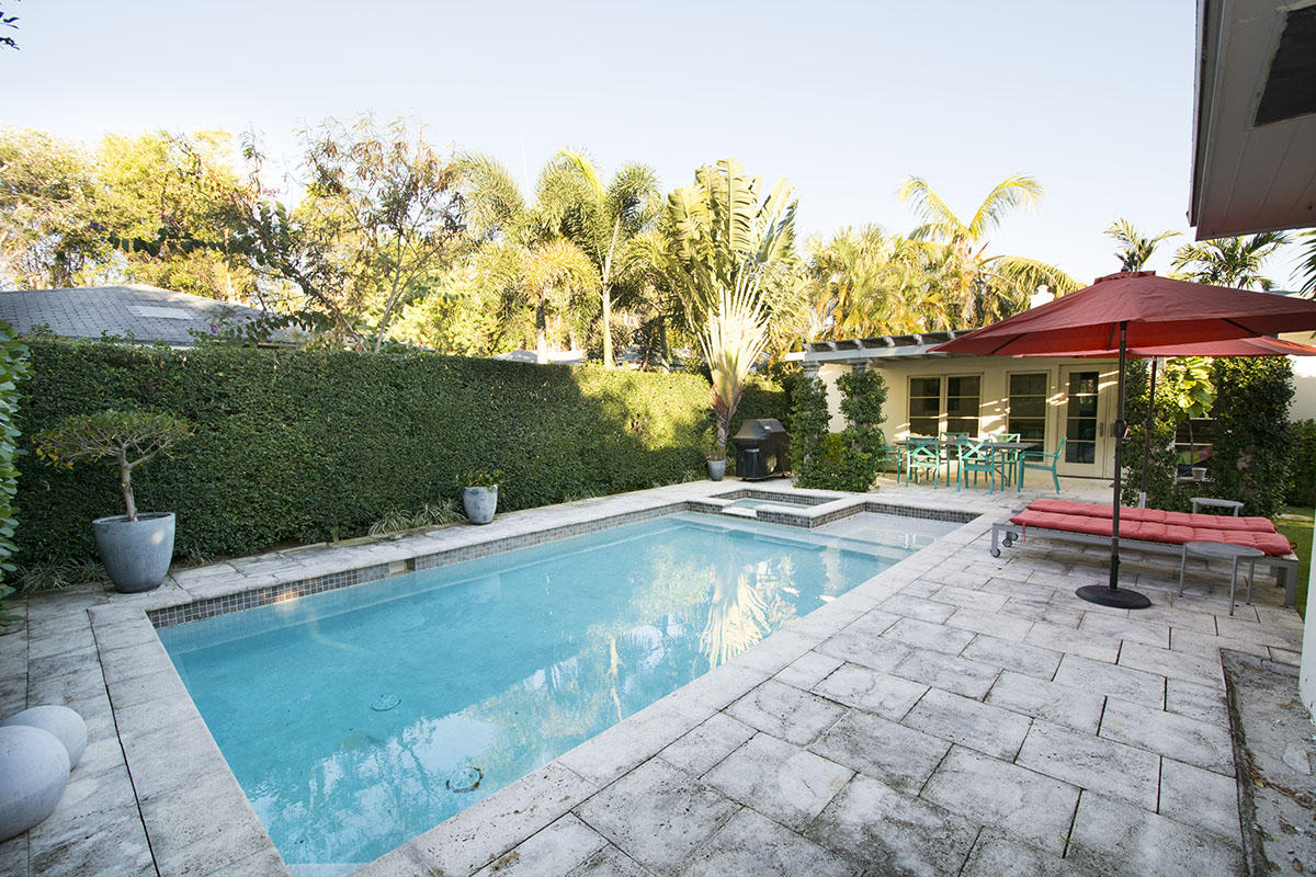 Located in Historic El Cid just one block from the Intracoastal Waterway this gorgeous Bermuda Style home offers two generous bedrooms, one and half renovated baths, a large living/dining with high ceilings, and a gourmet kitchen with marble counters and stainless steel appliances. A bright and light Florida/media room faces a sunny salt water heated pool with spa, southern exposure and large outdoor patio and covered pergola. This very private property is lushly landscaped with a detached 2 car garage with a landscaper's bath and laundry room. The property also has a very strong rental history.