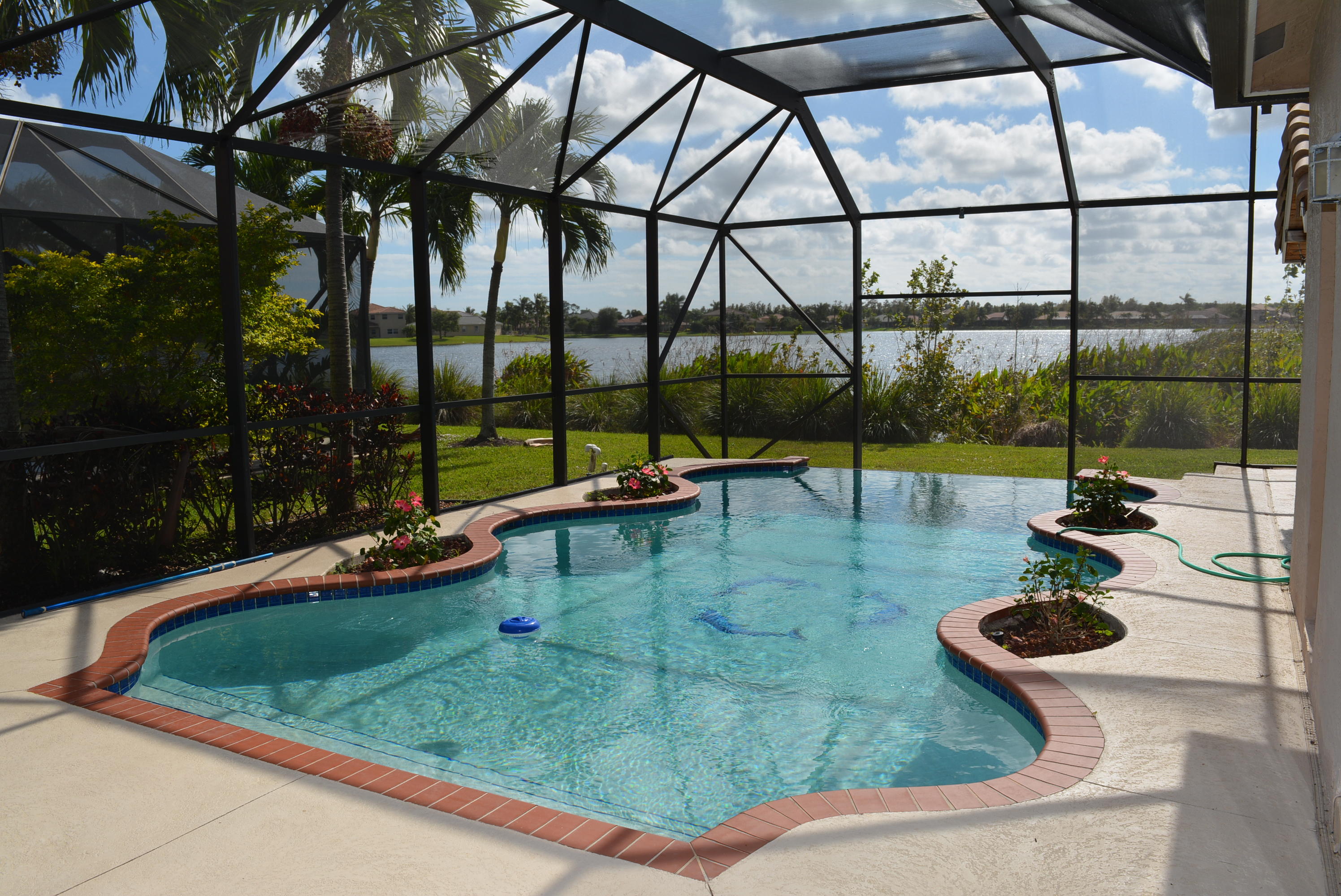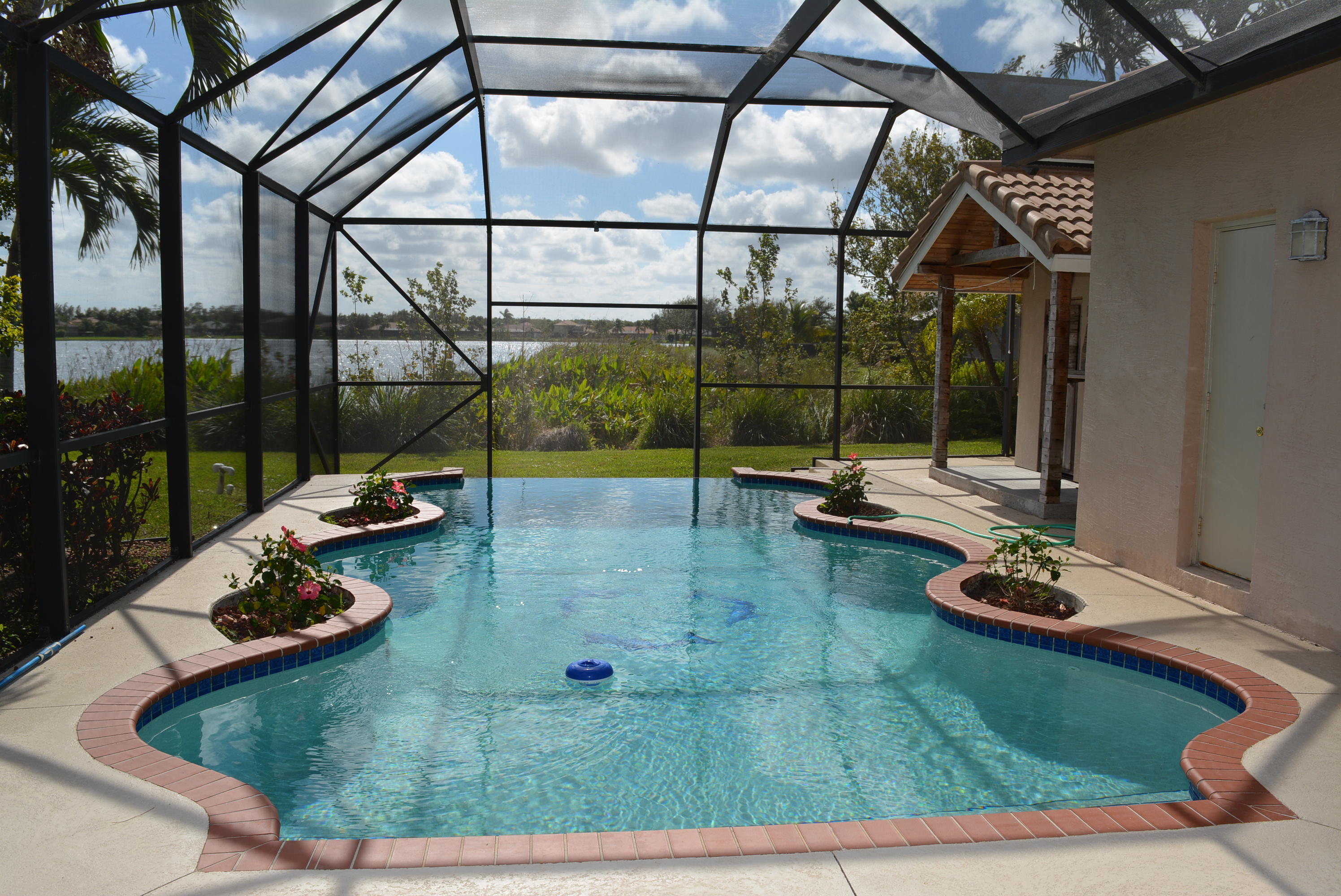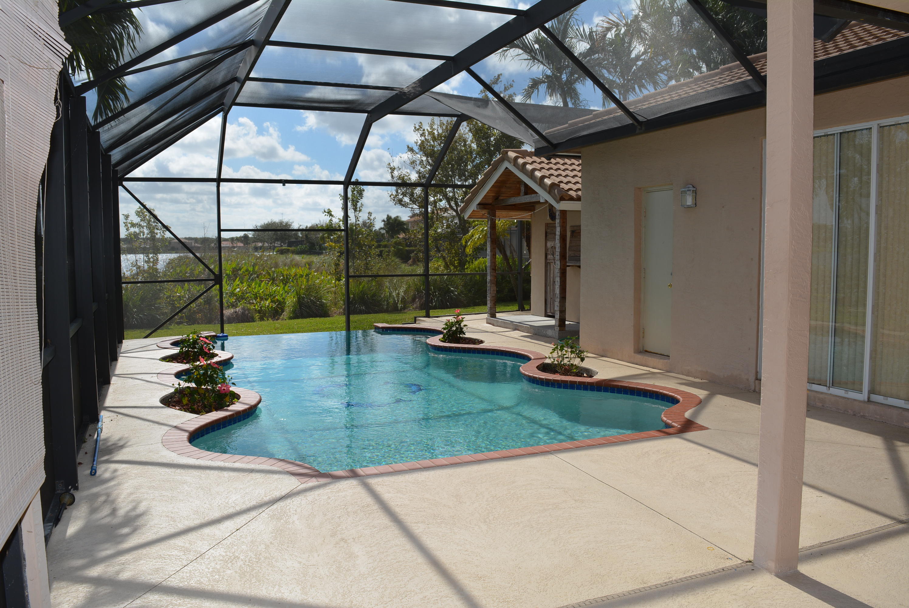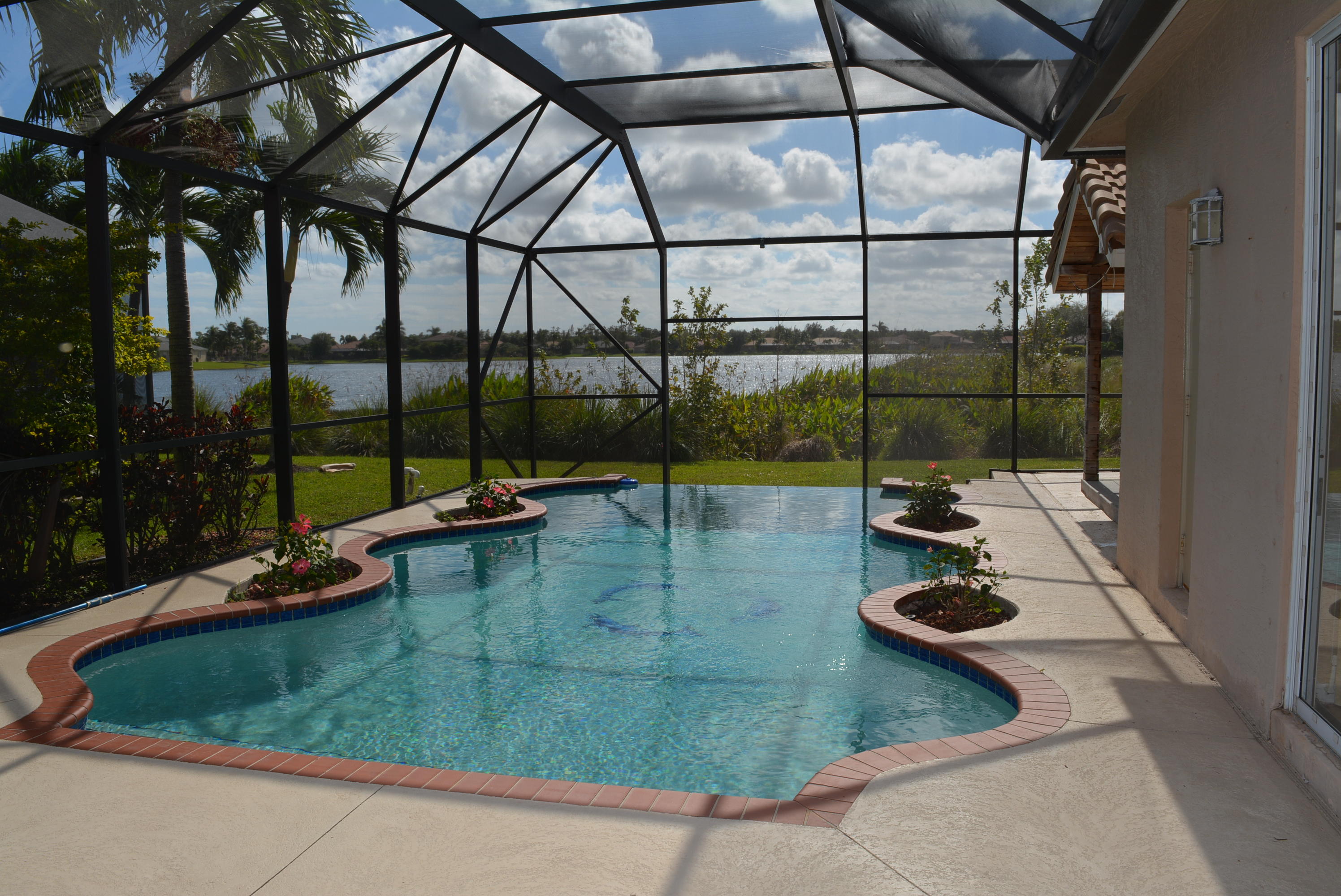 What a way to start your day! In this choice home in an amazing guard gated community. Very modern and open floor plan with four bedrooms, three full bathrooms, and three- way bedroom split plan, enjoy a stunning kitchen, with upgraded abundant wood cabinets, granite counters and black splashes with breakfast area over all looking a screened in pool and lakefront lot that create a portrait of peace. Your new home has 2376 sq ft under air with 4 generous sized bedroom and gorgeous master bathroom with custom double vanities, roman tub and oversized shower. Other features are, tile thru out living area, S tile roof, recessed lights, custom light fixtures, crown molding, custom detached Sauna, extra storage and community pool all centrally located on 441 just North of Forest Hill Blvd