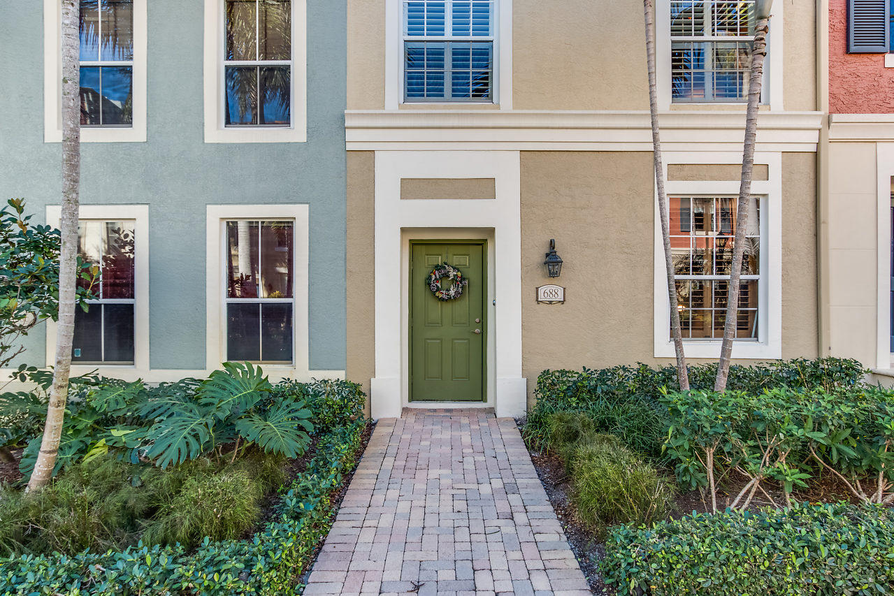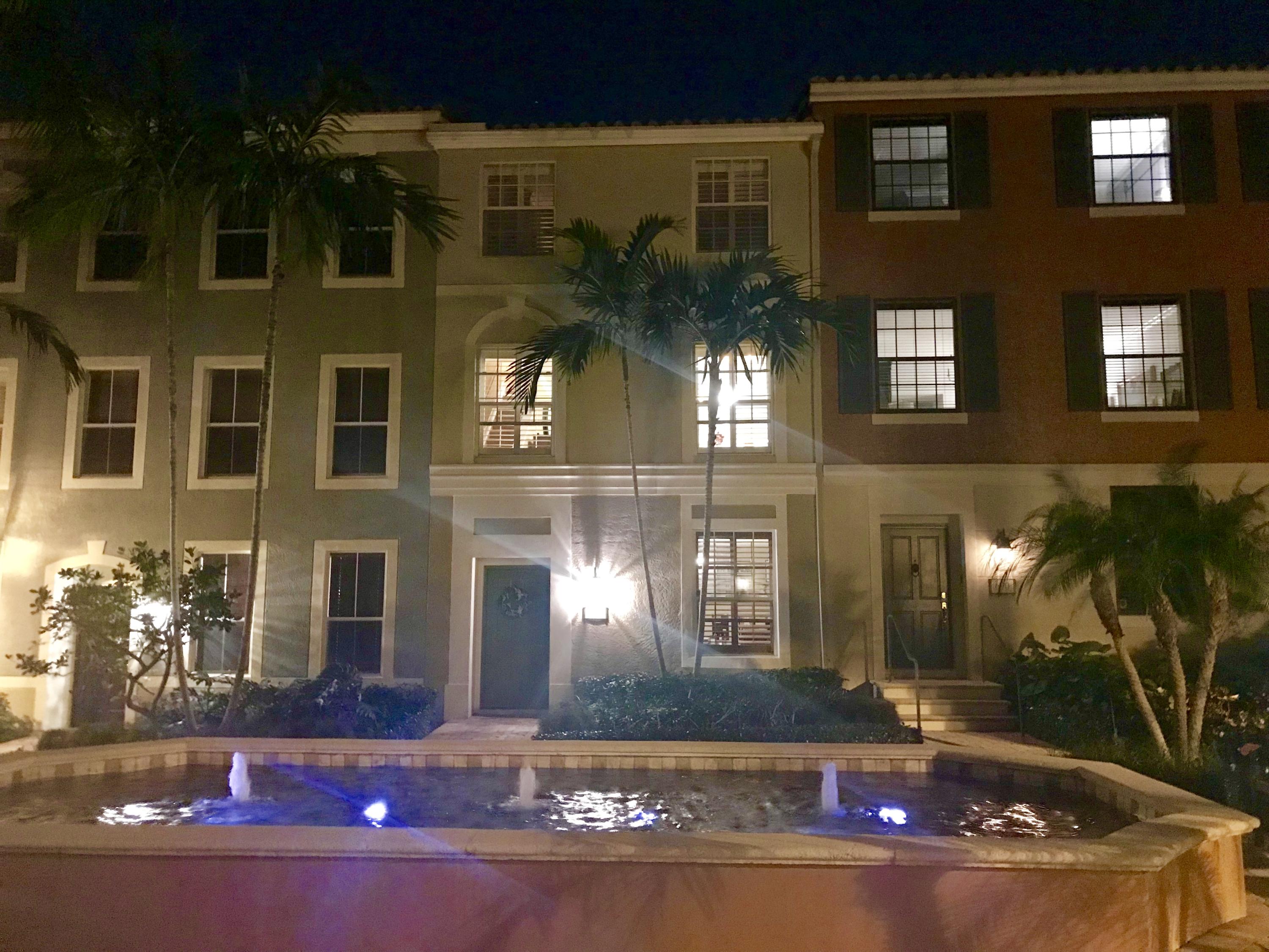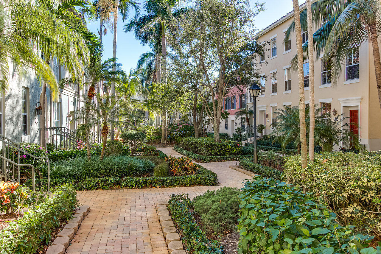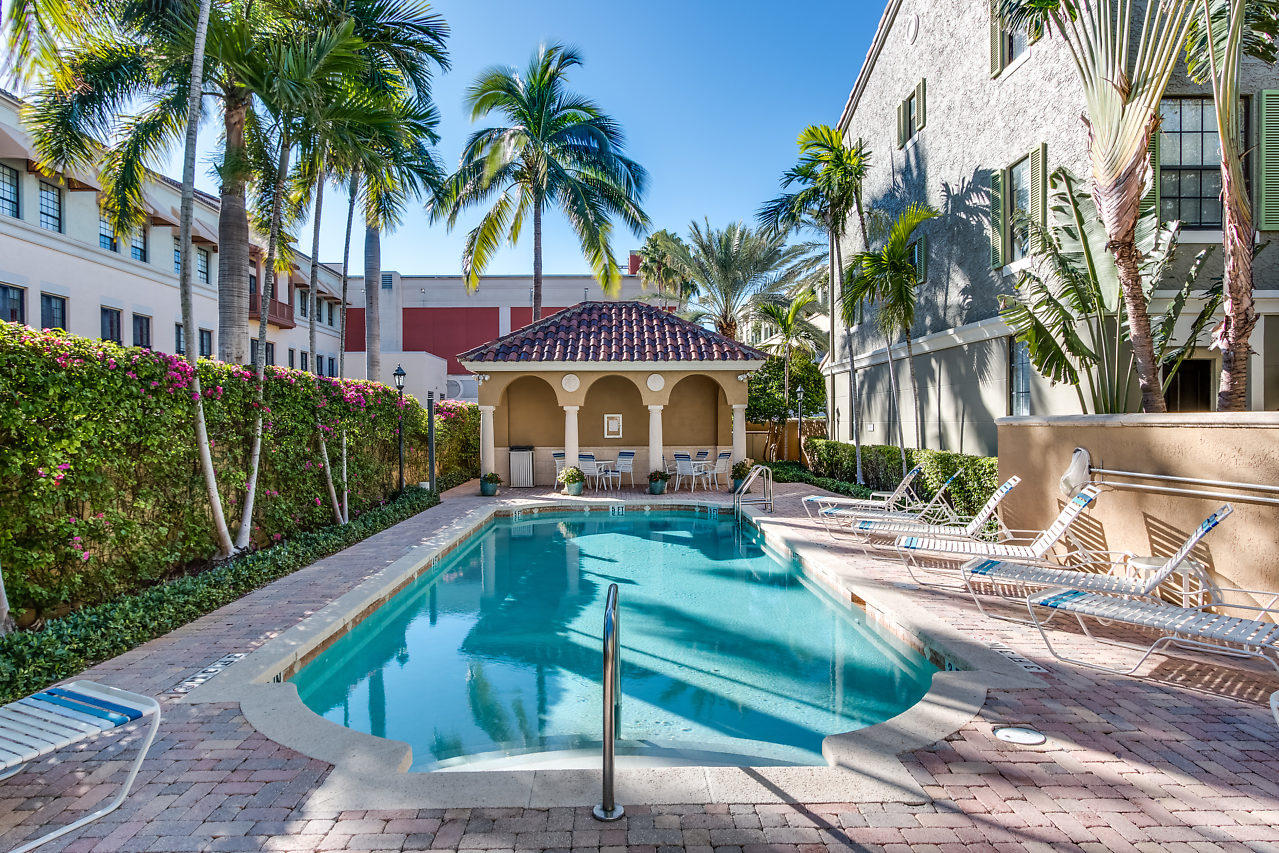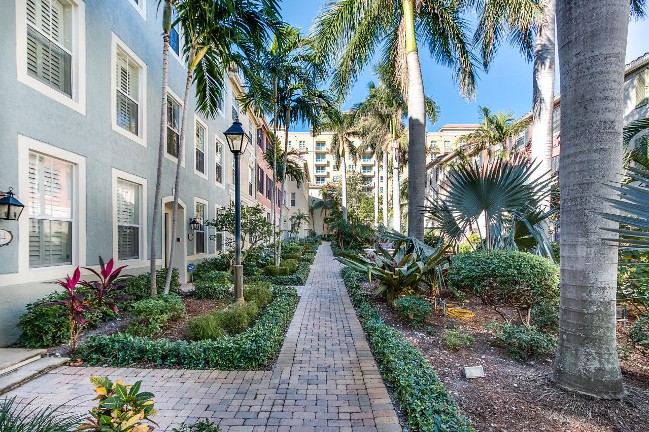 THE VERY BEST LOCATION in all CityPlace Residences! Located in the prestigious section of townhome residences in a private gated courtyard with beautiful landscaping,fountain & pool access. Conveniently located 1/2 blk to Publix, 2 blks to the New Brightline high speed train & a Free Trolley ride to Clematis, Flagler Dr,Northwood & outlet malls. This townhome has been upgraded with travertine marble in the first floor entryway, den/bedroom & 1/2 bath. The stairs to 2nd floor & living room have Brazilian Tiger Wood flooring. The dining area has chair railing & a tray ceiling. Custom kitchen pantry & stackable front load washer/dryer with opaque glass & wood doors. Great color palette. The unique floor plan has an en suite bath both master & guest bedroom . Custom built book case in master.