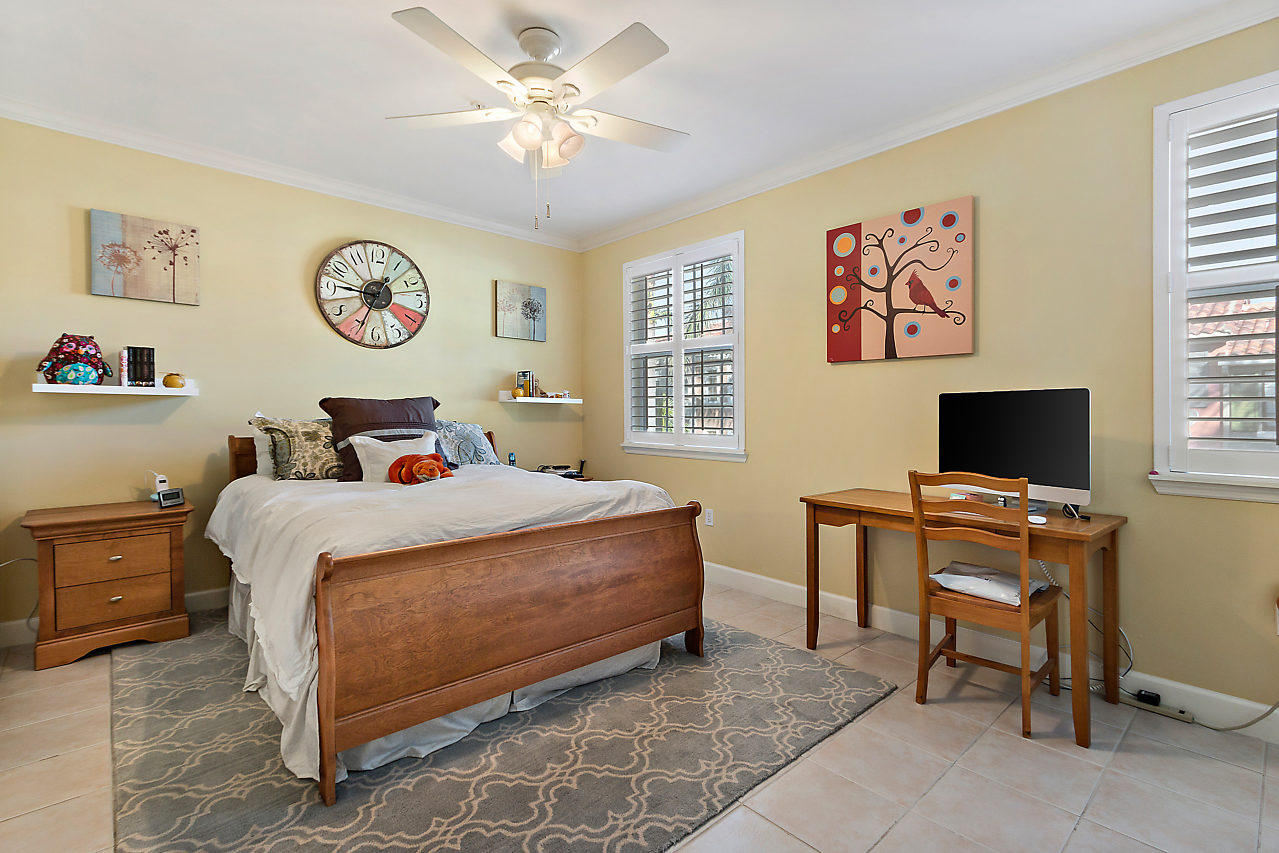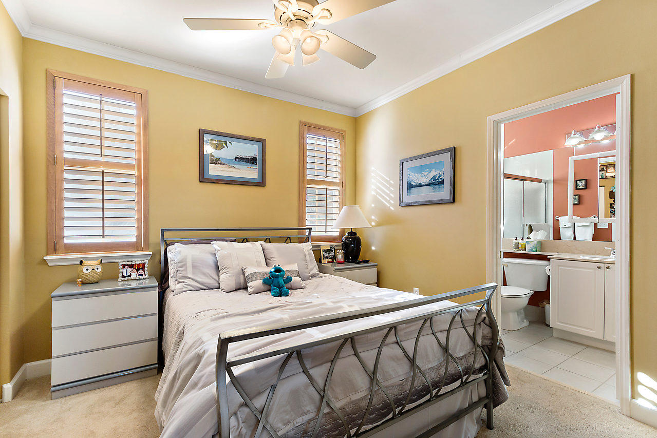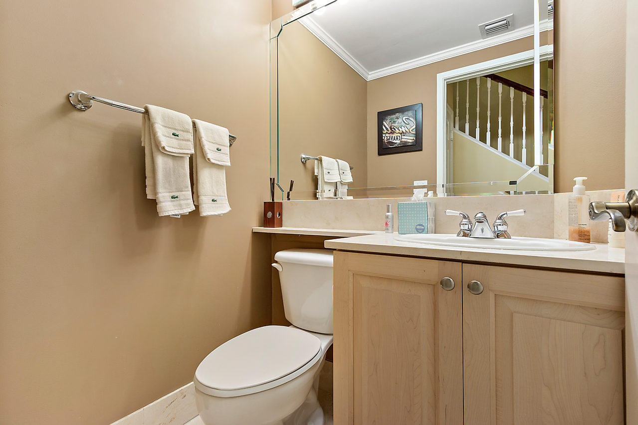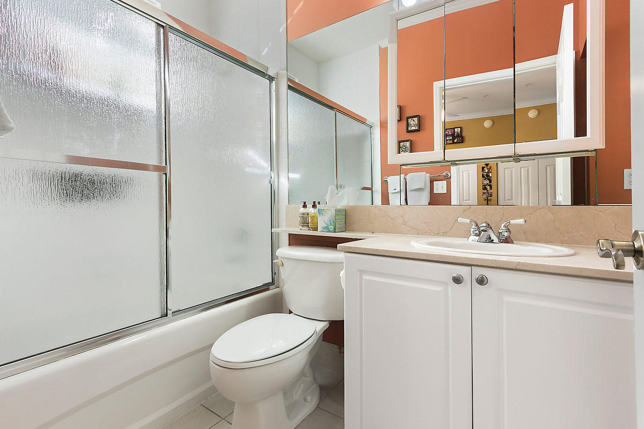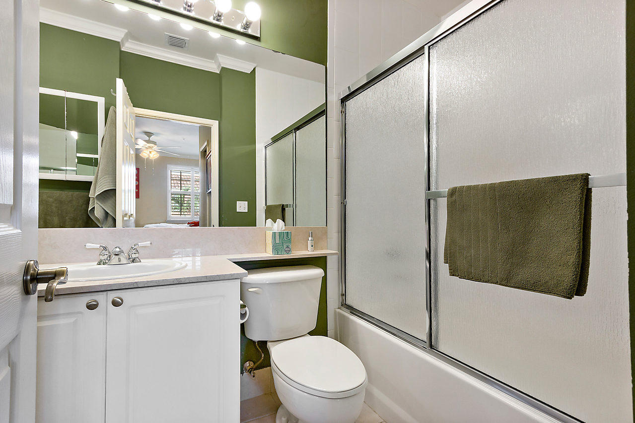 THE VERY BEST LOCATION in all CityPlace Residences! Located in the prestigious section of townhome residences in a private gated courtyard with beautiful landscaping,fountain & pool access. Conveniently located 1/2 blk to Publix, 2 blks to the New Brightline high speed train & a Free Trolley ride to Clematis, Flagler Dr,Northwood & outlet malls. This townhome has been upgraded with travertine marble in the first floor entryway, den/bedroom & 1/2 bath. The stairs to 2nd floor & living room have Brazilian Tiger Wood flooring. The dining area has chair railing & a tray ceiling. Custom kitchen pantry & stackable front load washer/dryer with opaque glass & wood doors. Great color palette. The unique floor plan has an en suite bath both master & guest bedroom . Custom built book case in master.
