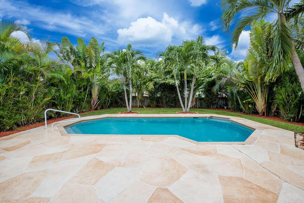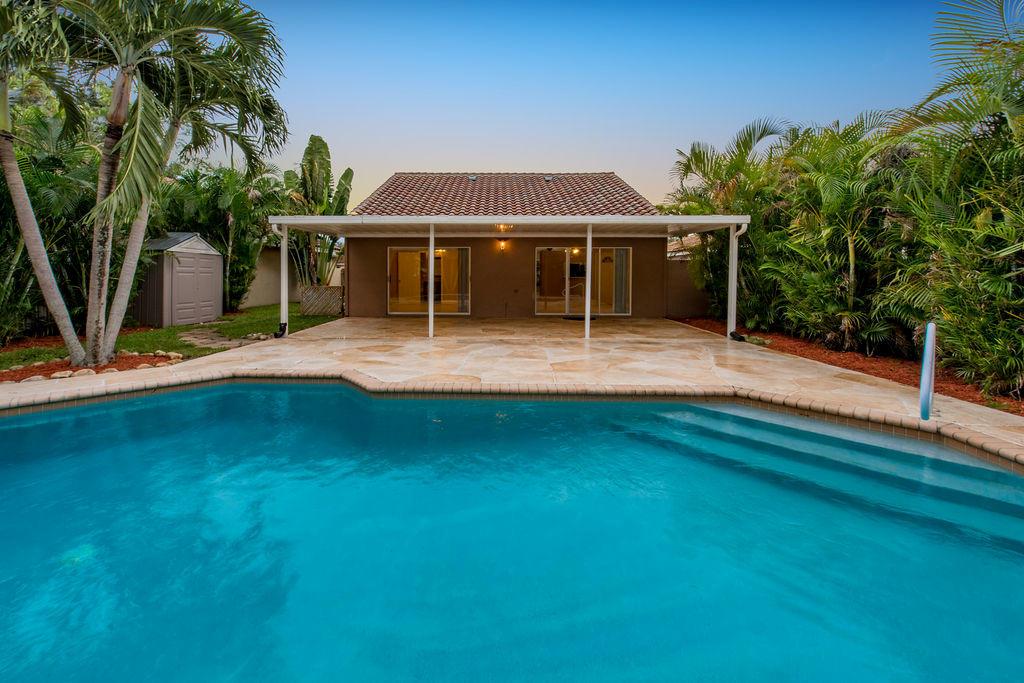 Beautiful 3 bed, 2 bath, 2 car garage pool home with 20x20 imported Italian porcelain tile throughout! Gated community with very reasonable HOA + additional community pool. This rare model single family home features a gorgeous tropical backyard including free-form resort style pool with stamped concrete deck and a mature palm tree hedge. Family friendly neighborhood in an ''A'' rated school zone from elementary through high school. This home features a new high efficiency a/c and appliances. Fresh paint and move in ready condition! Light and bright colors throughout, prime location and priced well below market value. Hurry! This will go fast.