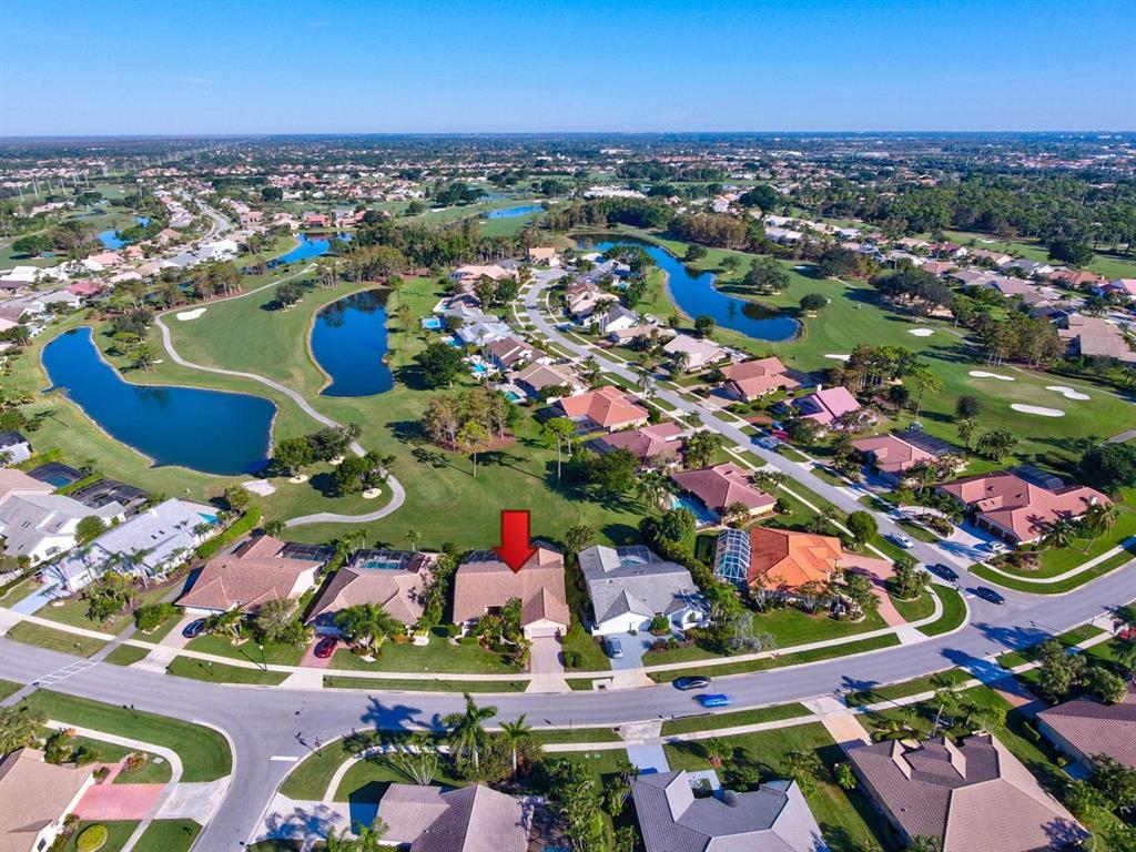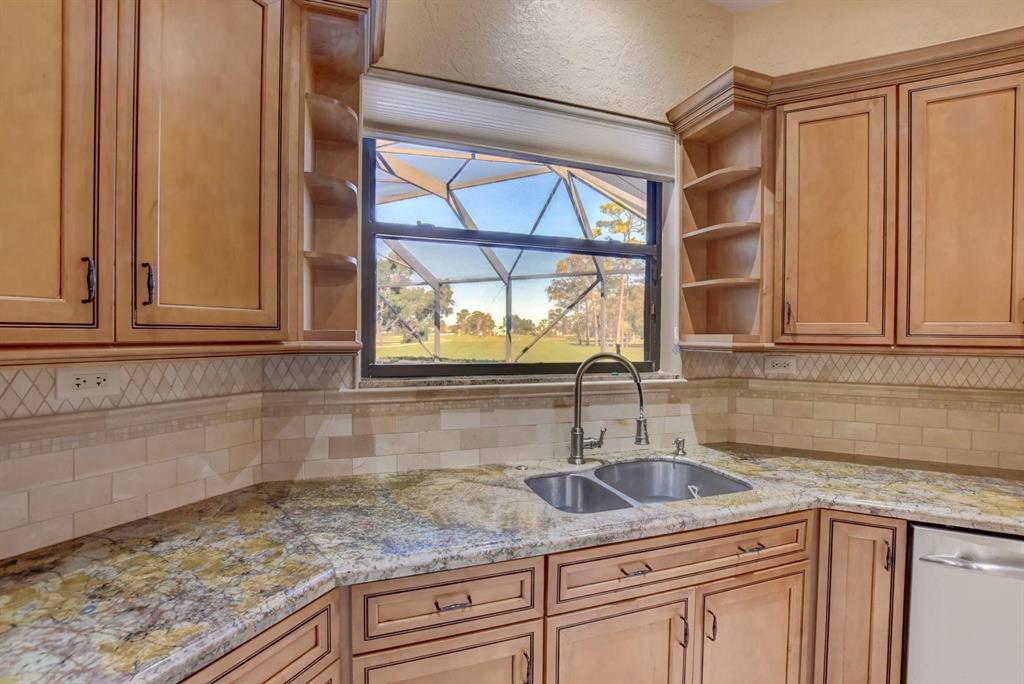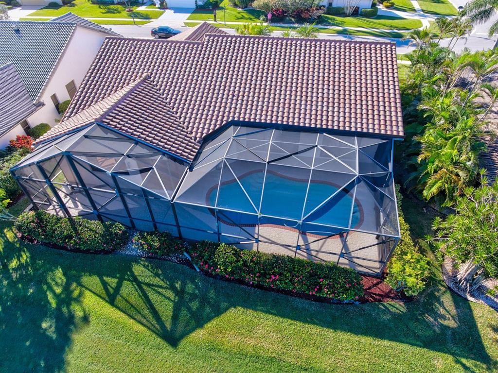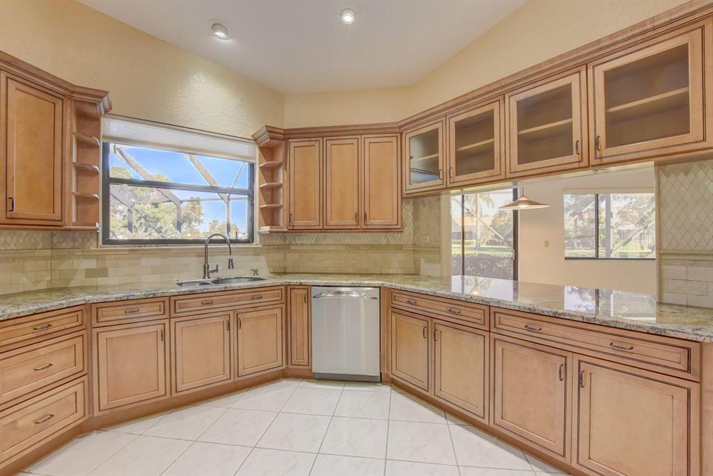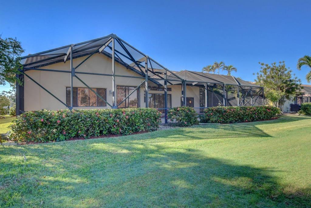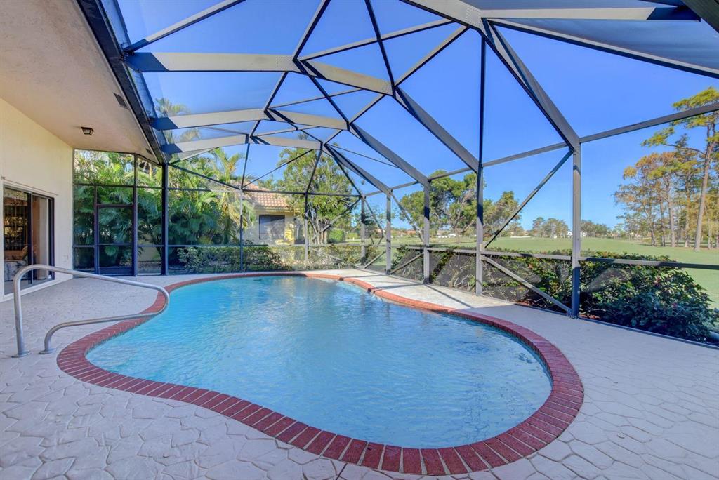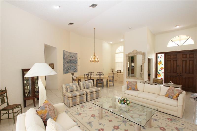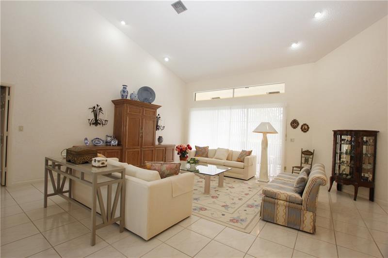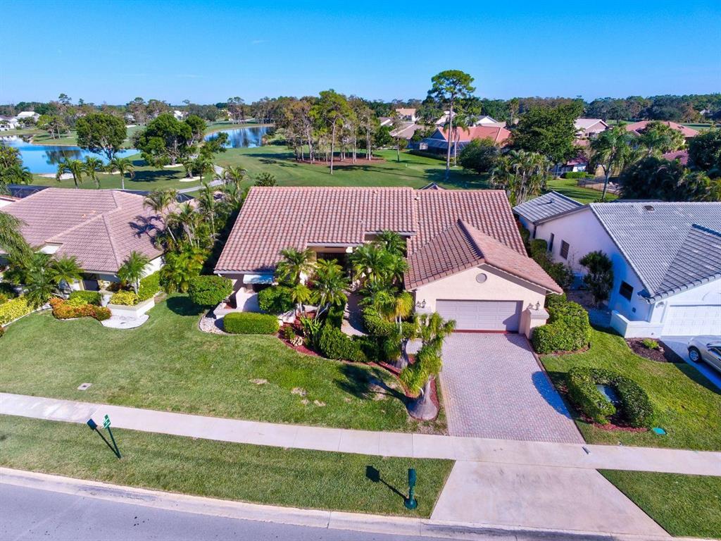 immaculate 3/2.5 bath residence!! serene golf and water views from all main areas of the home.Formal living room + large family room The home's features include a great room with raised ceilings, high windows and sliding glass doors. A newly updated spacious wood kitchen with granite countertops and stainless appliances flows into the large family room.Sliders open the family room to the pool area and terrace. The split-bedroom plan offers privacy to the large master bedroom suite which has high ceilings, his & her walk-in closets and connecting master bath with separate area for toilet and bidet. The screened-in pool has a bonus patio area. Tile floors run throughout the living areas with one wood floor bedroom. Oversized 2 car garage has space for your golf cart as well! plus an office