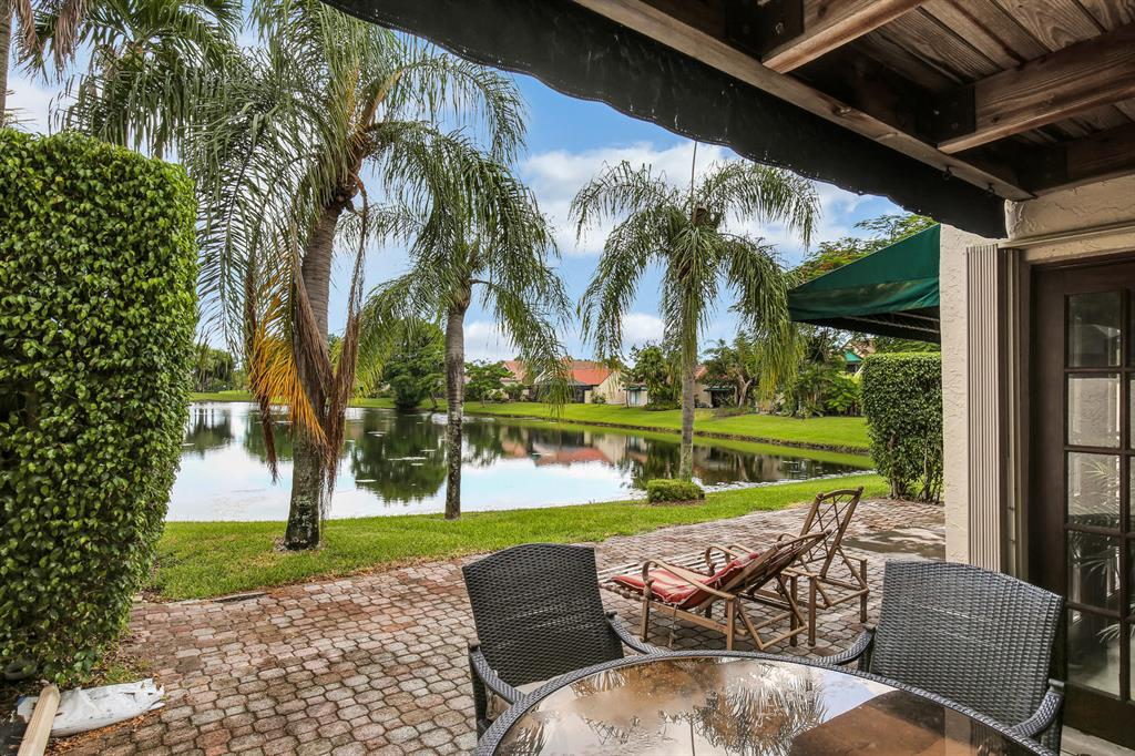 A beautiful and relaxing place to call home. This is a lakefront semi-attached town home in central Boca Raton that offers 3 bedrooms, 2 baths, and a 1-car garage. The gorgeous high volume wood ceilings and french doors leading to the stunning views of the widest part of the lake add to the spacious airy feel (over 2300 sq ft). The kitchen with eat in nook has been beautifully renovated and is open to the living space, bathrooms are updated, washer and dryer are inside and there is a covered outdoor living space to enjoy the view of the lake. The master suite is on the second level and has loads of organized closet space with separate bath and shower. Neutral large travertine floors in the living space which adds to the California feel of the home. You can even walk to town center!