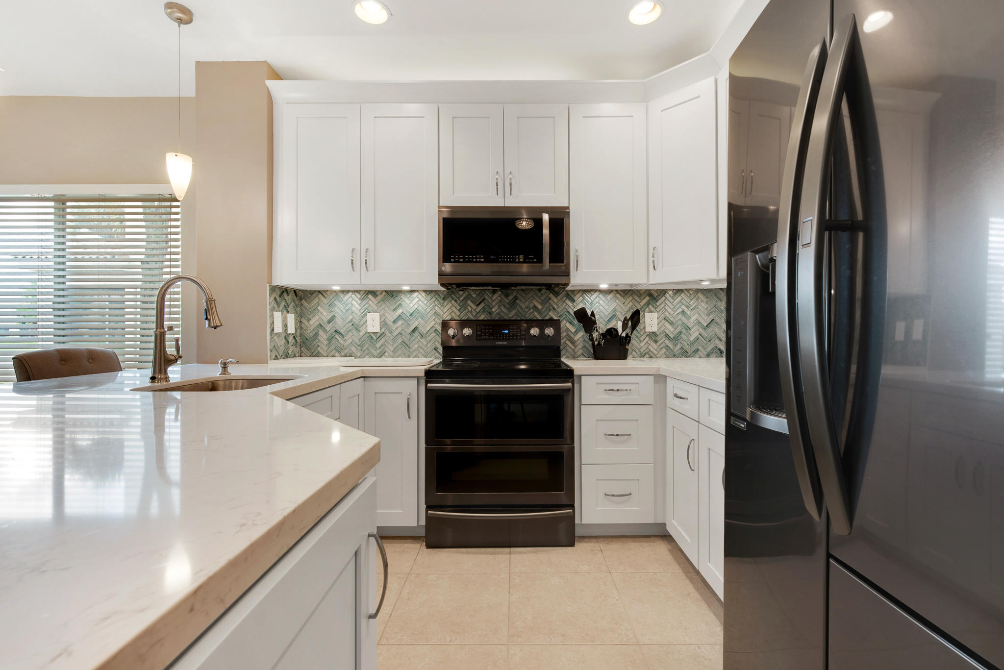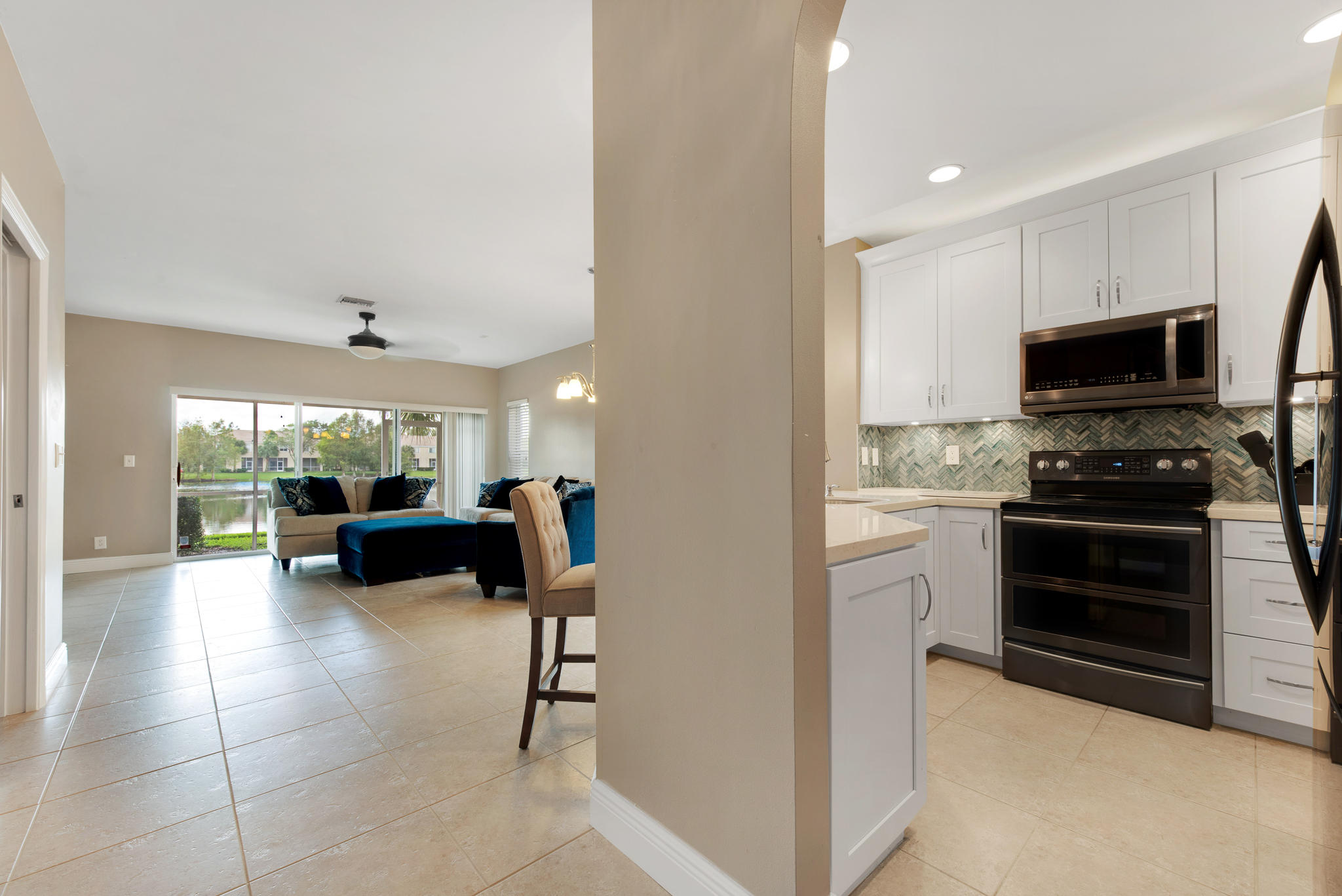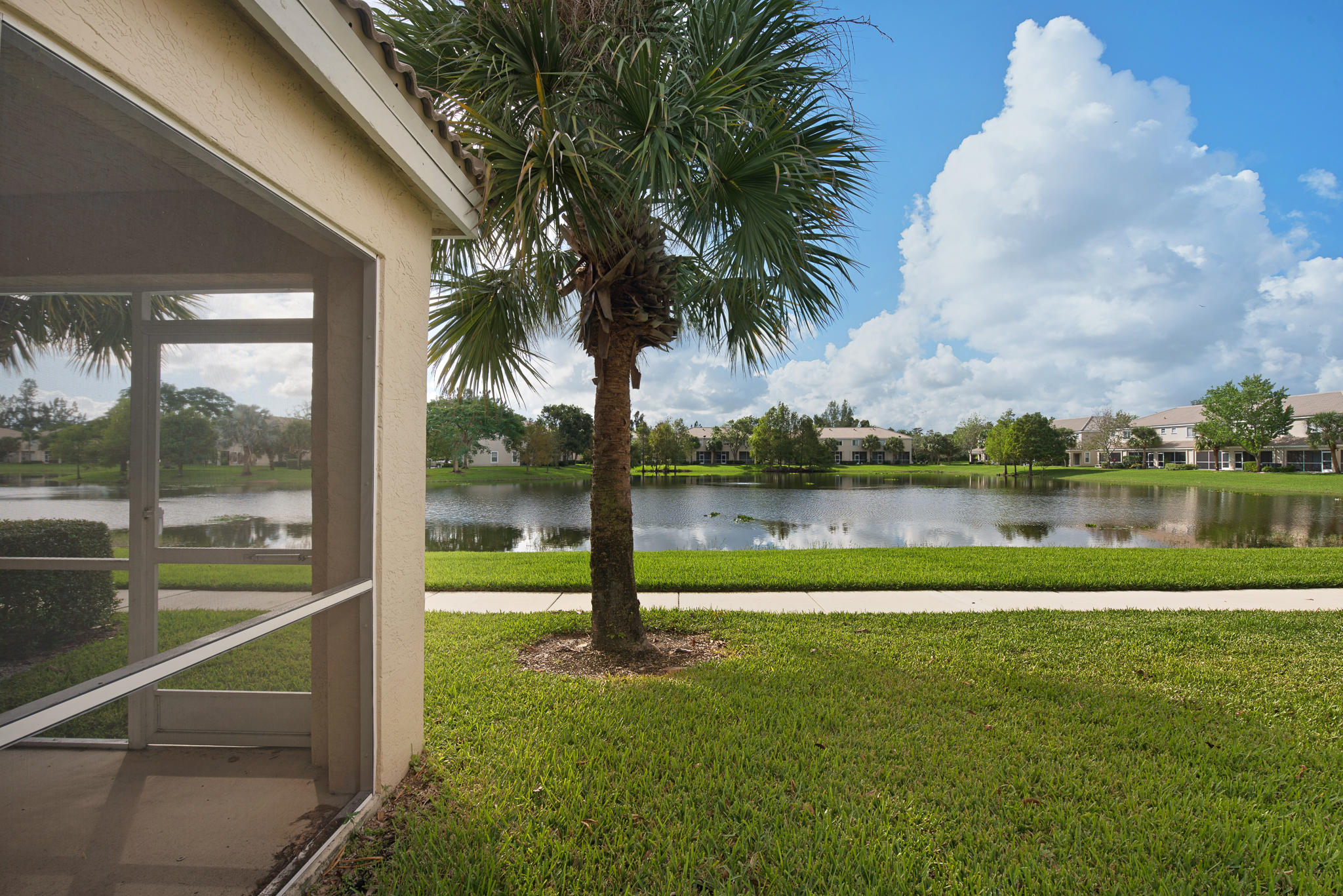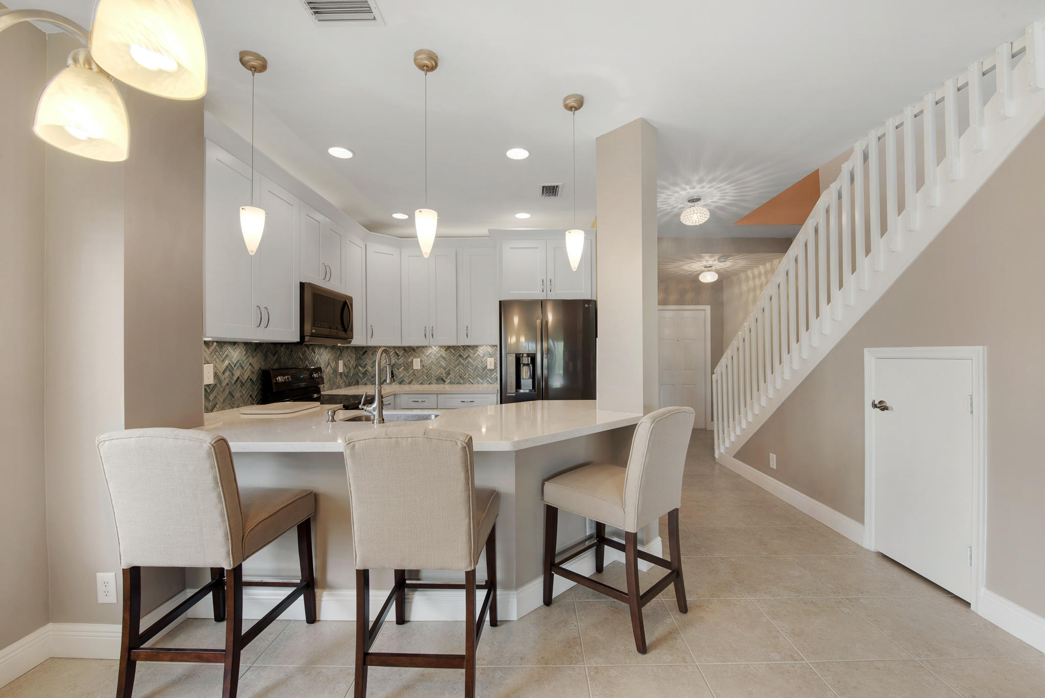 Move right in! Immaculate 2 bedroom 2.5 bath, 1 car garage with gorgeous lake views in gated community. Screened covered patio overlooks expansive lake. Neutral tile flooring throughout first floor, wood look tile on second floor. Custom kitchen features 42 inch white cabinetry, recessed and pendant lighting, breakfast bar, quartz countertops with stainless steel undermount sink, glass tile backsplash, a full compliment of updated appliances including double oven range and updated fixtures. Convenient first floor powder room with pedestal sink and custom shelving. Dining area has chandelier lighting. Family room has ceiling fan with lighting and sliders to screened, covered patio. All bedrooms have ceiling fans with lighting.