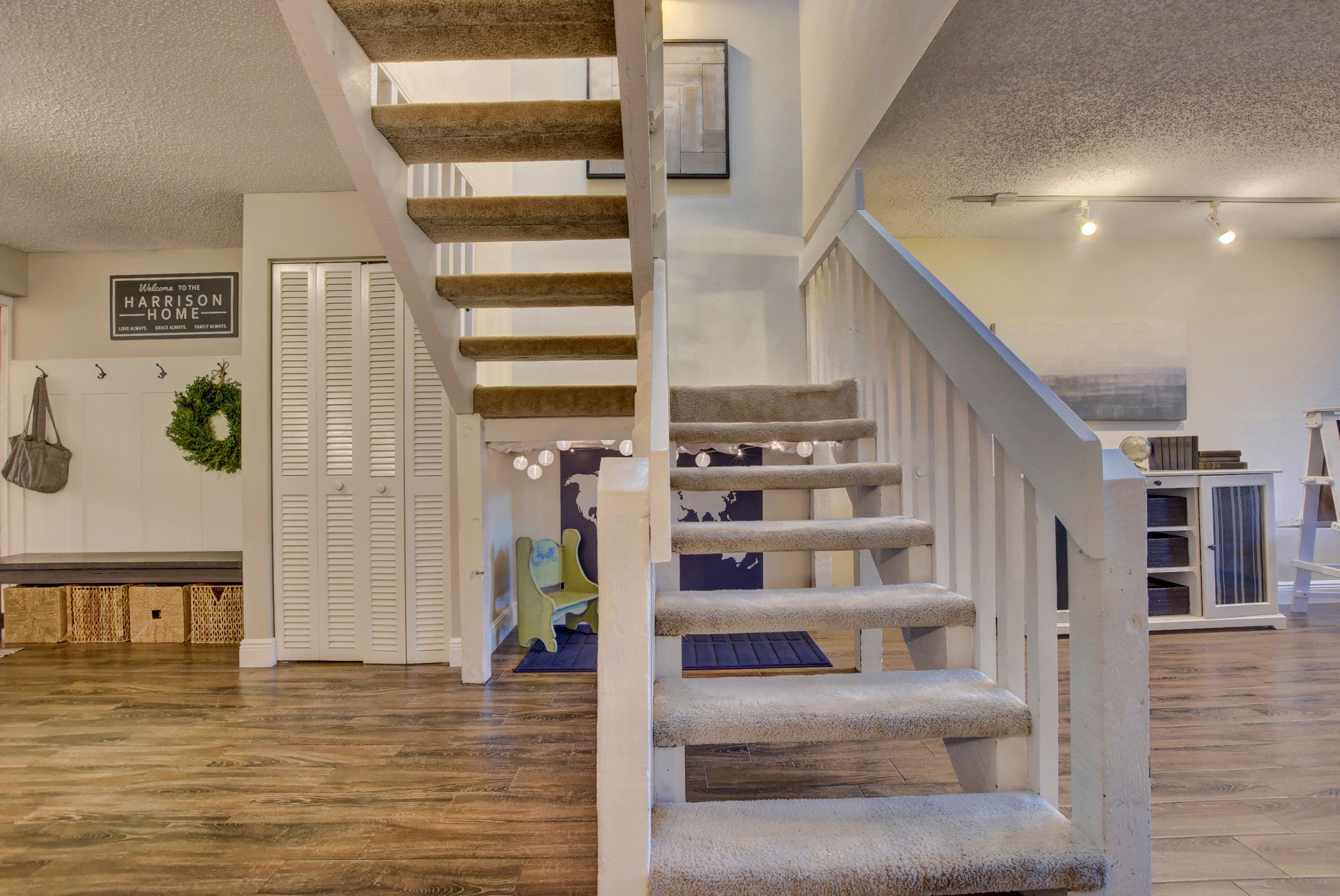 Spacious lakefront townhome with brand new granite countertops and tile backsplash in the kitchen, custom wood countertop on kitchen island, wood-look tile floor throughout downstairs living area and in upstairs bathrooms, adjustable custom closet systems in upstairs bedrooms, updated half bath downstairs, updated fireplace with custom built-in storage, expansive attic space, and lush landscaping in the backyard.